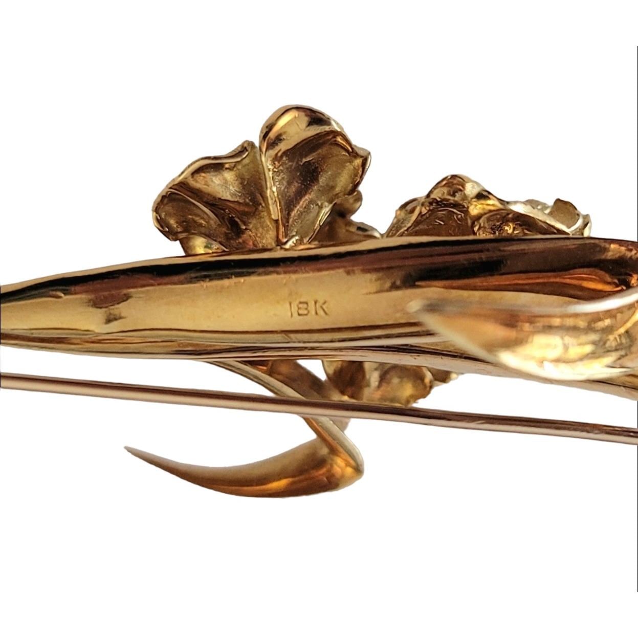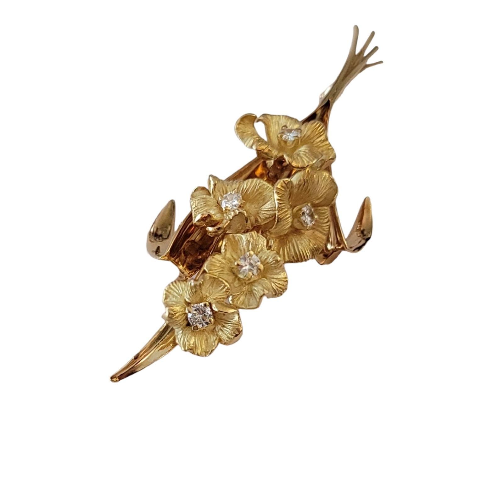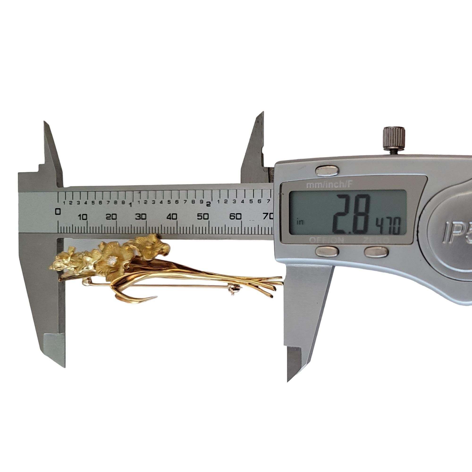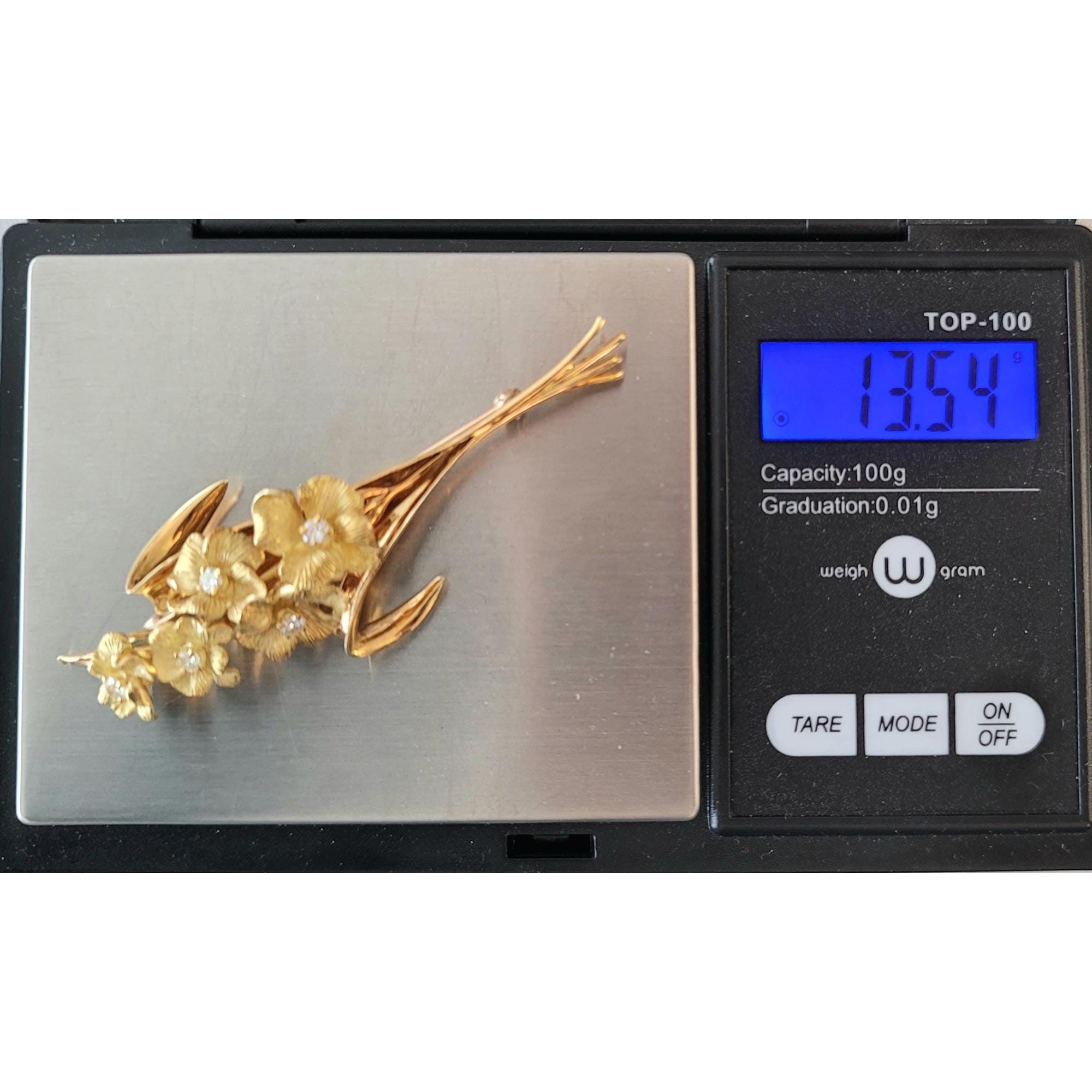 This 2.84-inch stunning brooch is a true masterpiece of artistry and skill. Handcrafted from the finest 18k yellow gold, it boasts an exquisite design that showcases a beautiful bouquet of flowers and leaves in full bloom. The expertly rendered floral elements are detailed and lifelike, and the bouquet is adorned with glittering diamonds that are perfectly set, ensuring that they catch the light beautifully from every angle, creating a dazzling display of brilliance. Weighing in at 13.54 grams, this brooch is substantial in weight, yet delicate and refined in appearance.