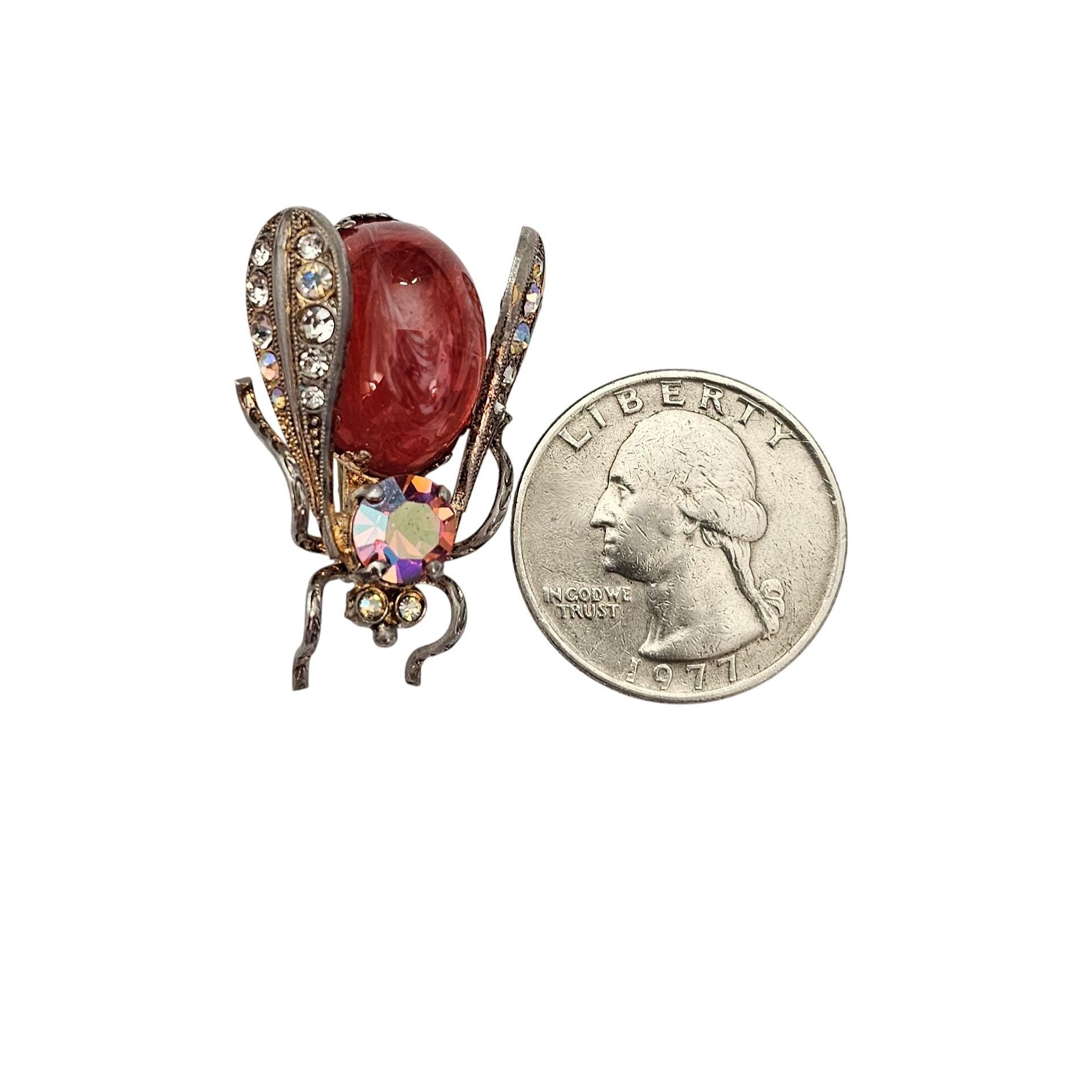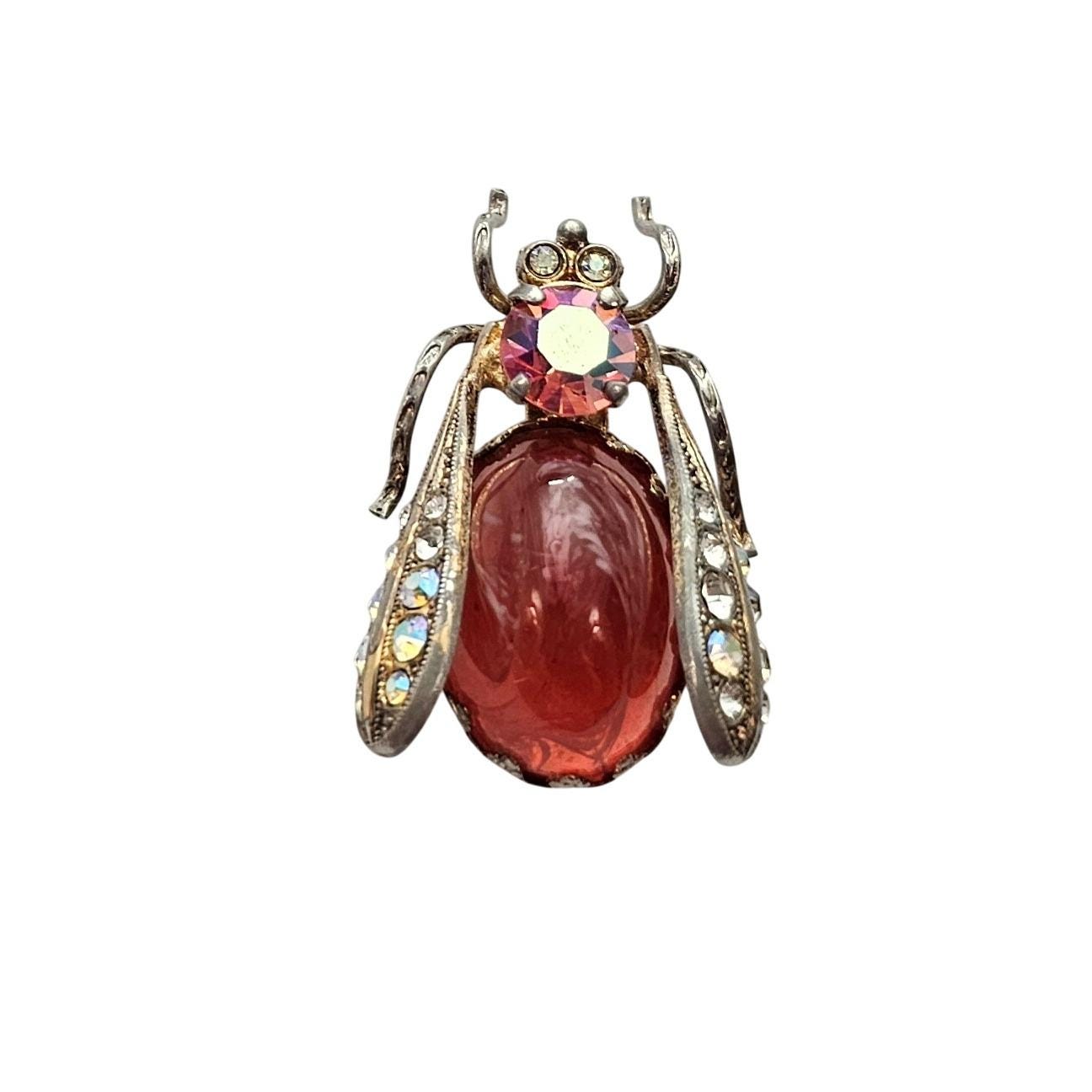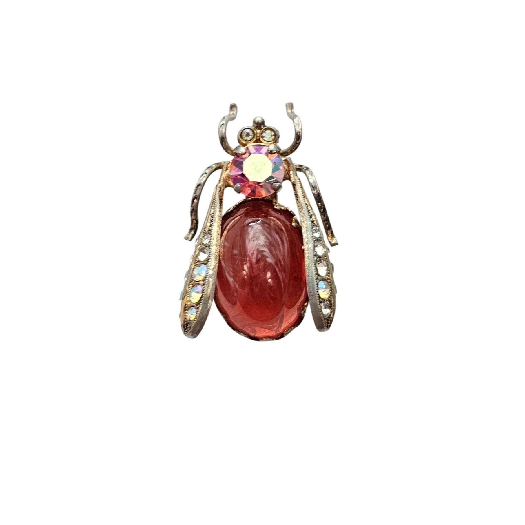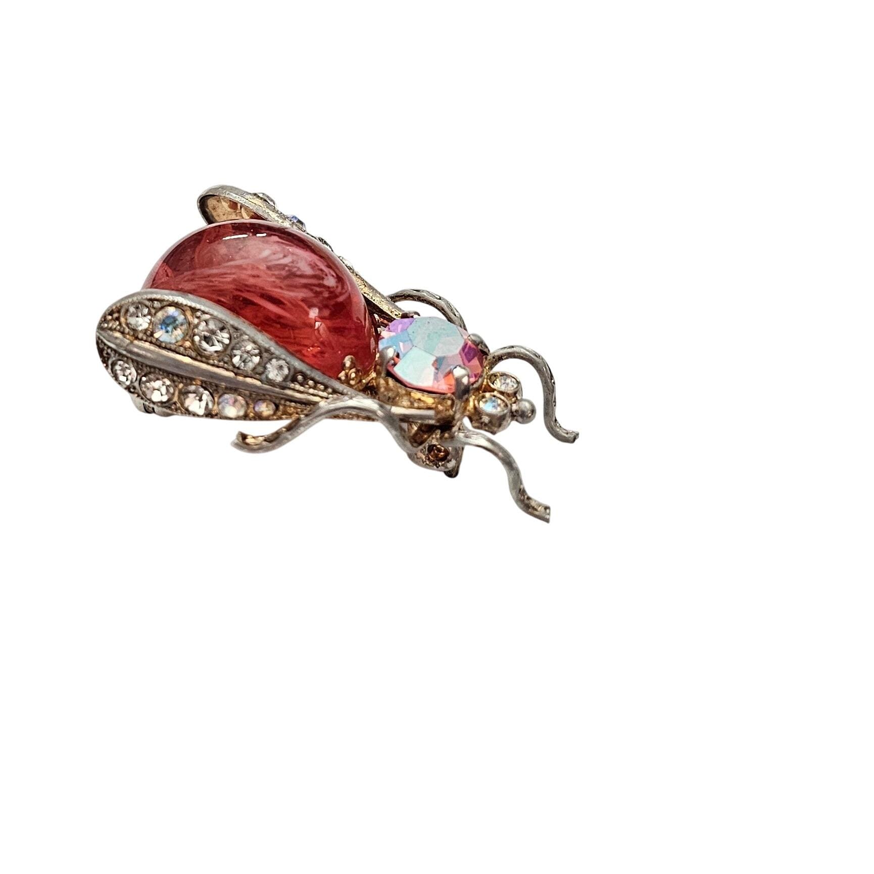 Flawed Domed Pink Glass Bug Brooch AB Rhinestone Austria Pin C658