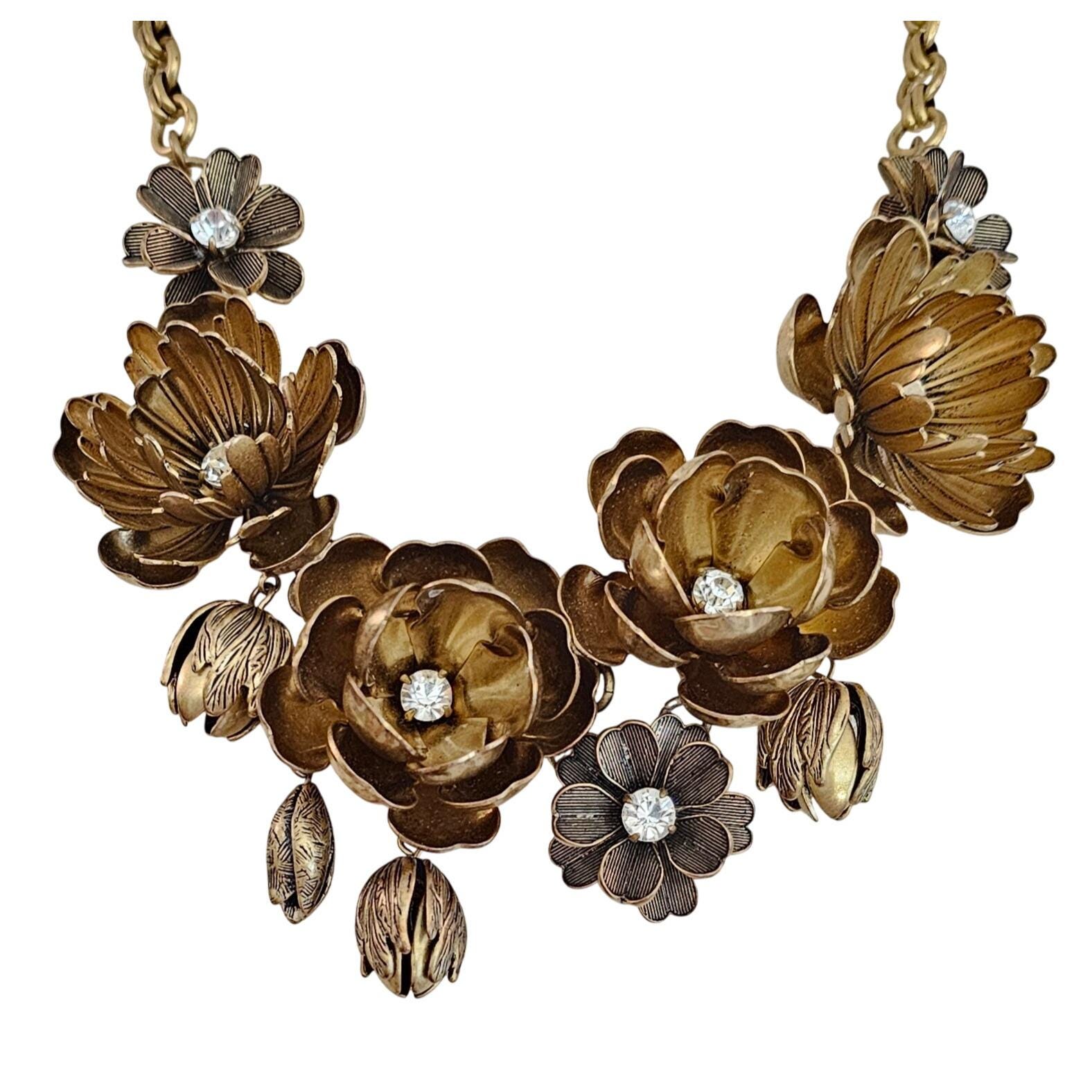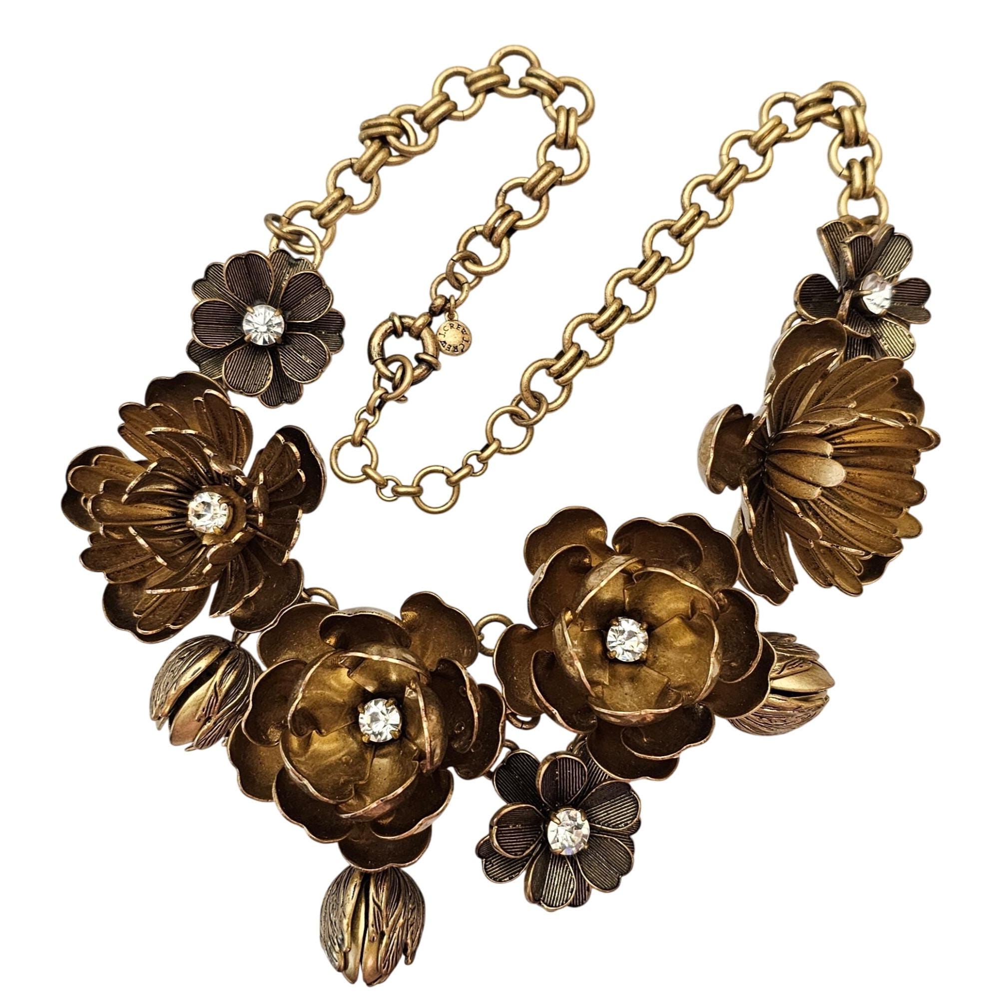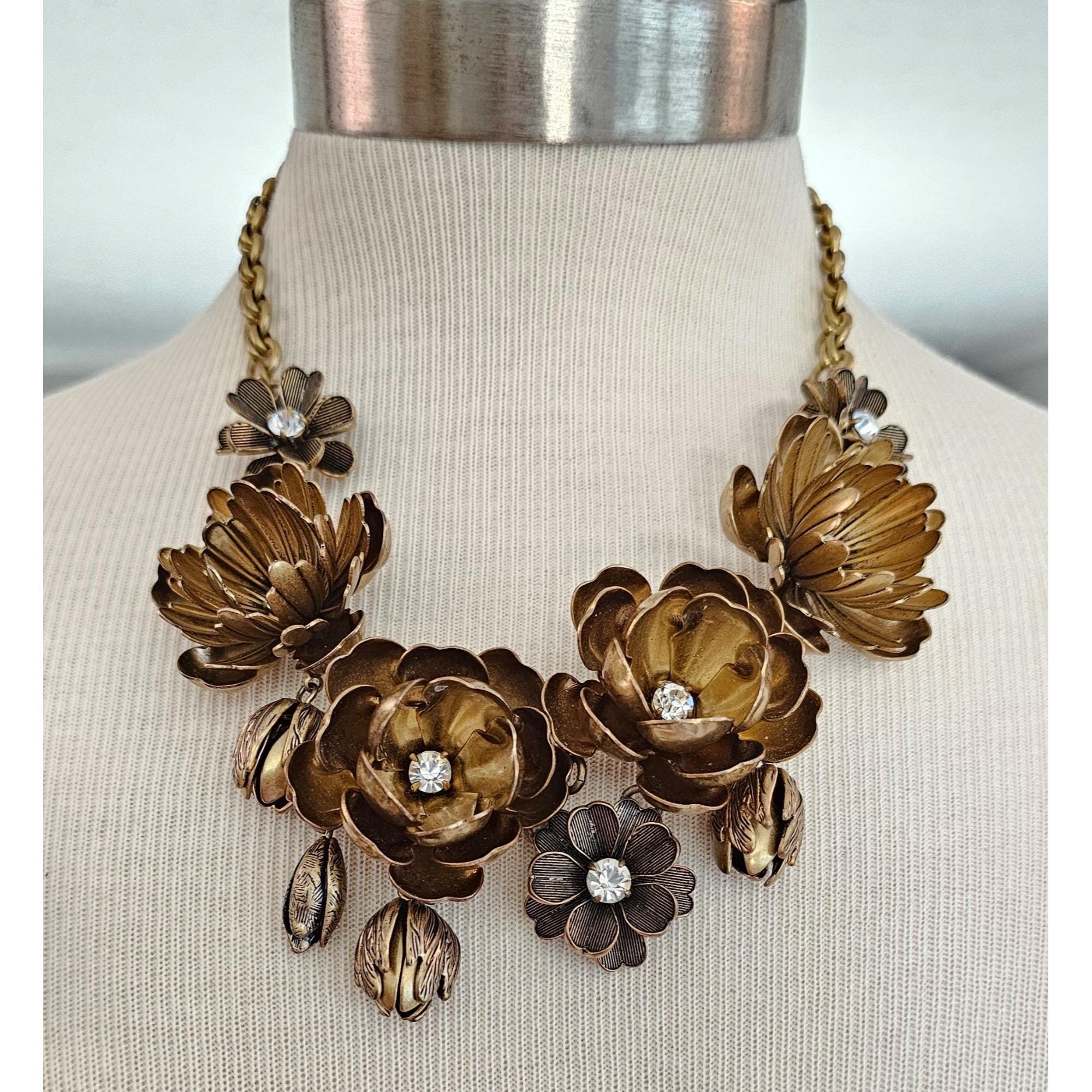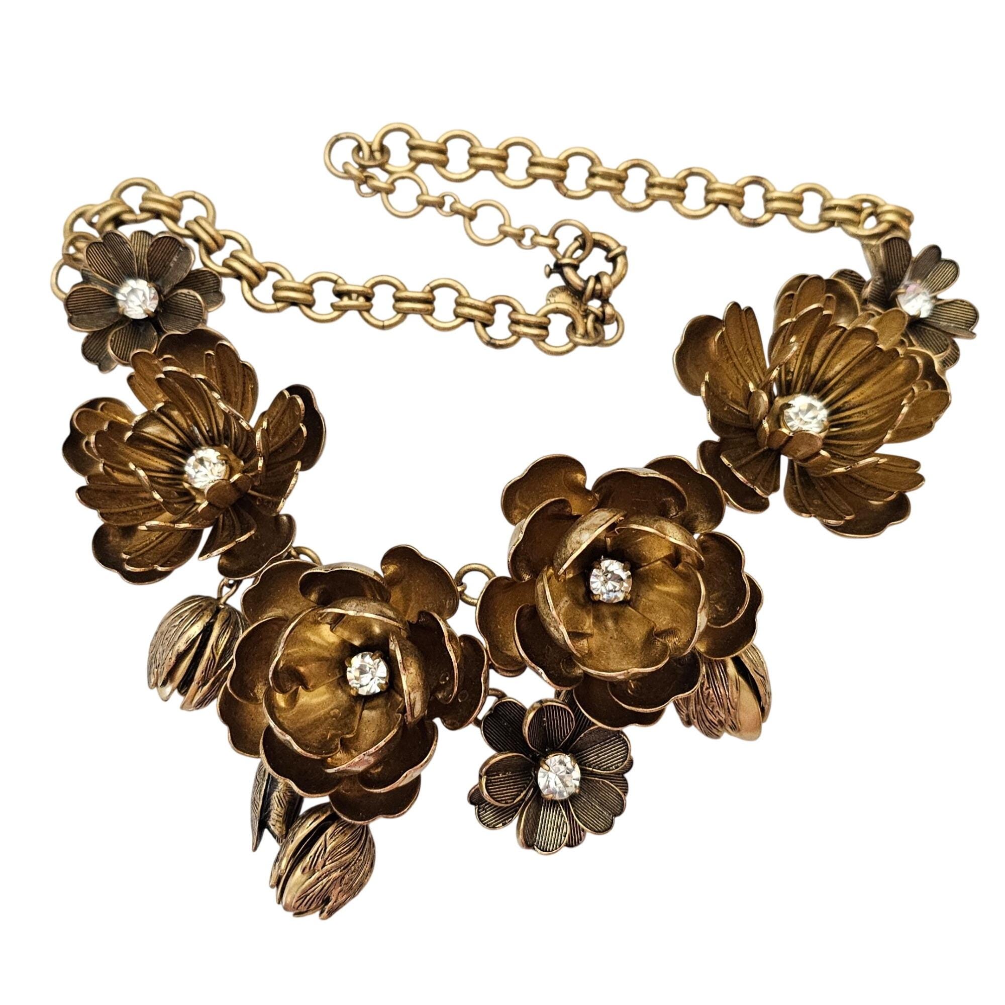J Crew Brass Poppy Tulip Bud Ornate Necklace Clear Rhinestones C637