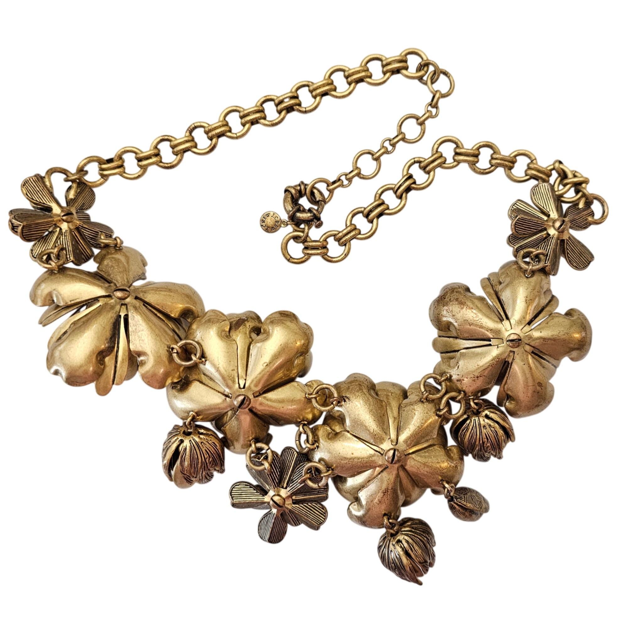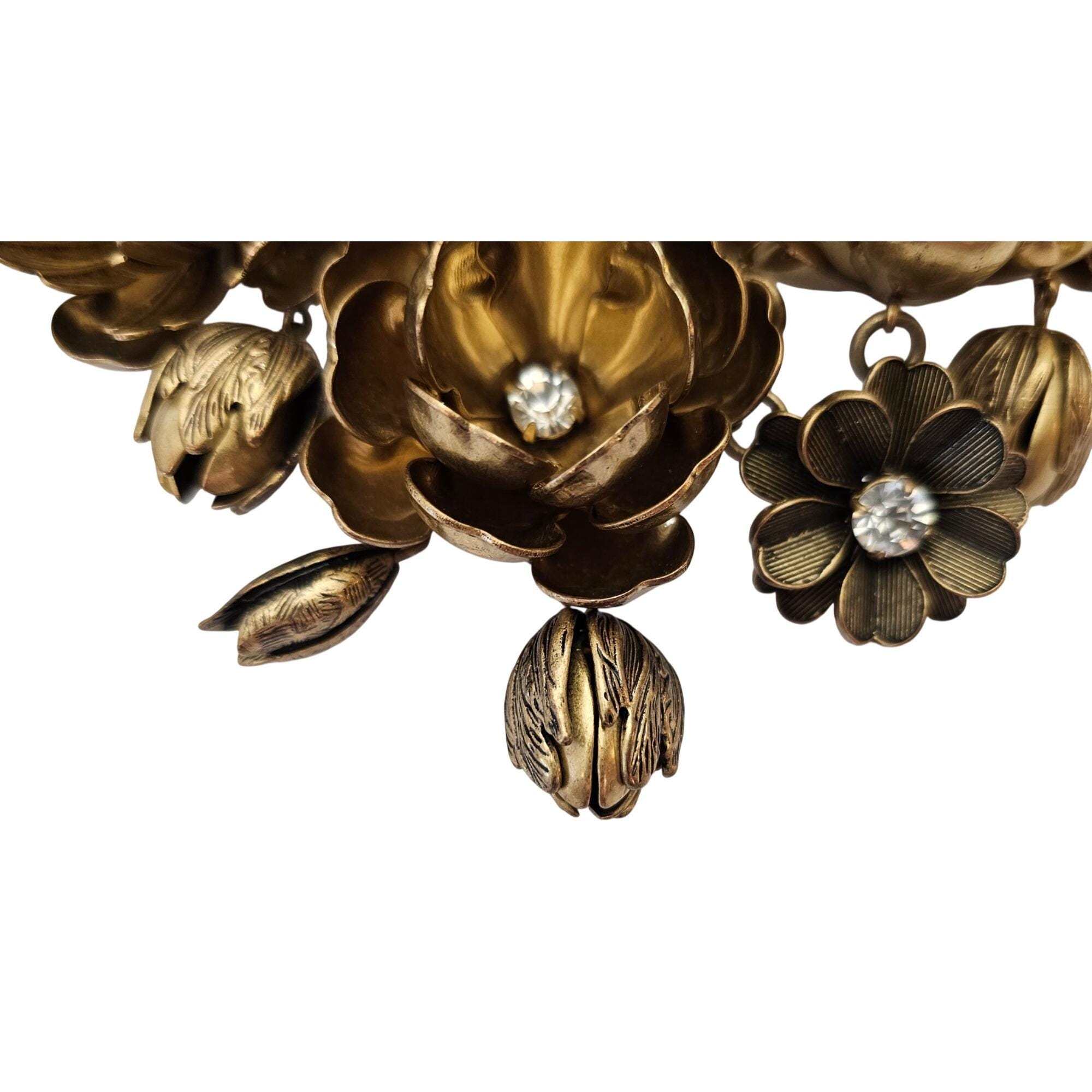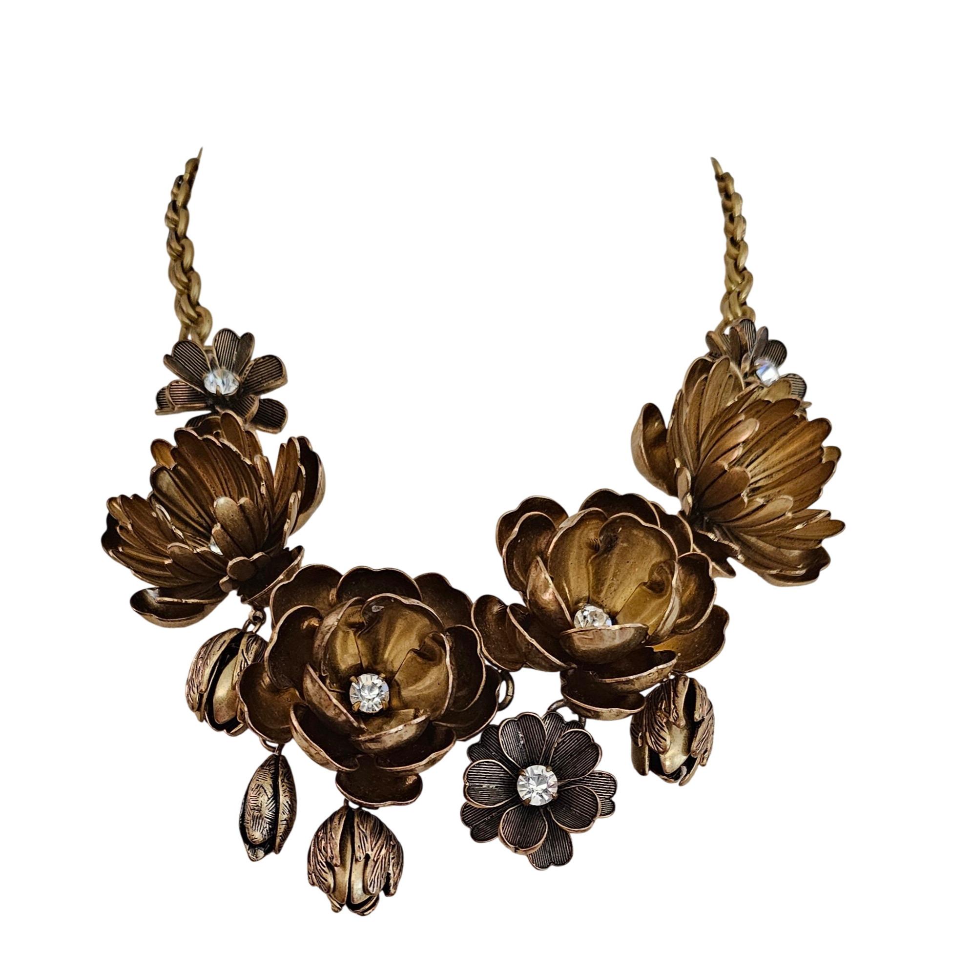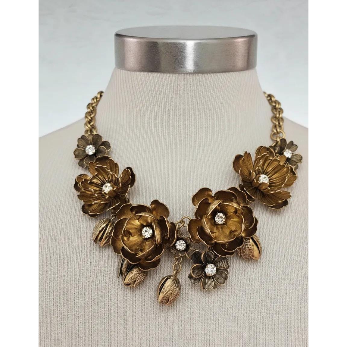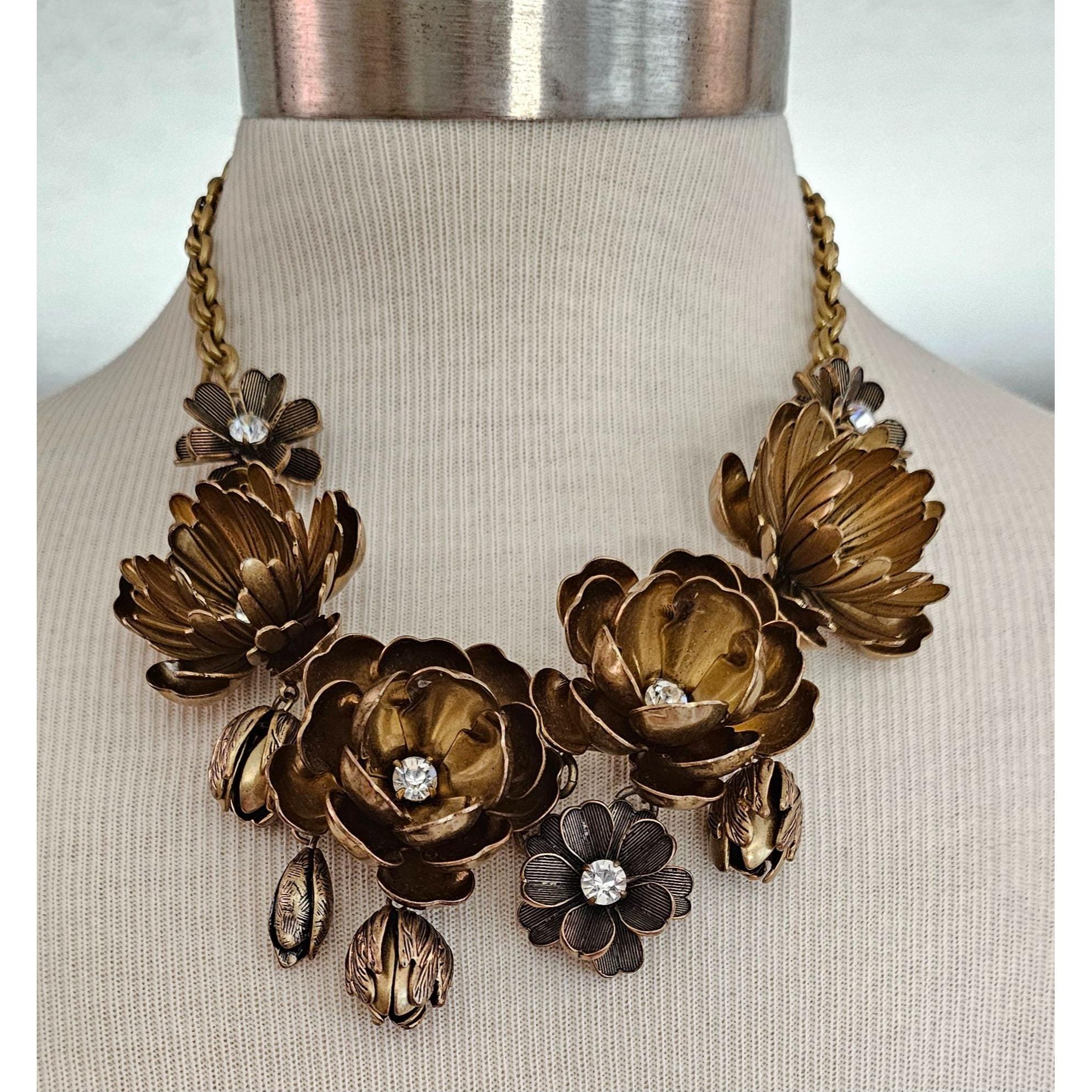 J Crew Brass Poppy Tulip Bud Ornate Necklace Clear Rhinestones C637
