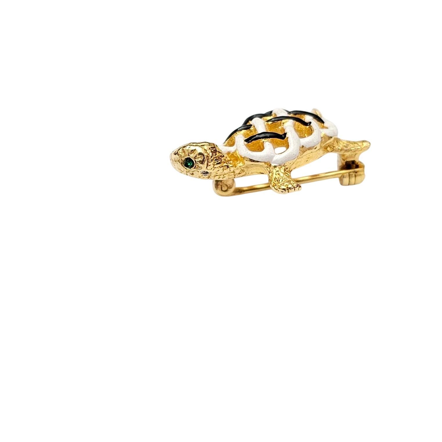Turtle Pin Green Eyes Black White Small Brooch C594