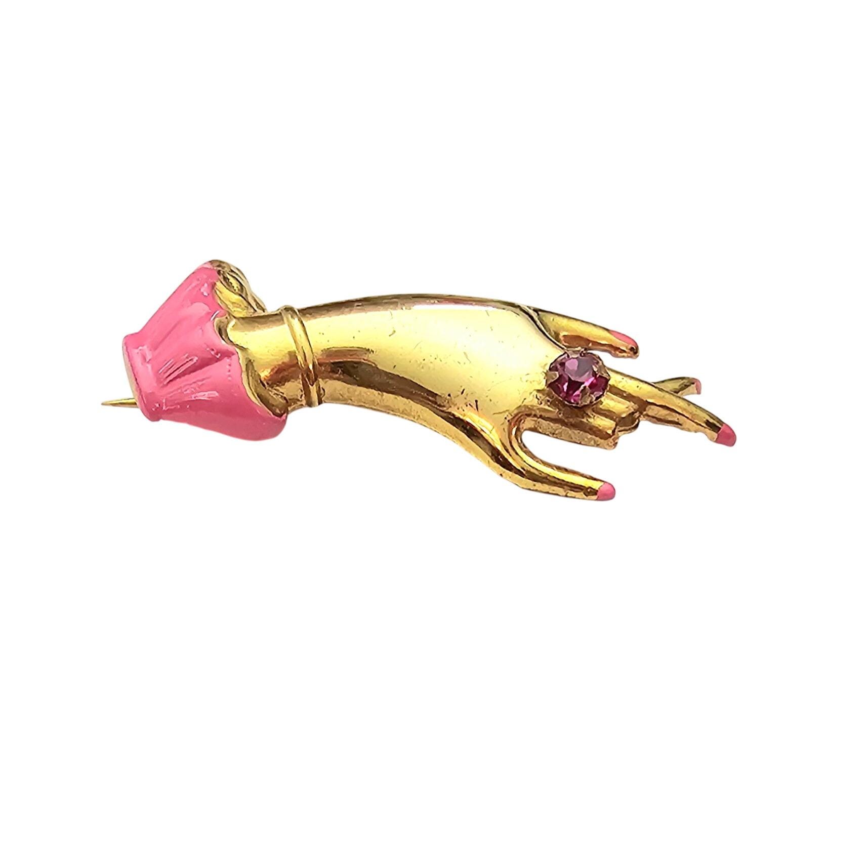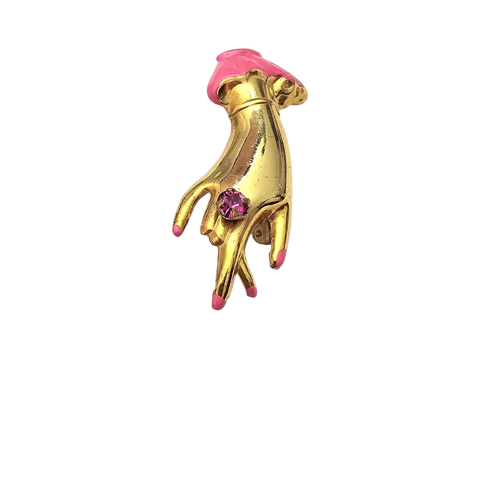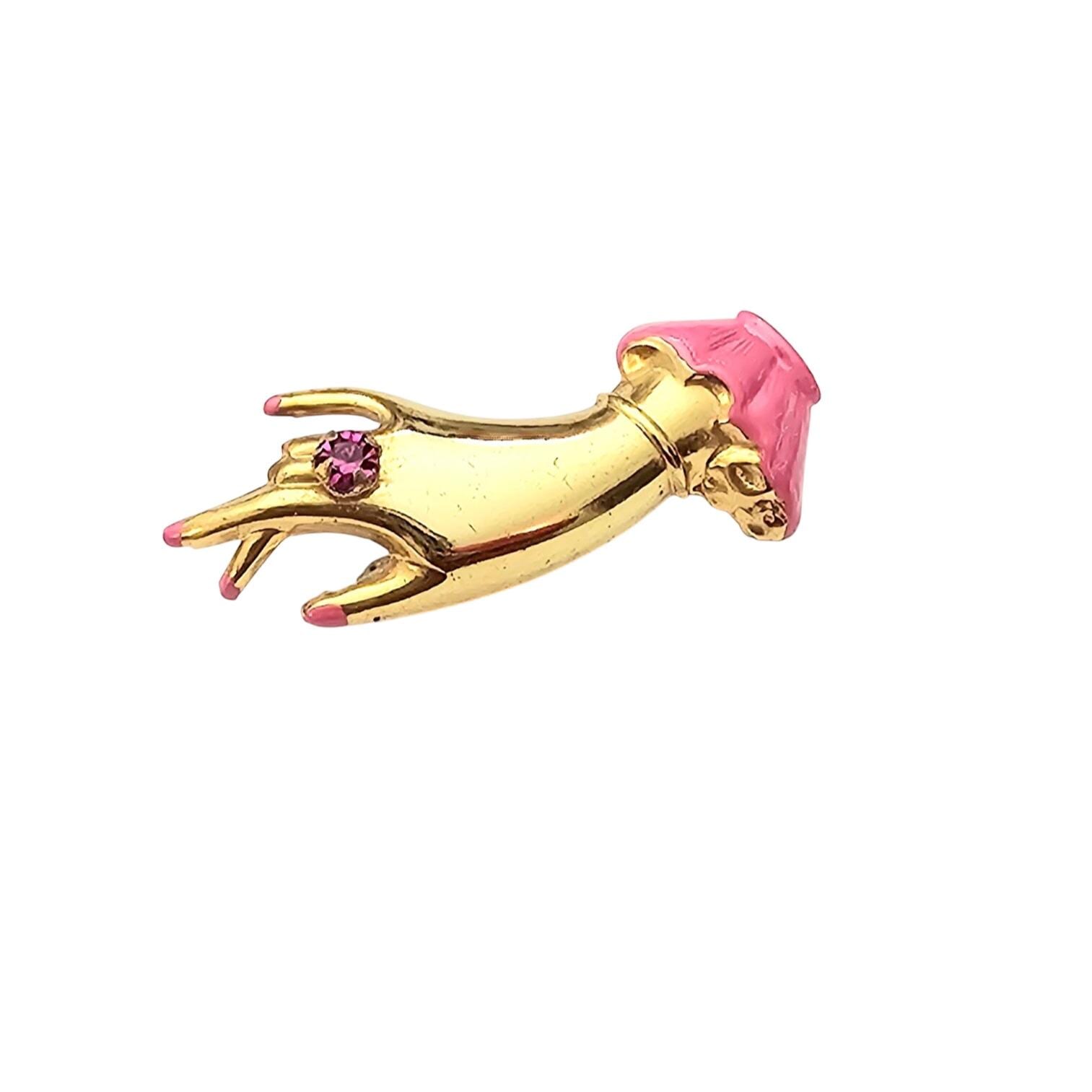 Hand Brooch Vintage Pin Pink Enamel Cuff, Nails, Rhinestone Ring Pin C691