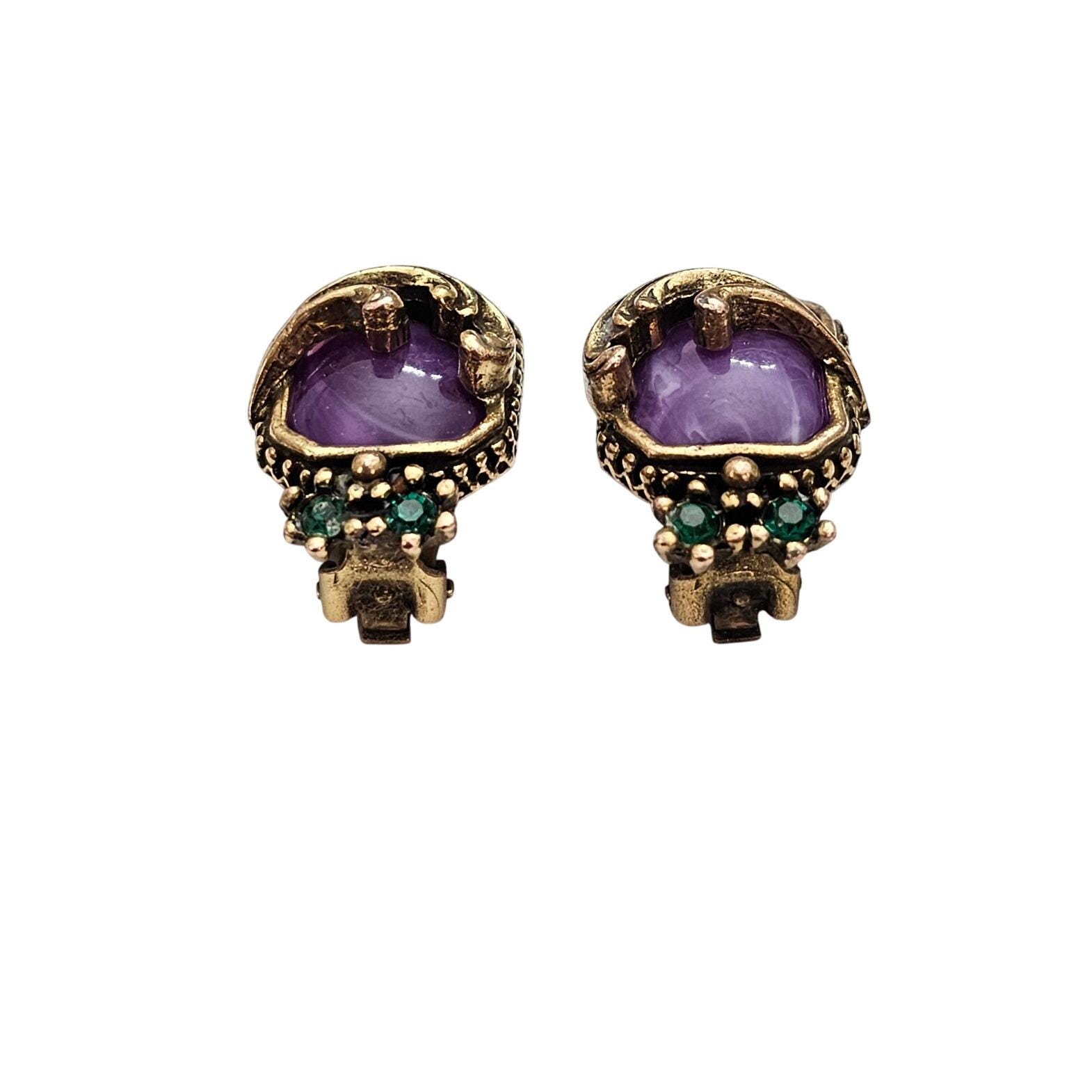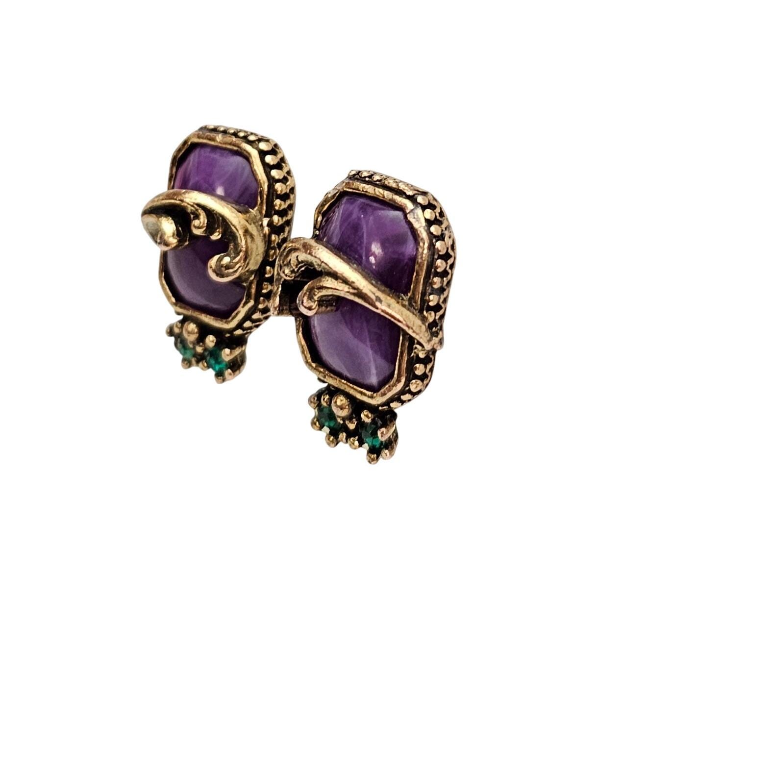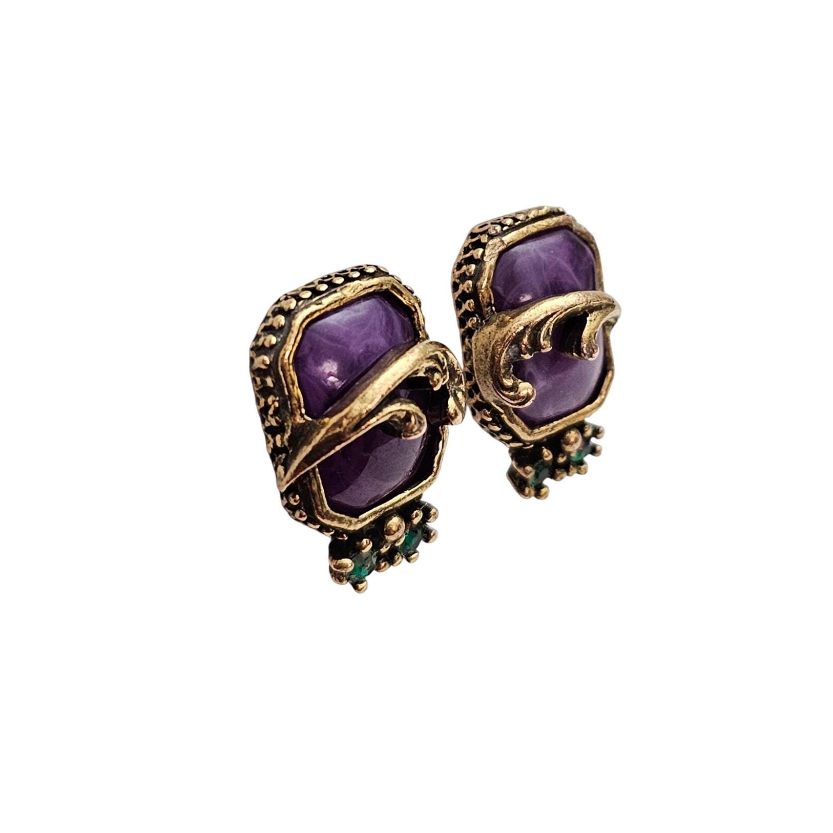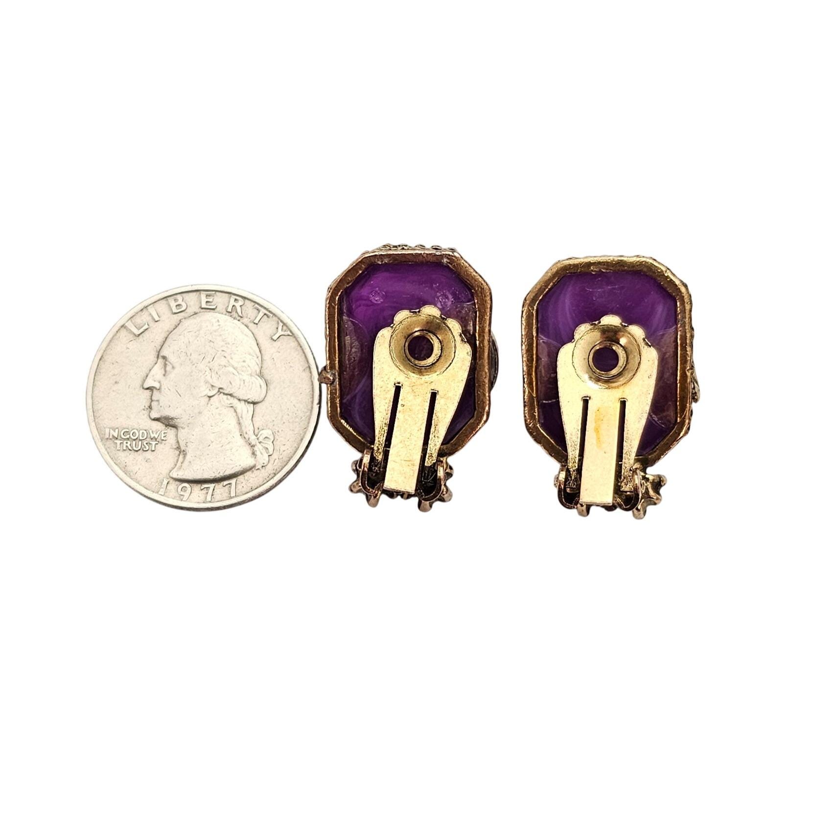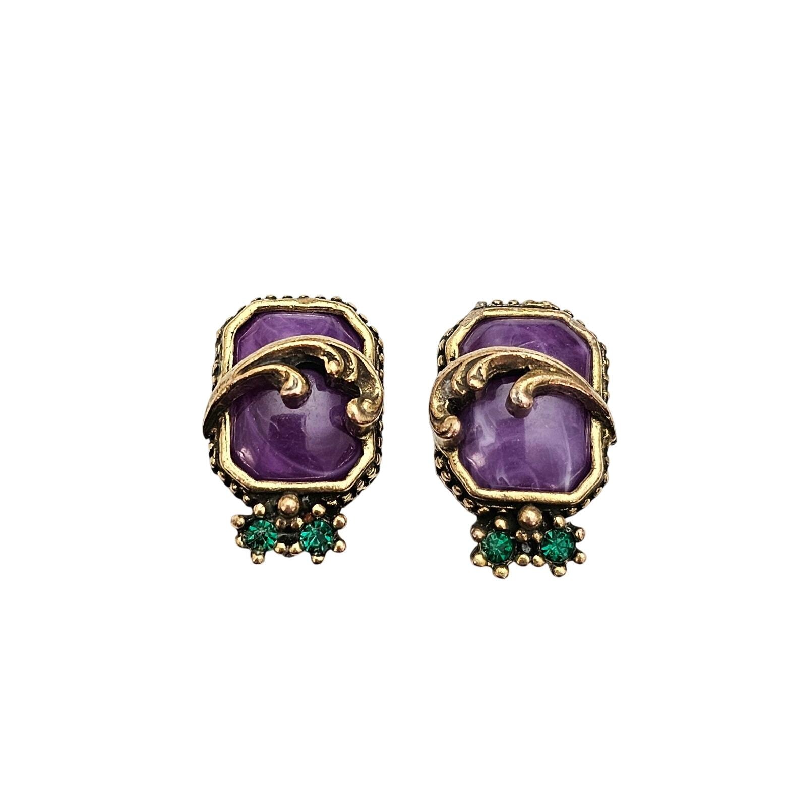 Gold Tone Purple Swirl Lucite Square Clip On Nouveau Plume Green Rhinestone Earrings C715