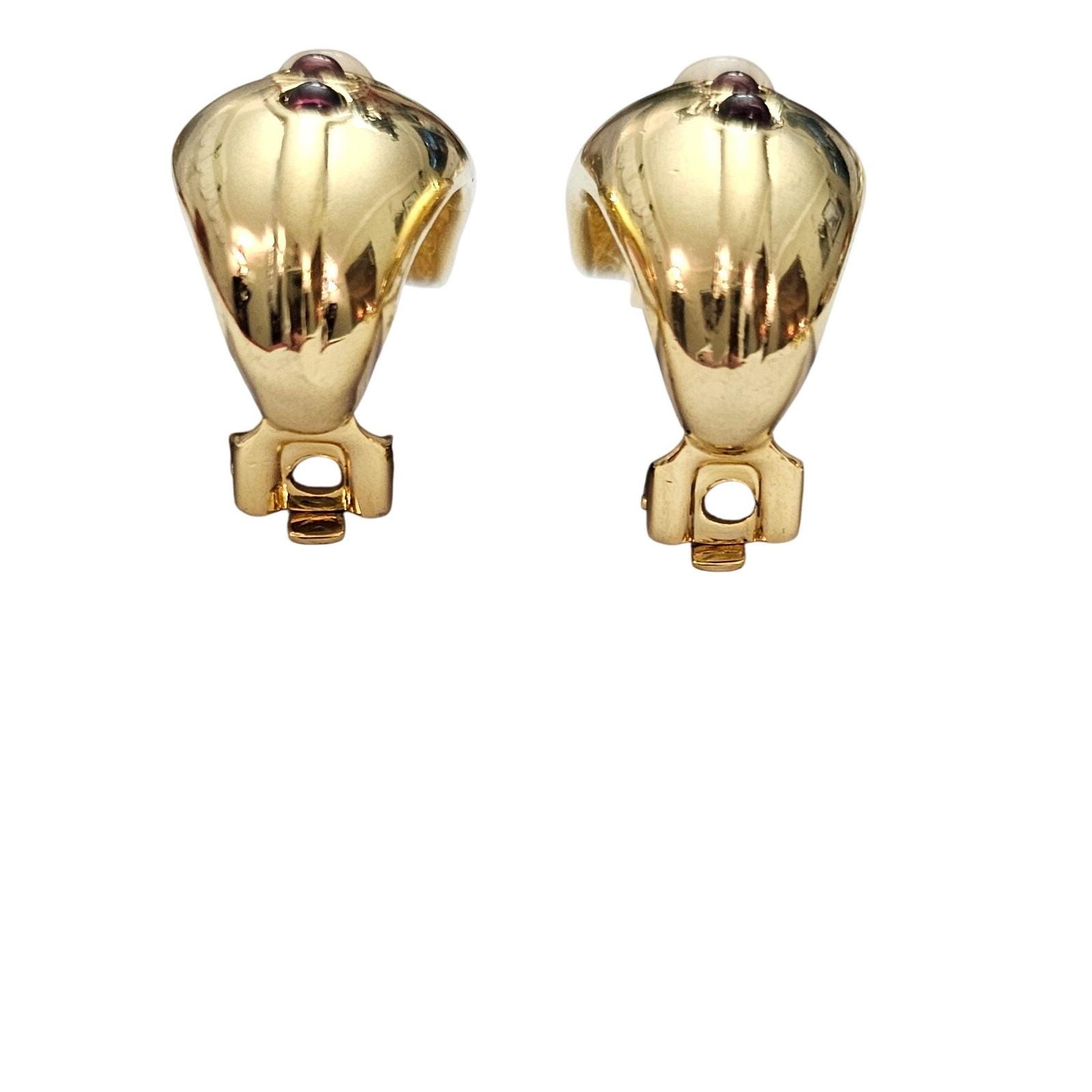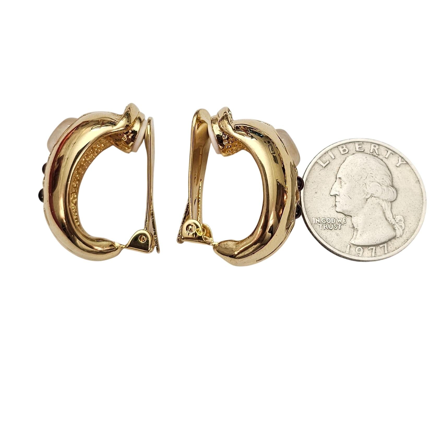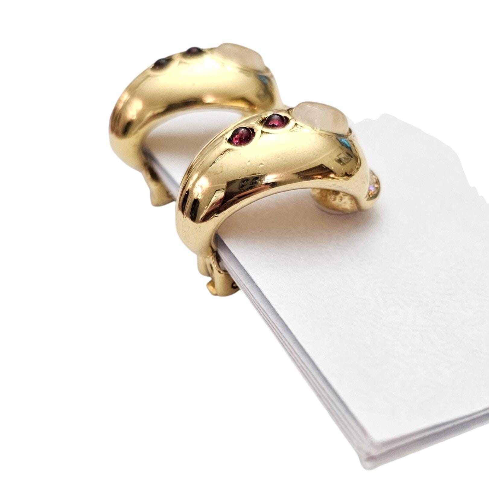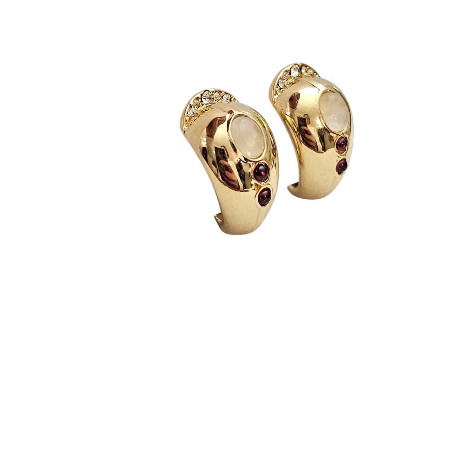 Gold Tone Curvy Half Hoop Clip On Opaline Glass Oval, Red Cab Earrings C721