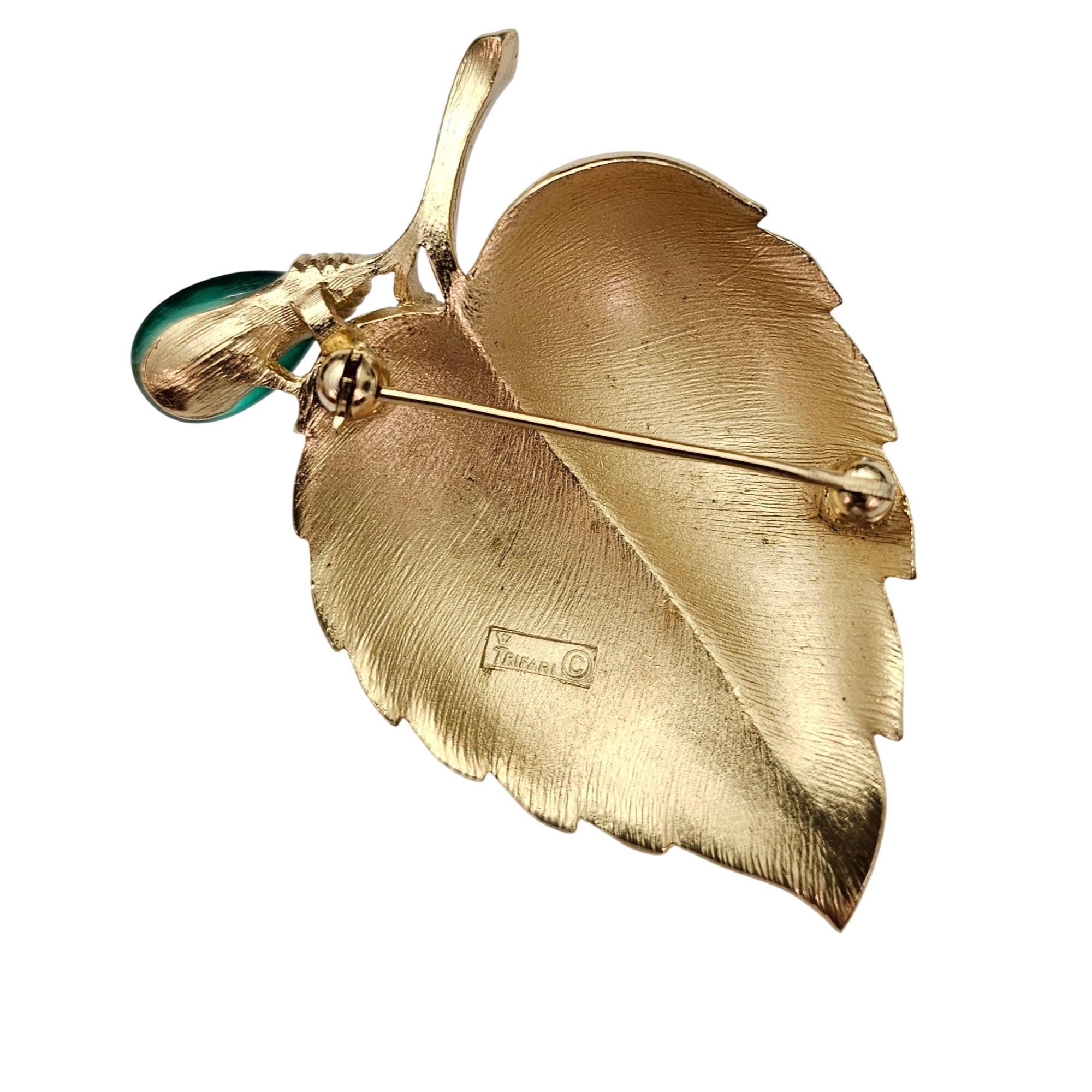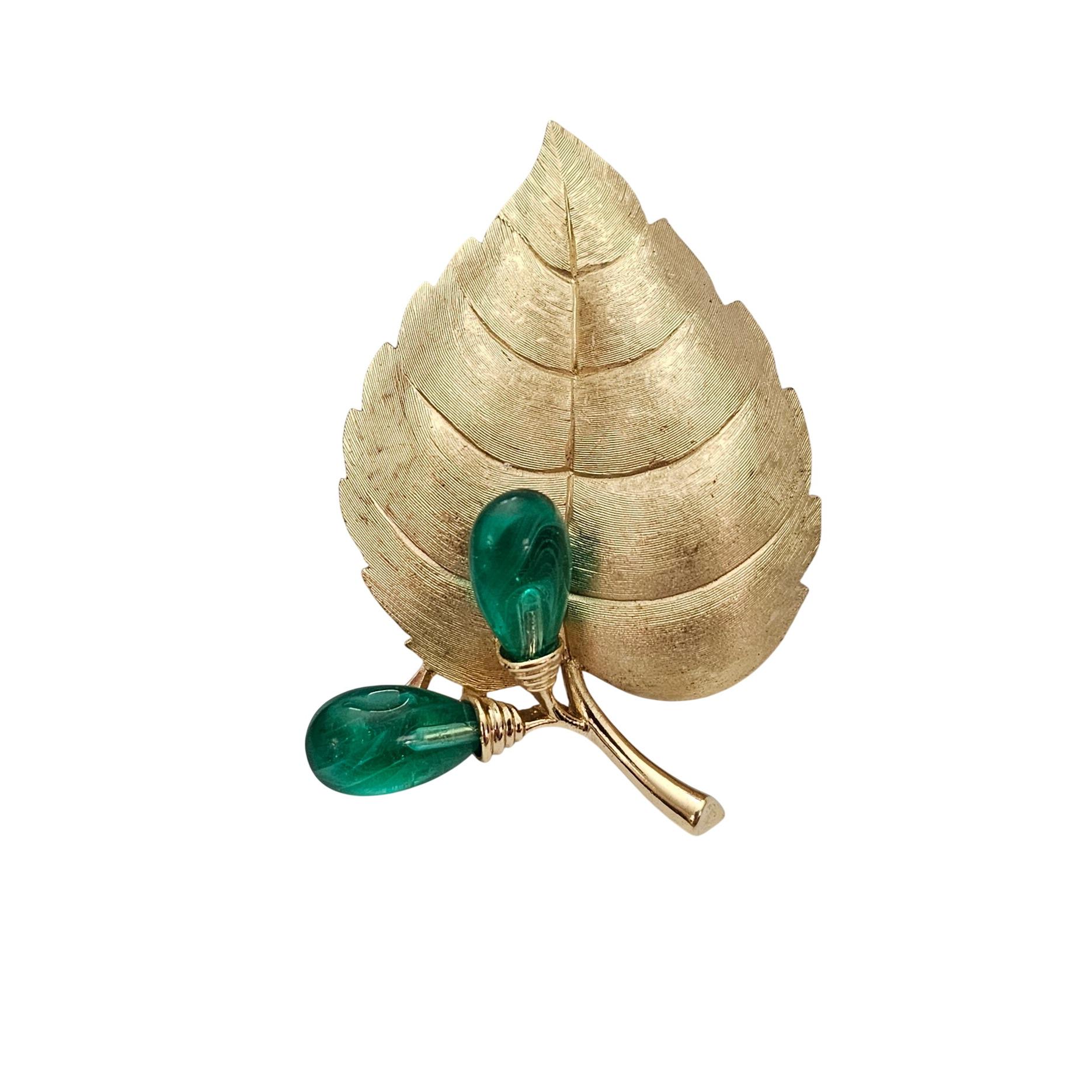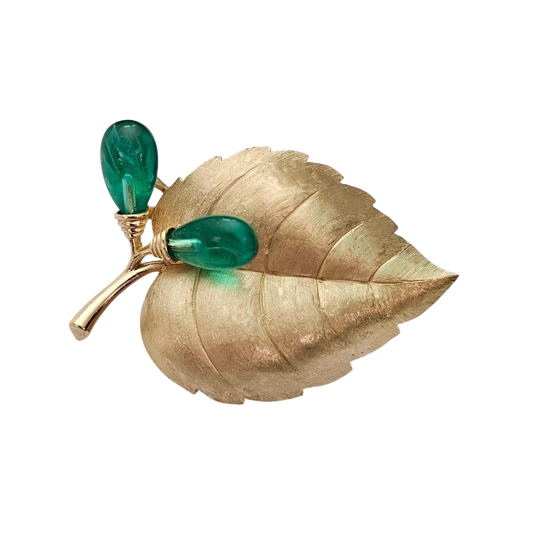Trifari Rare Flawed Lampwork Glass Berries Leaf Brooch Brushed Gold Tone Leaf Pin C811