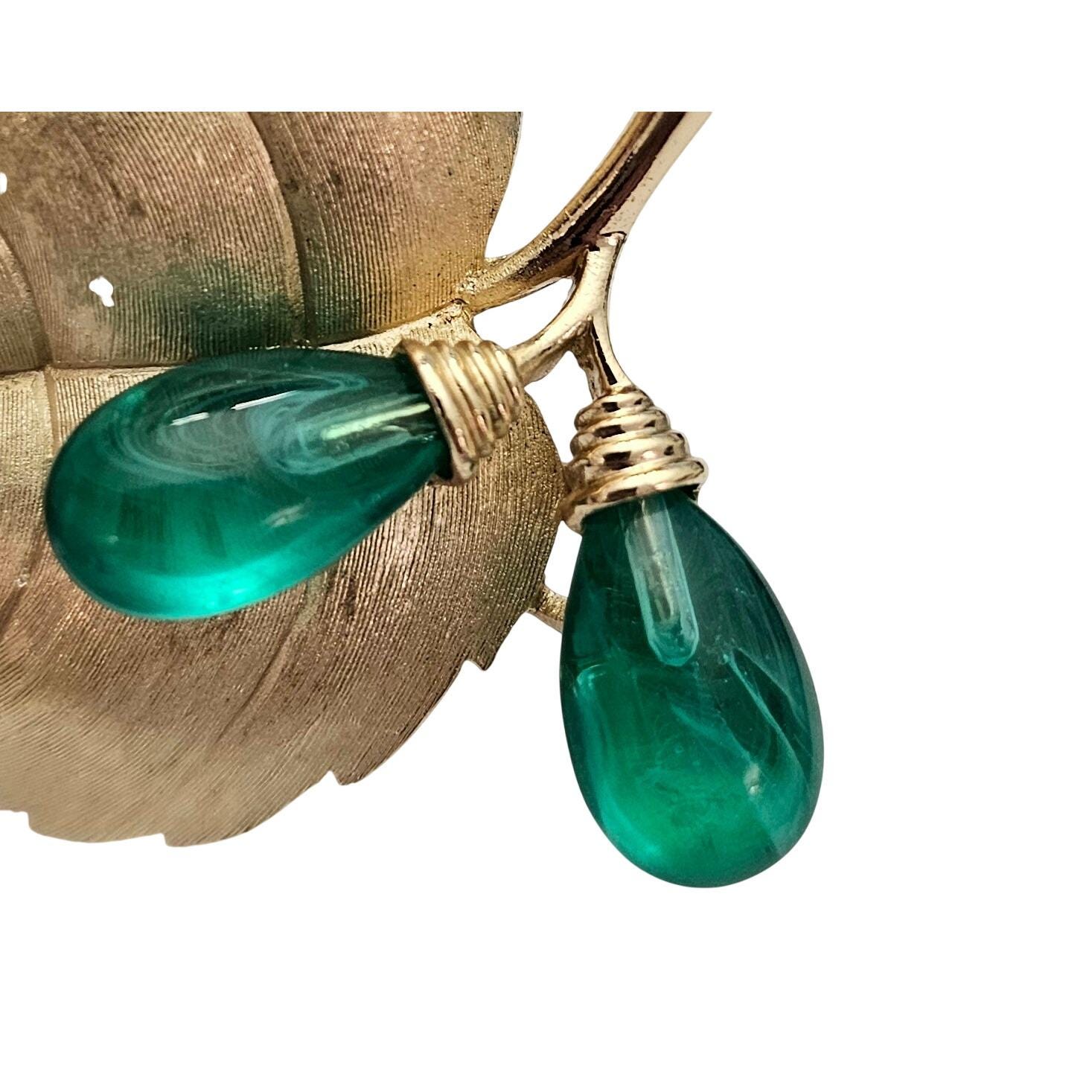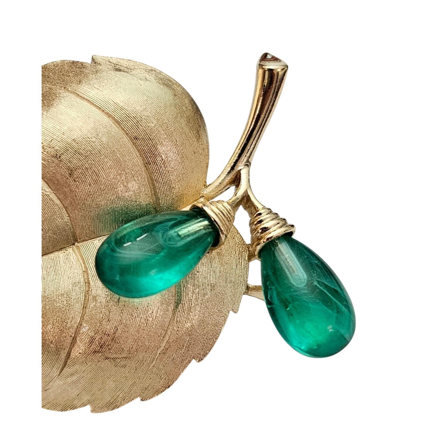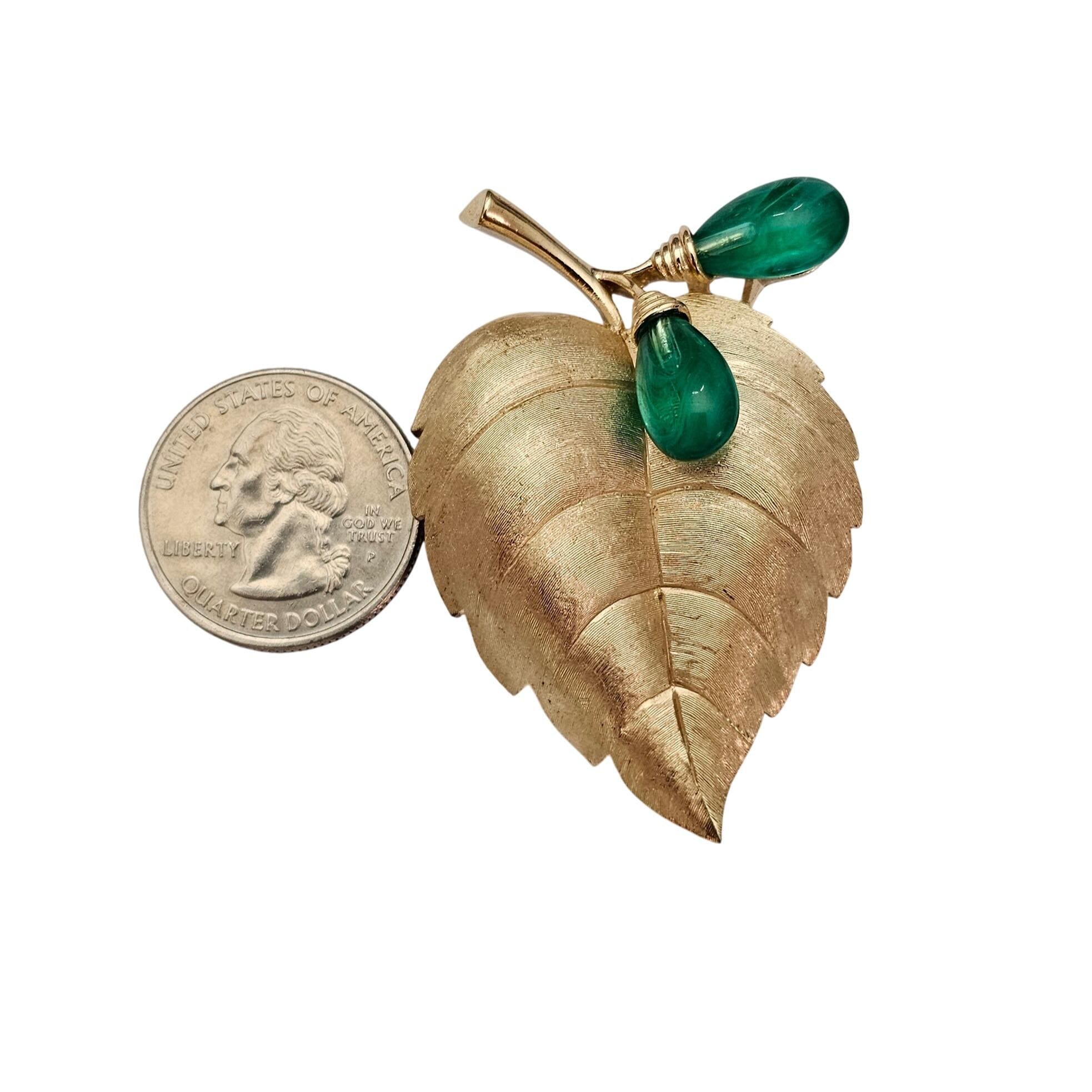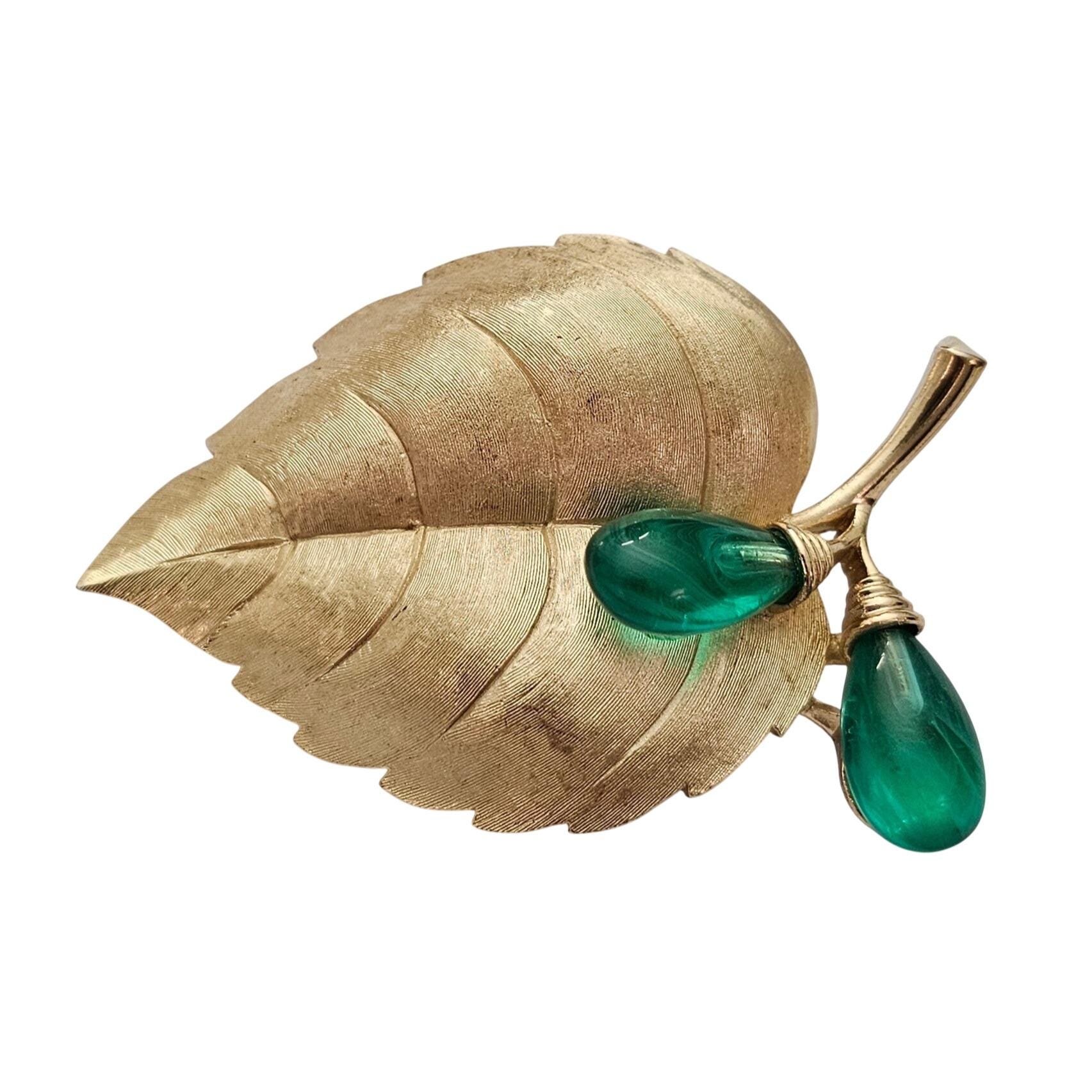 Trifari Rare Flawed Lampwork Glass Berries Leaf Brooch Brushed Gold Tone Leaf Pin C811