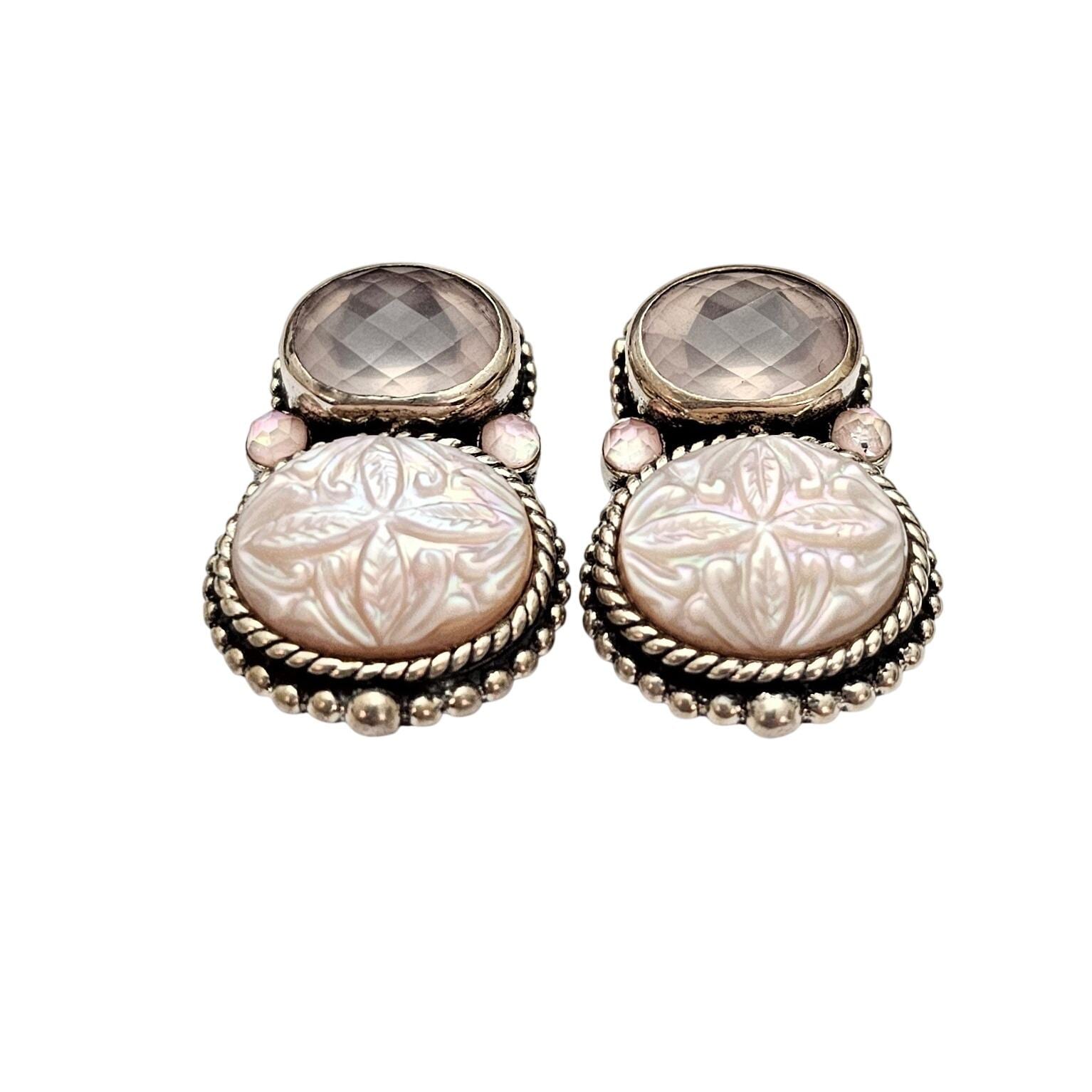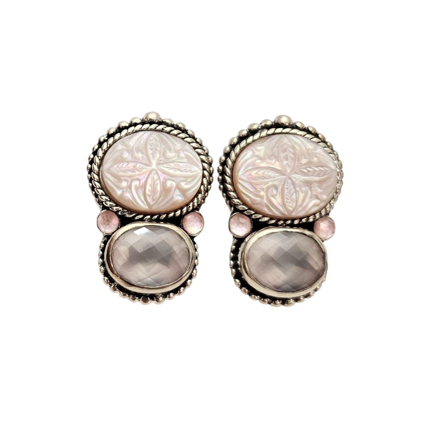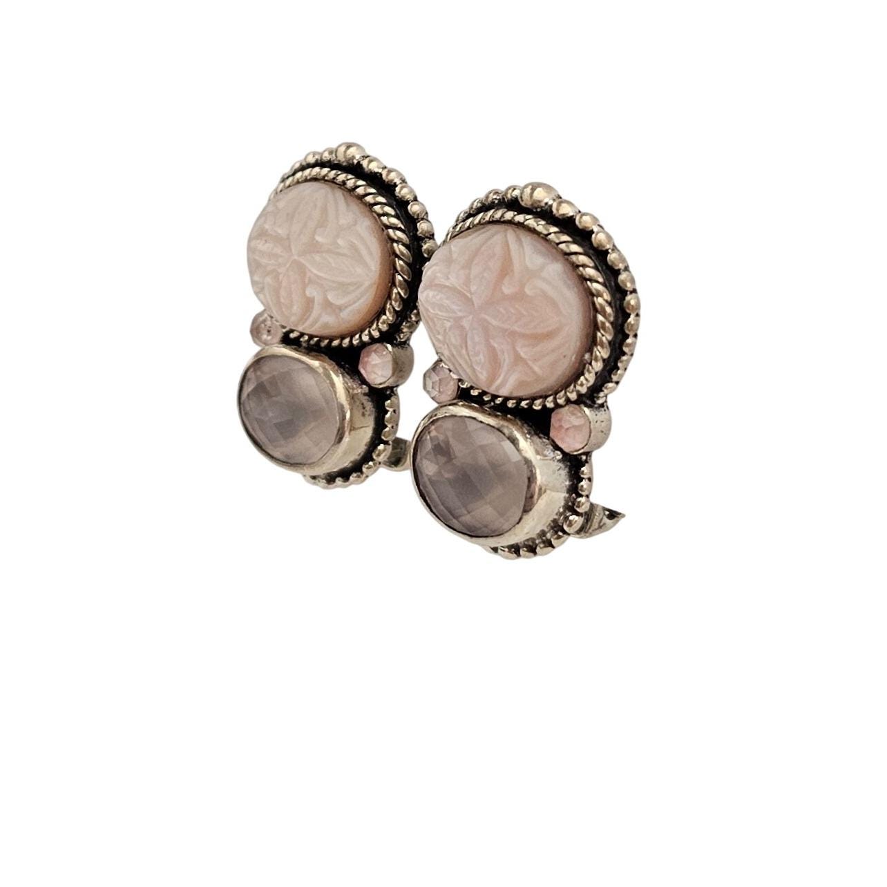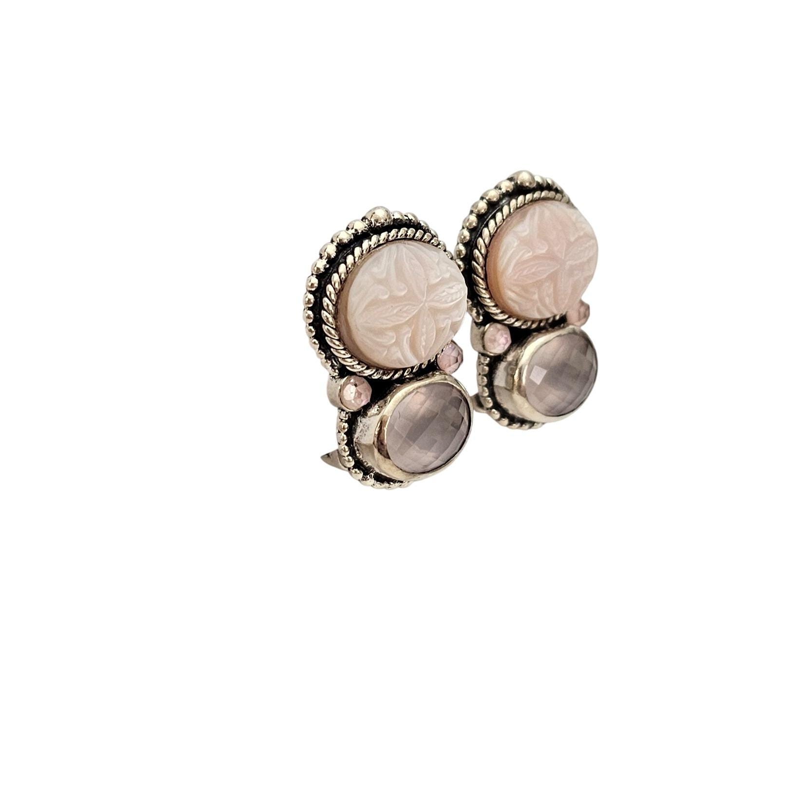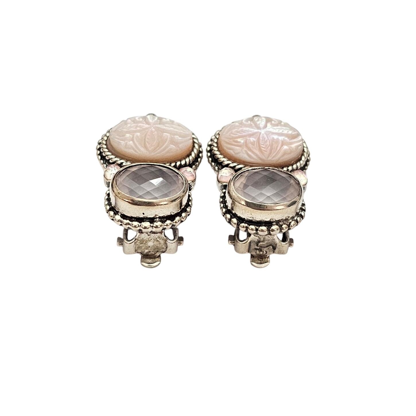 Stephen Dweck Bezel-Set Sterling Pink Shell Carved & Rose Quartz Faceted Clip On Earrings Signed, C813