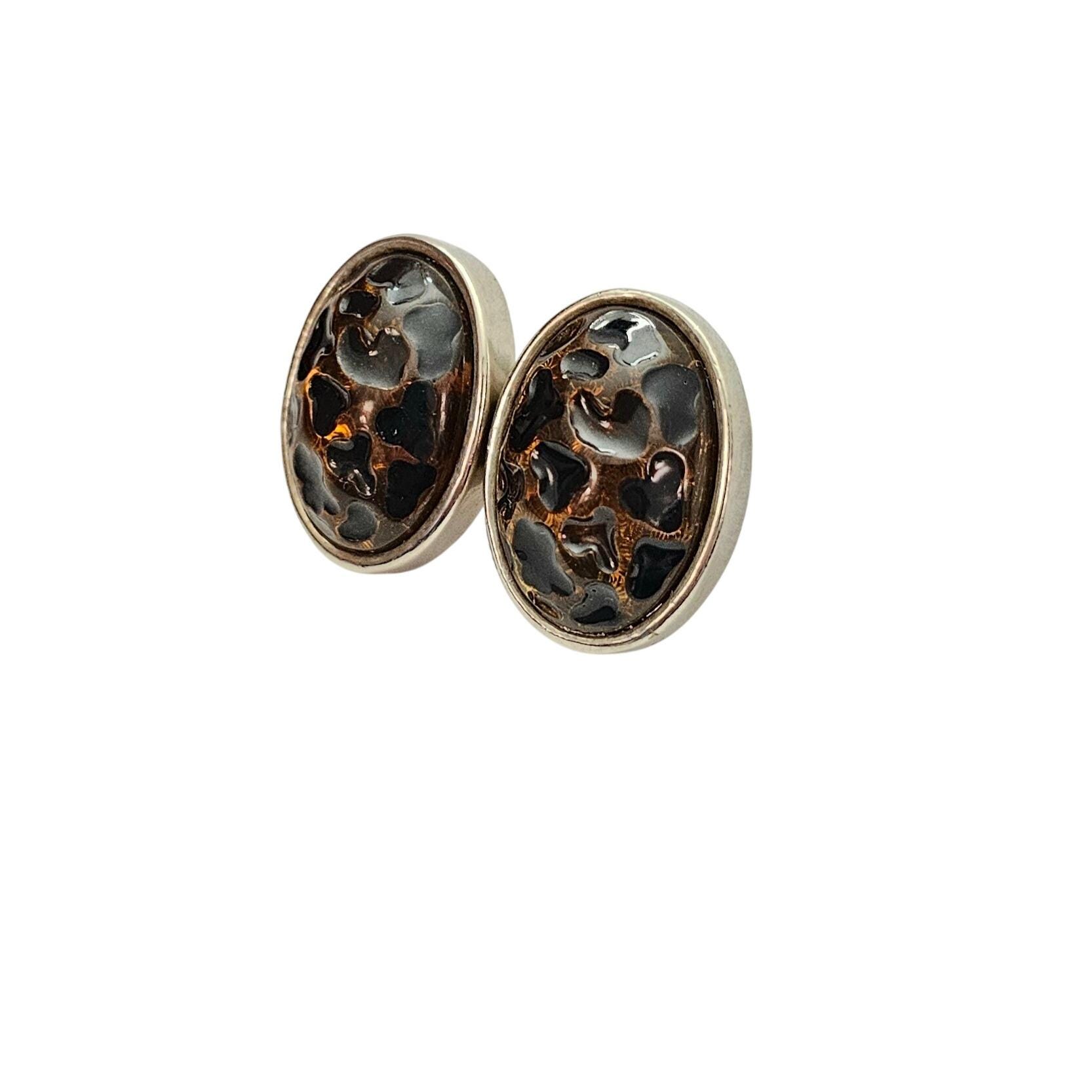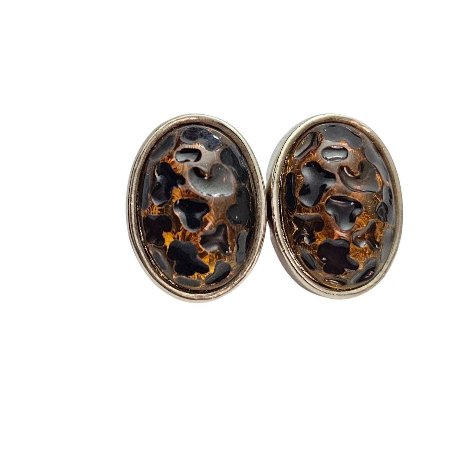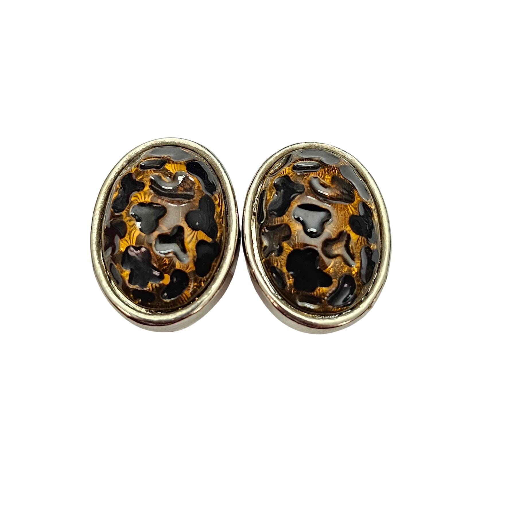 Oval Black Gold Lucite Animal Print Clip On Earrings C732