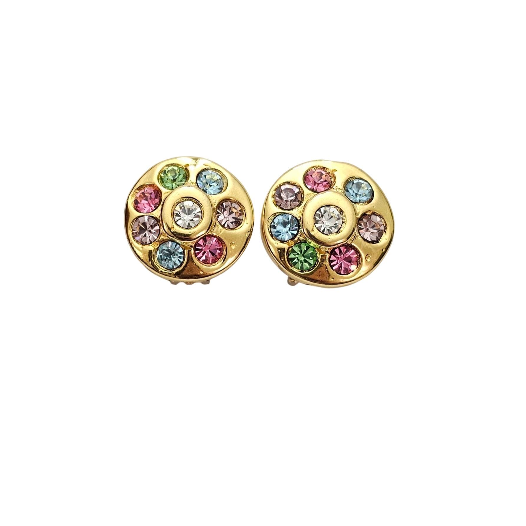 Round Pink Purple Rhinestone Clip Gold Tone Earrings C742