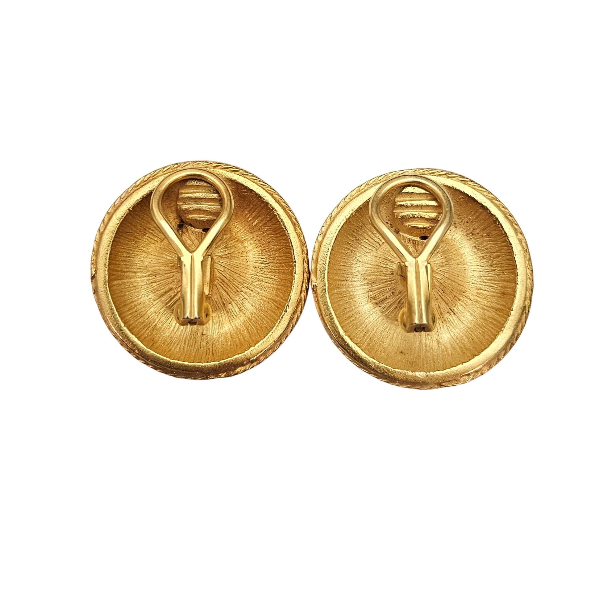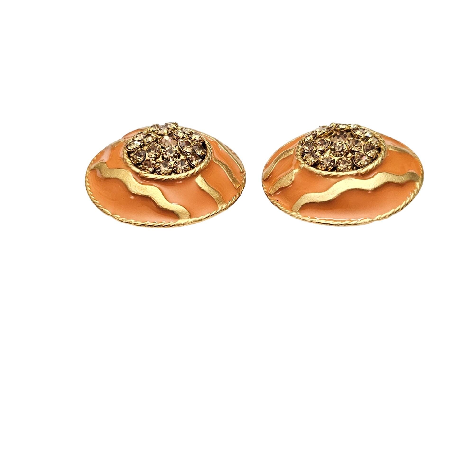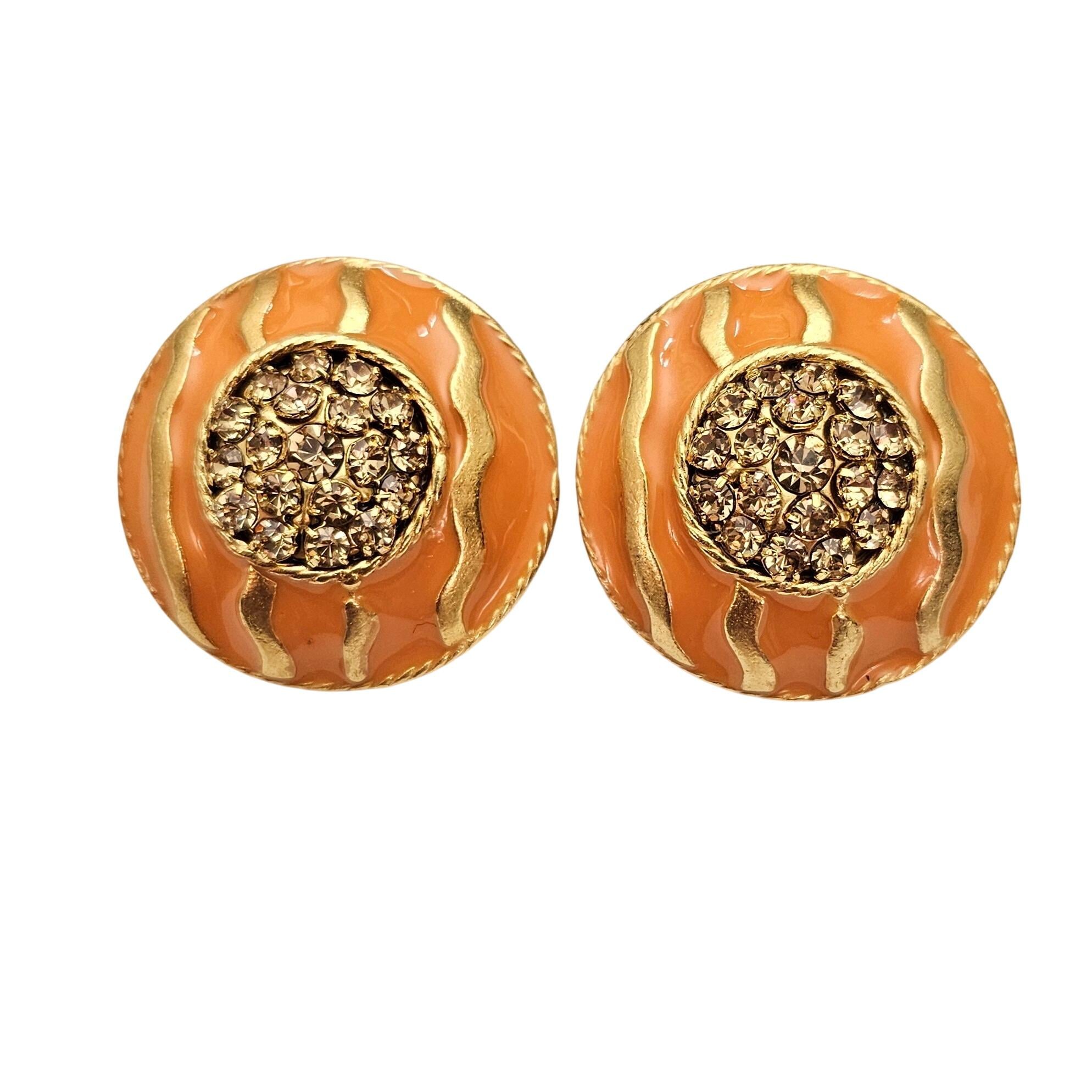 Round Clip On Champagne Rhinestone Orange Enamel Striped Gold Tone Earrings C750