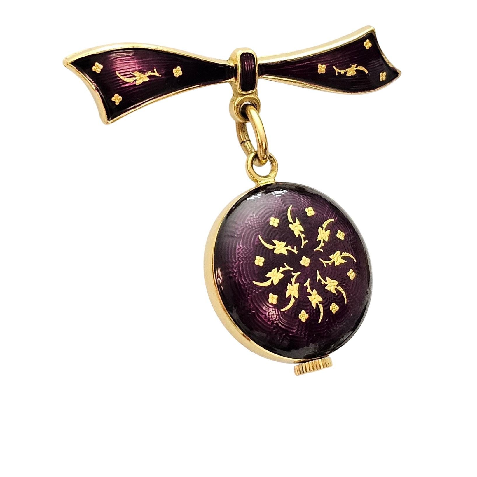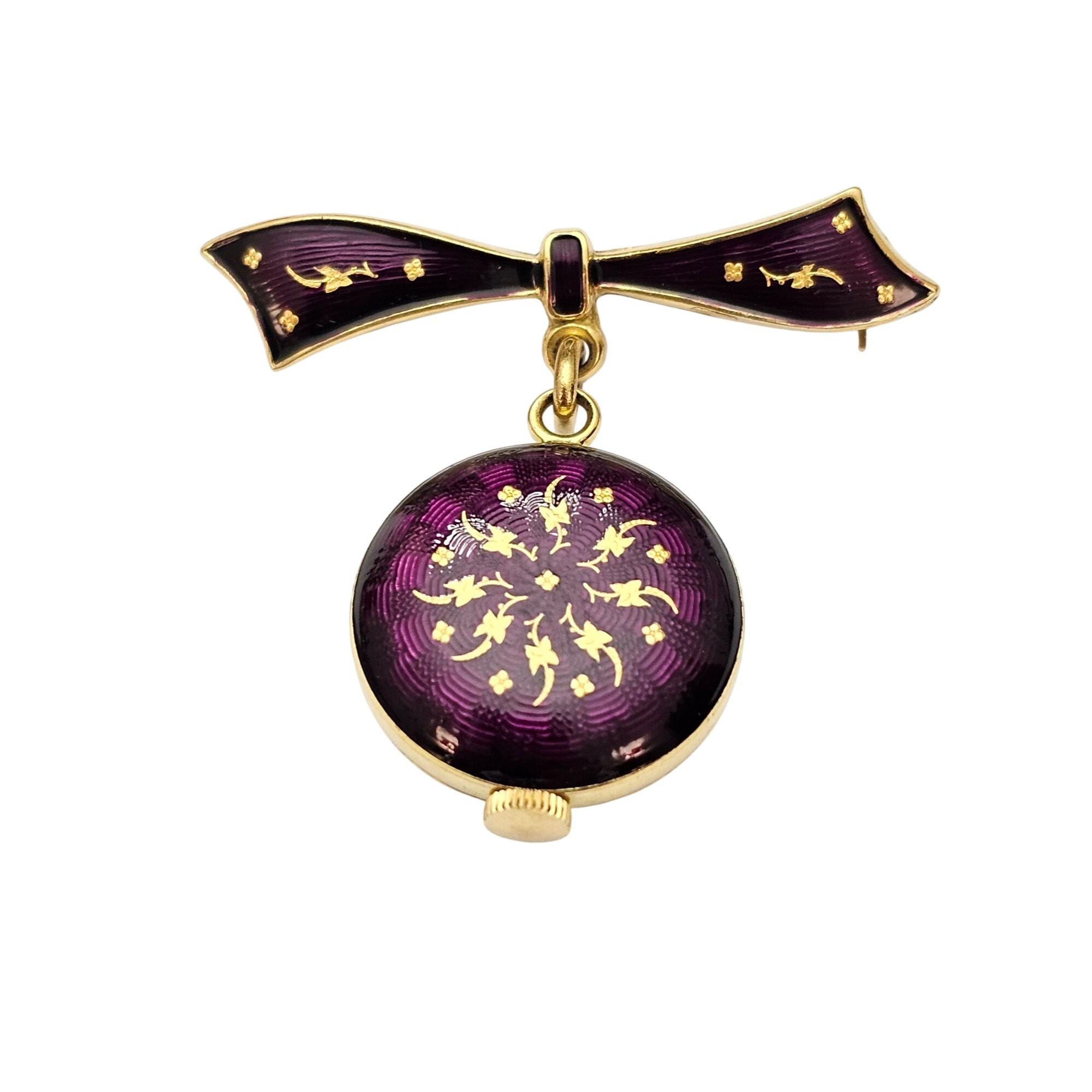 Purple Guilloche Enamel Bow Bar Brooch Sinex Automatic Swiss Clock Dangle Pin C777
