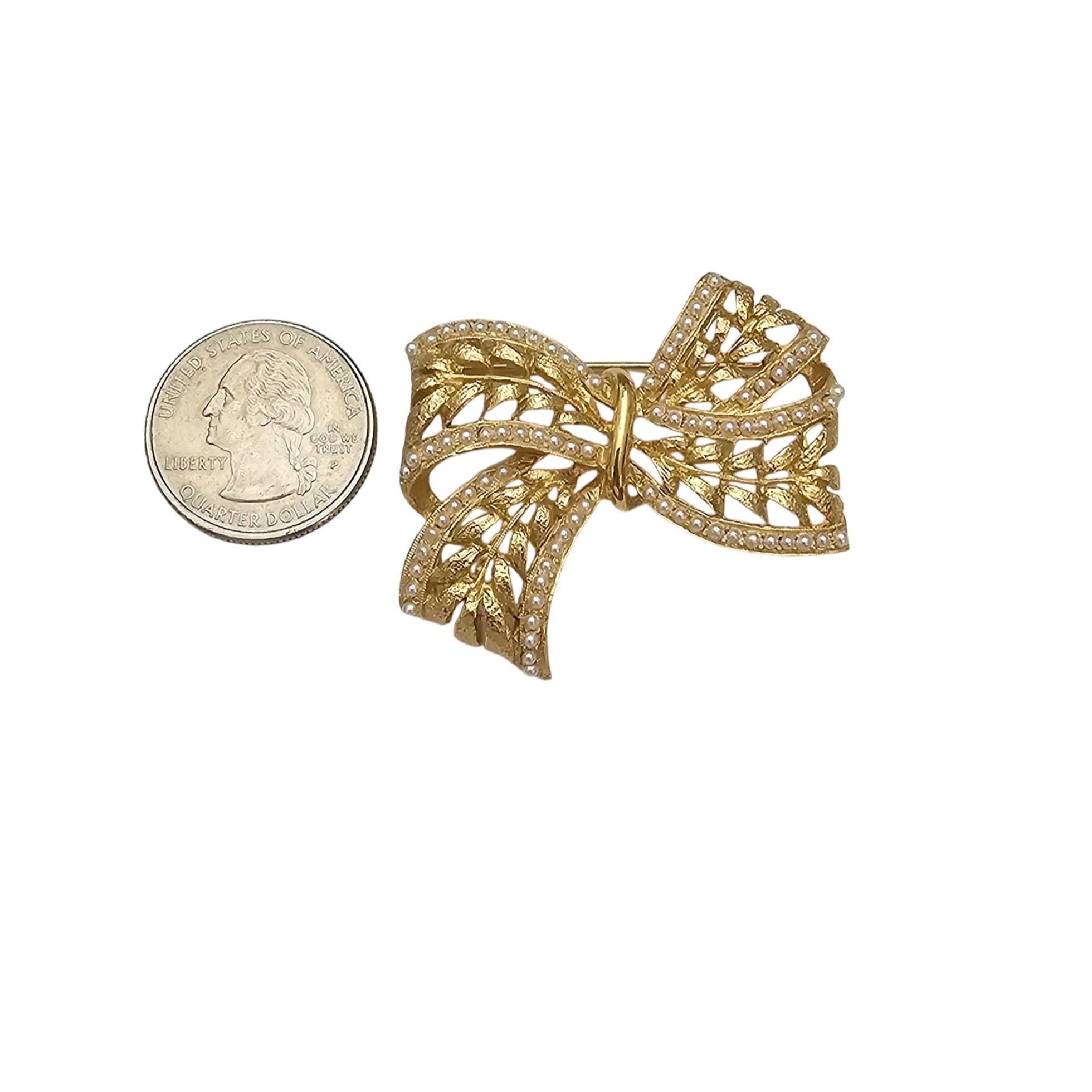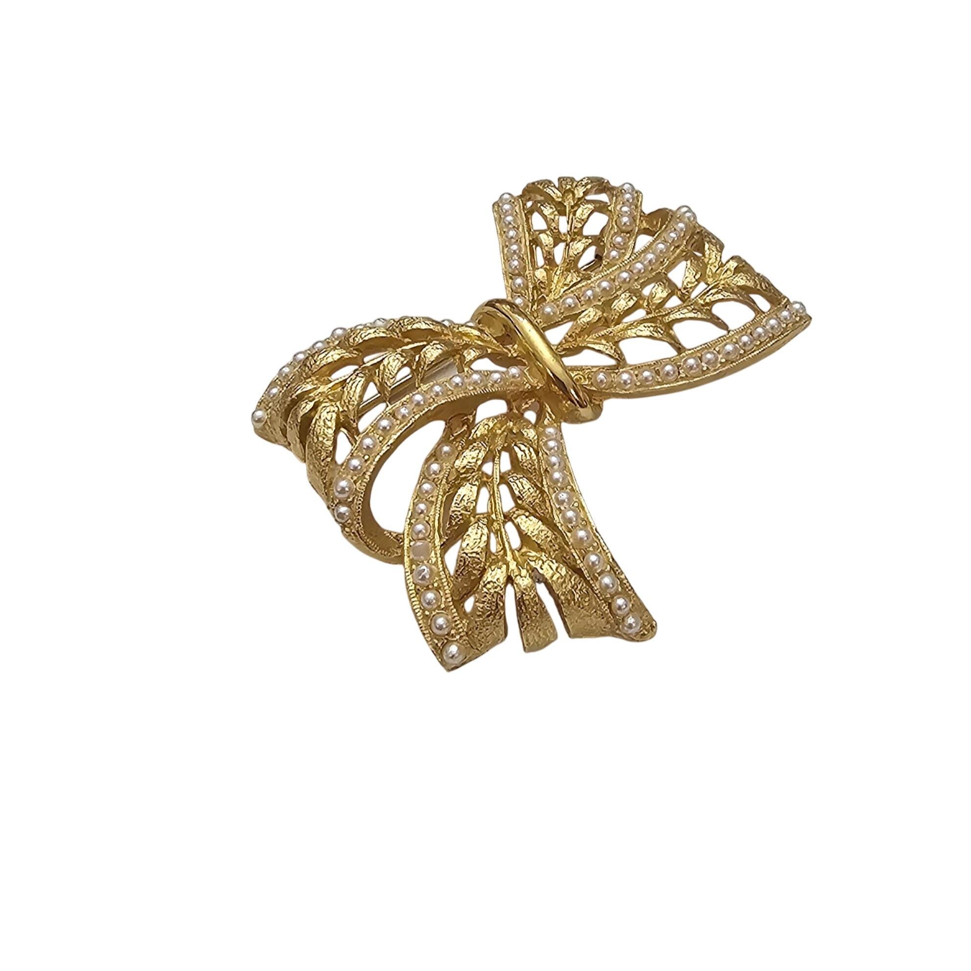 Gold Tone Laurel Leaf Bow Brooch, Faux Seed Pearl Pin, Designer Style C847