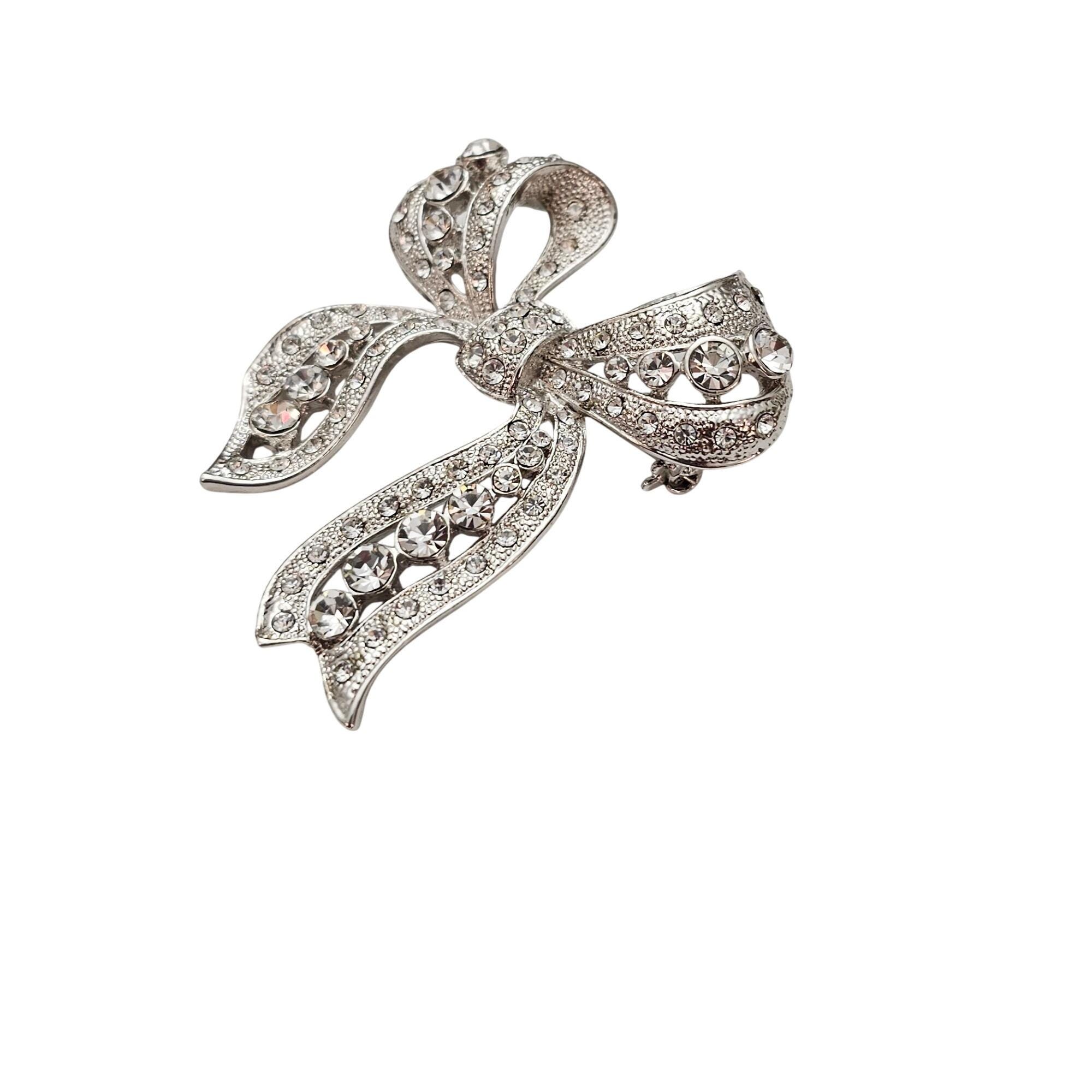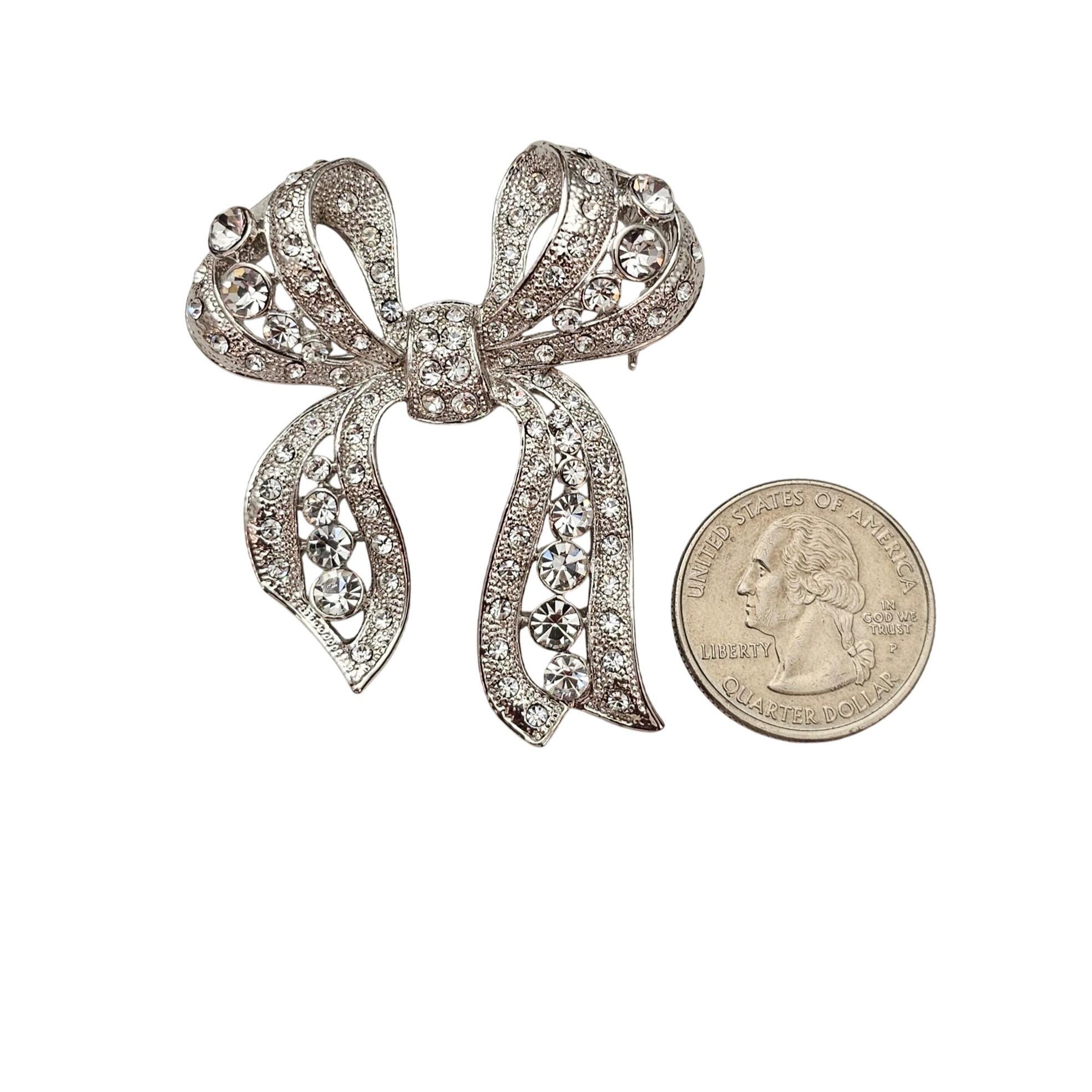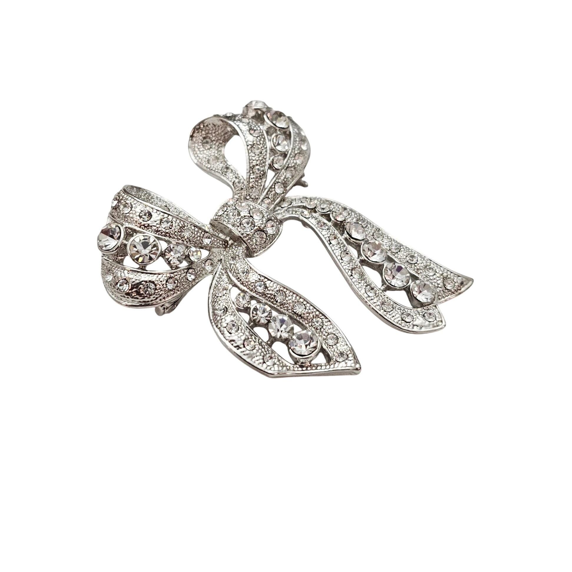Graziano Silver Tone Clear Rhinestone Bow Brooch Chunky Pin C852