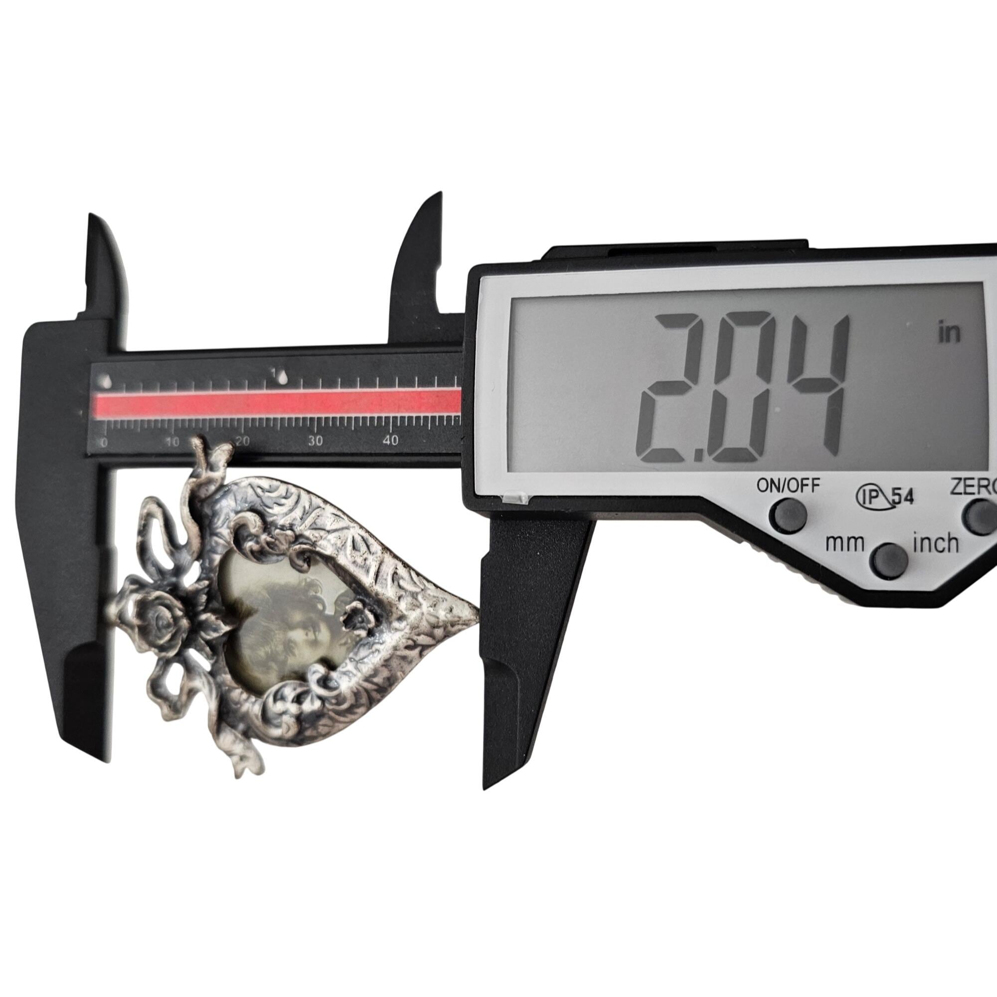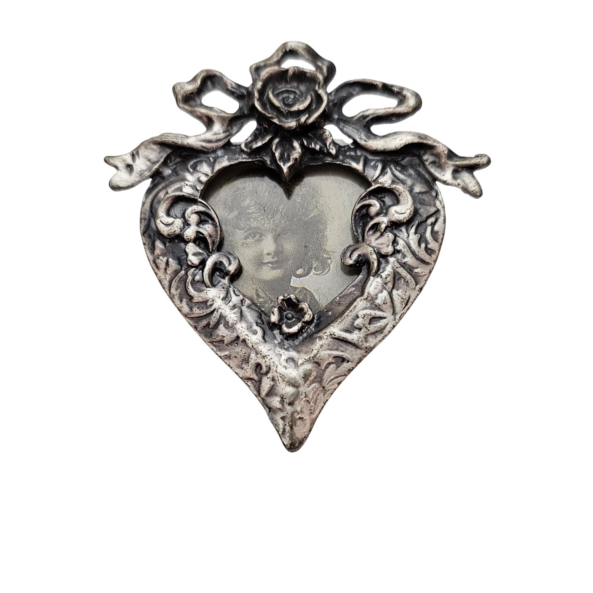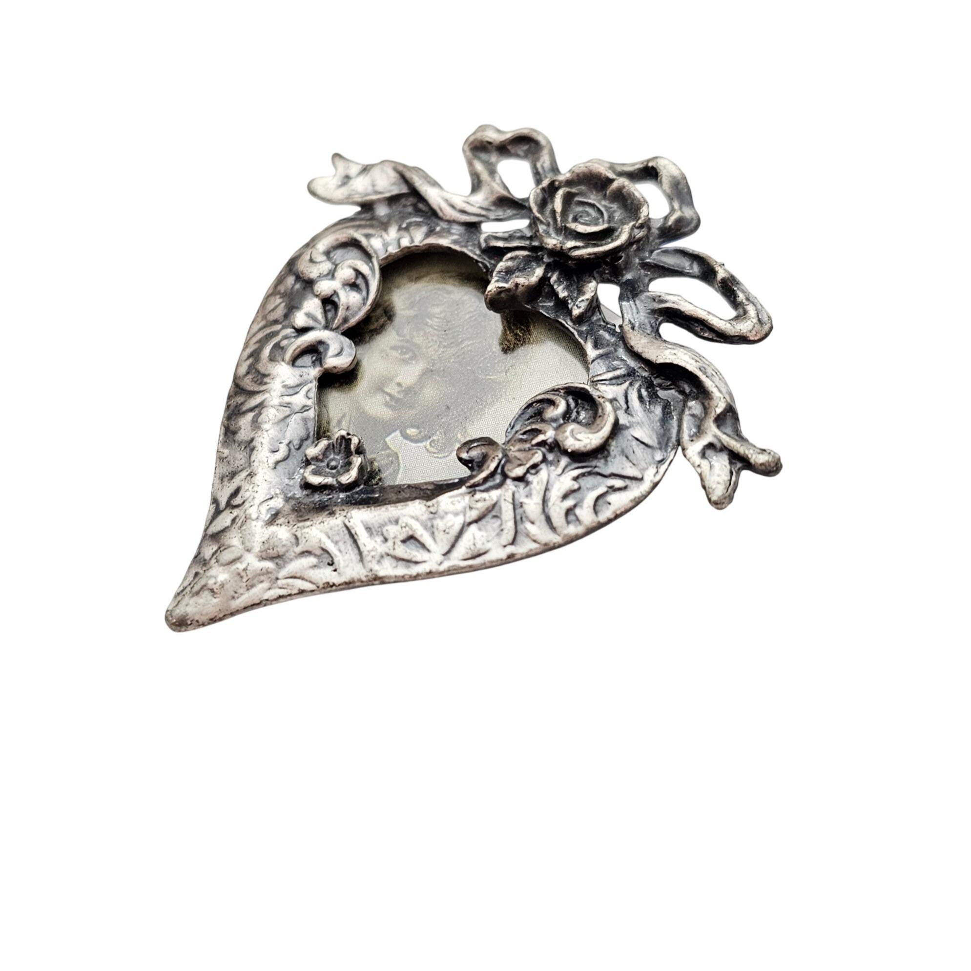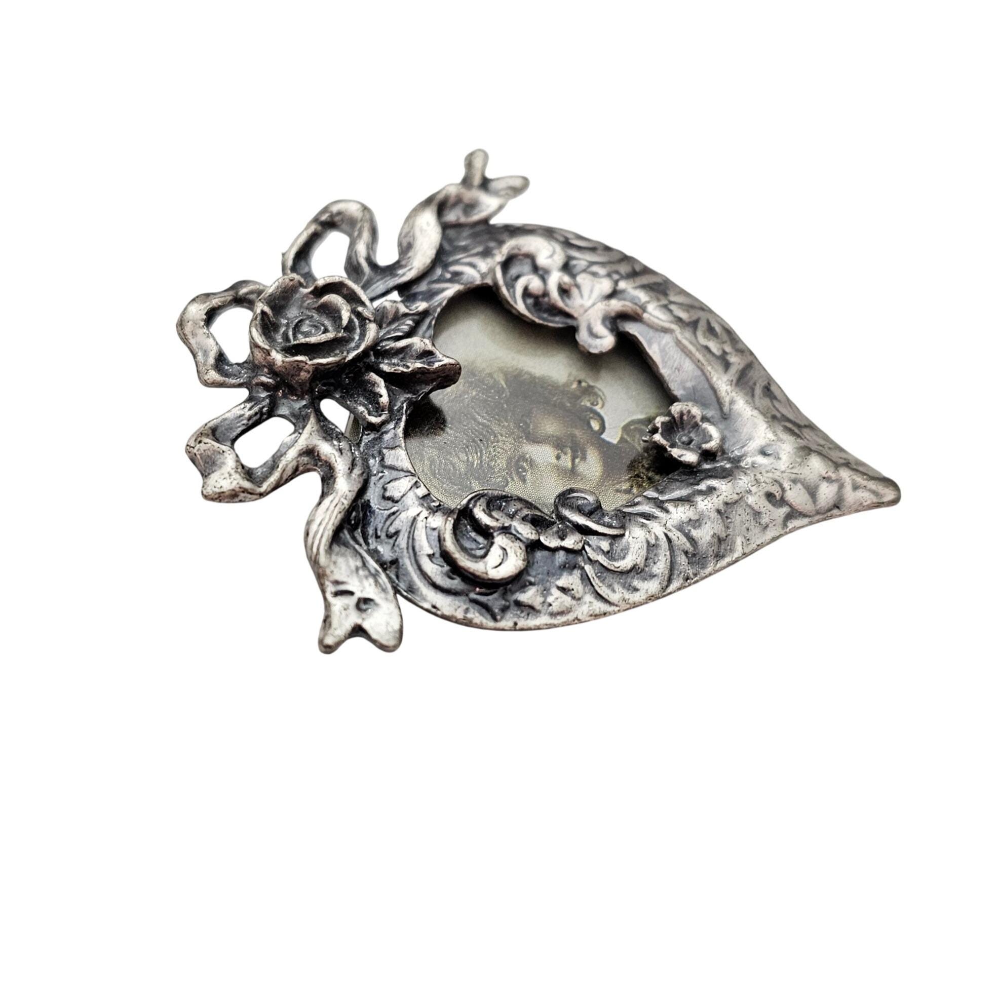 Silver Tone Heart Rose Ribbon Photo Frame Brooch, Pewter Style Pin C850