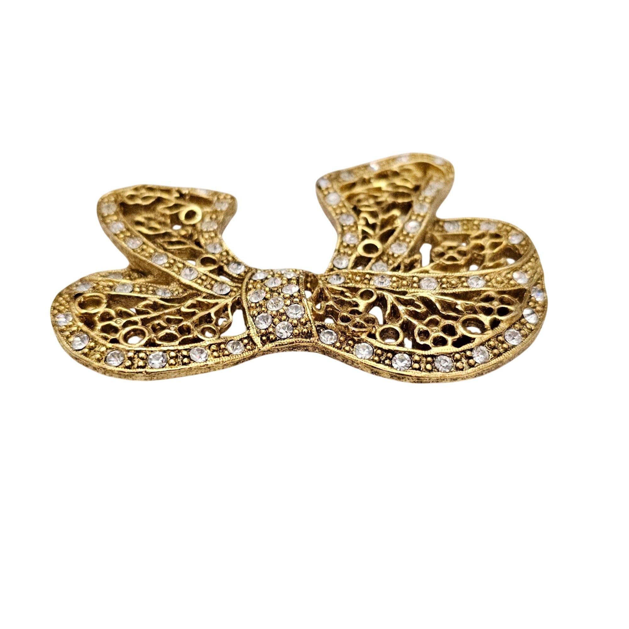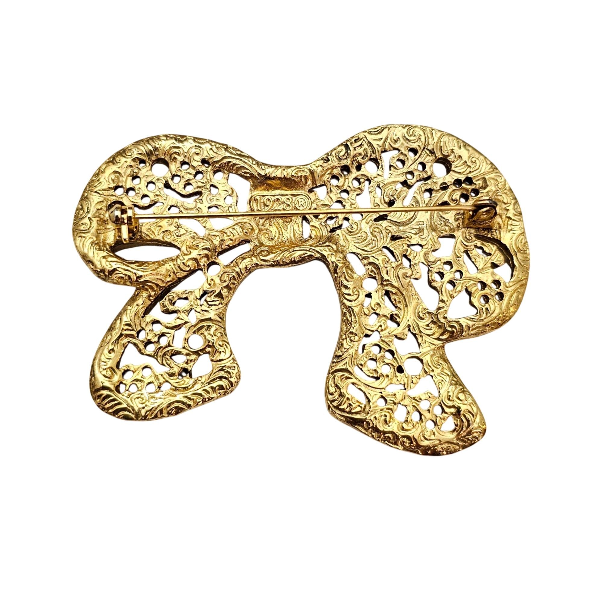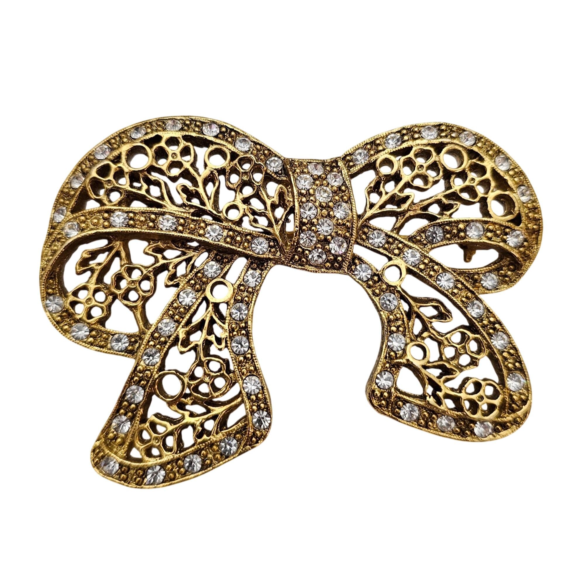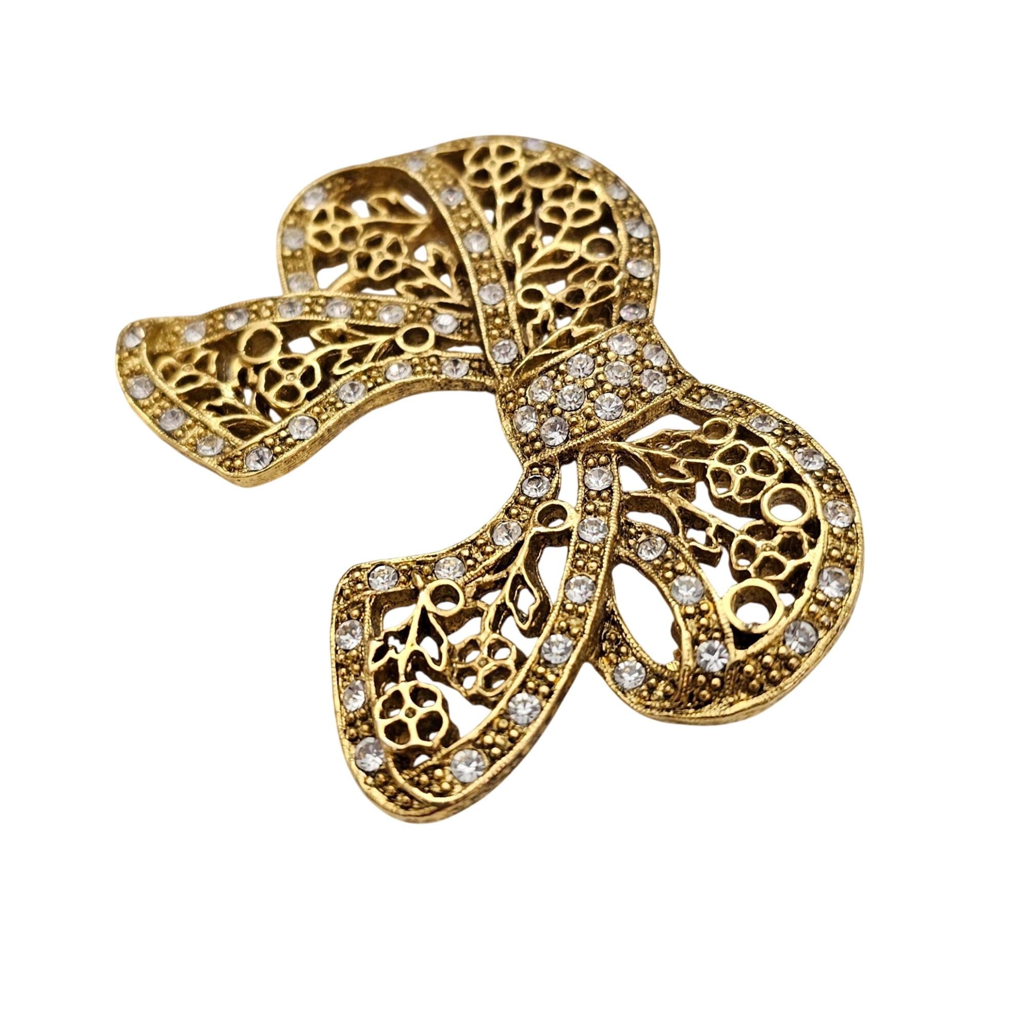 1928 Brand Chunky Filigree Bow Brooch Clear Rhinestone Pin Signed, C860