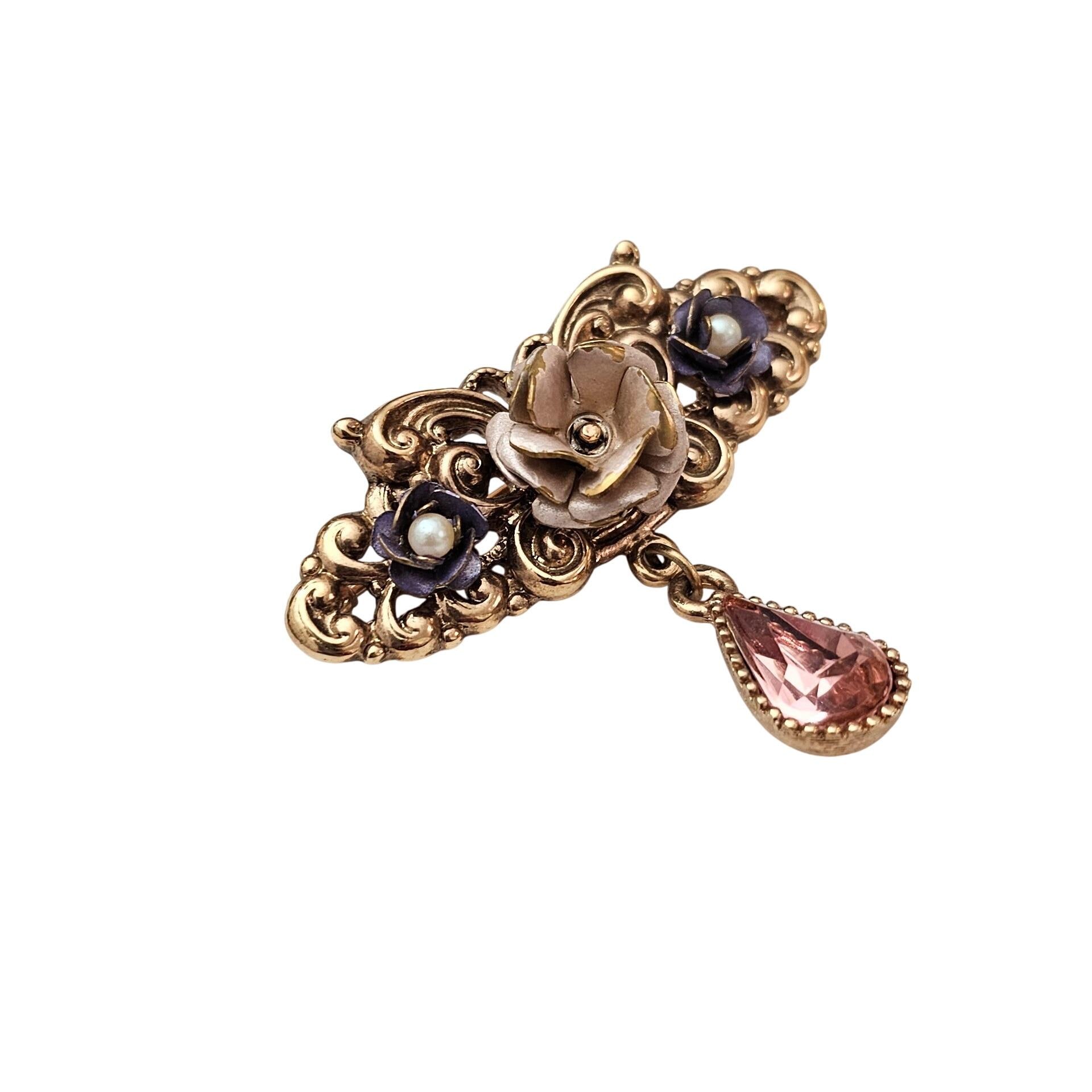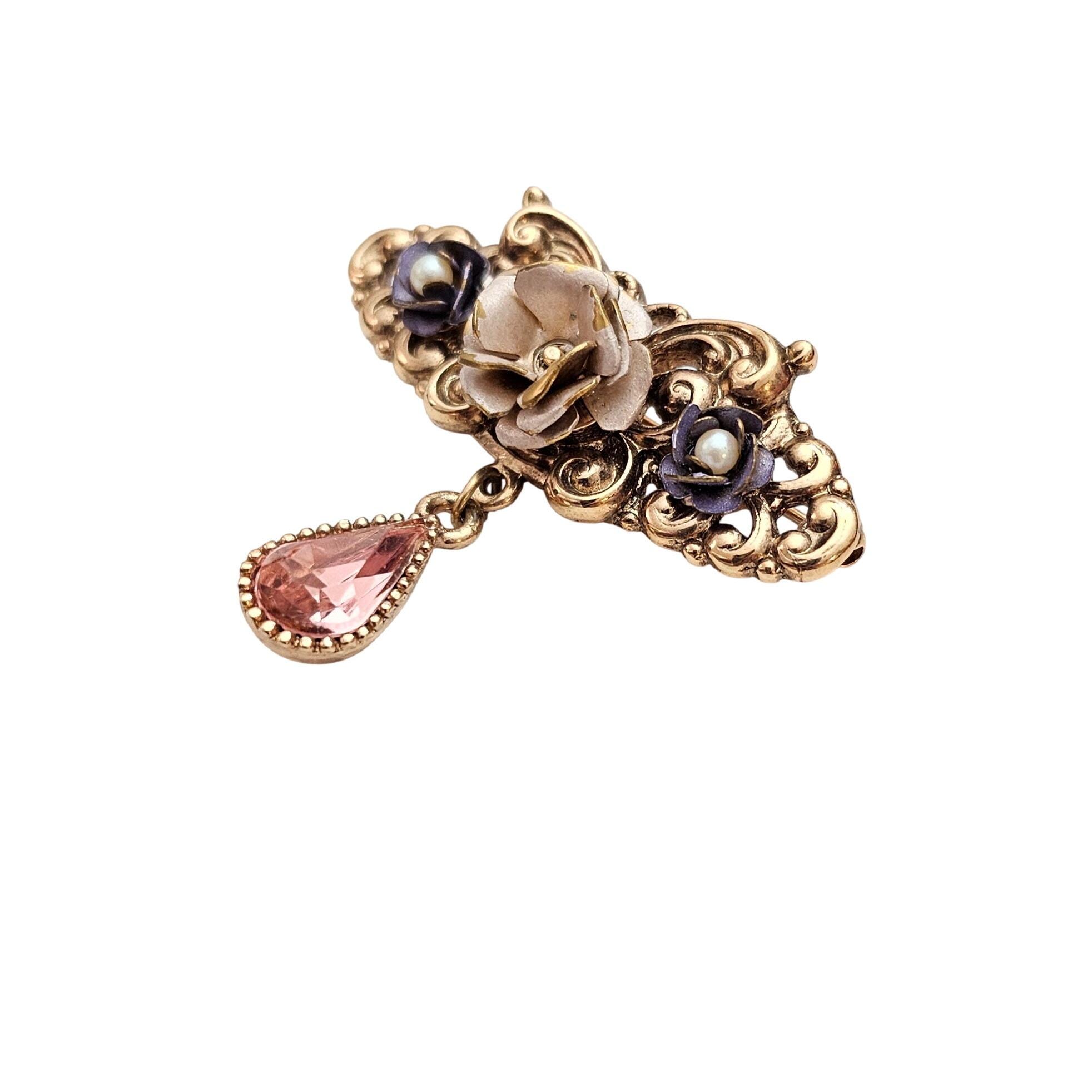 1928 Brand Pink Purple Rose Bar Brooch Faux Pearl Victorian Style Pink Pear Dangle Pin C903