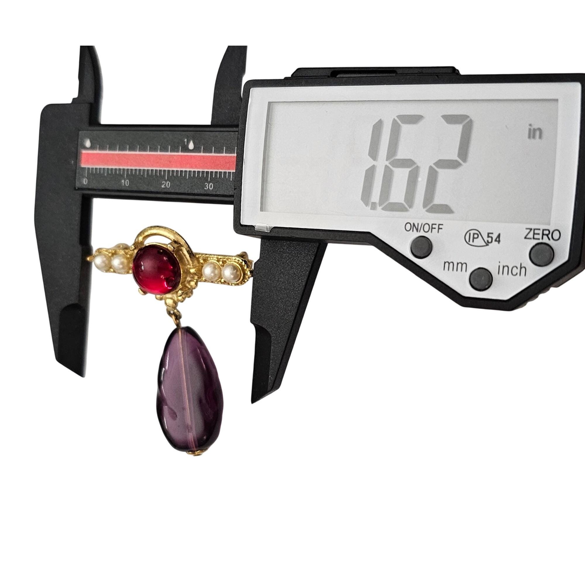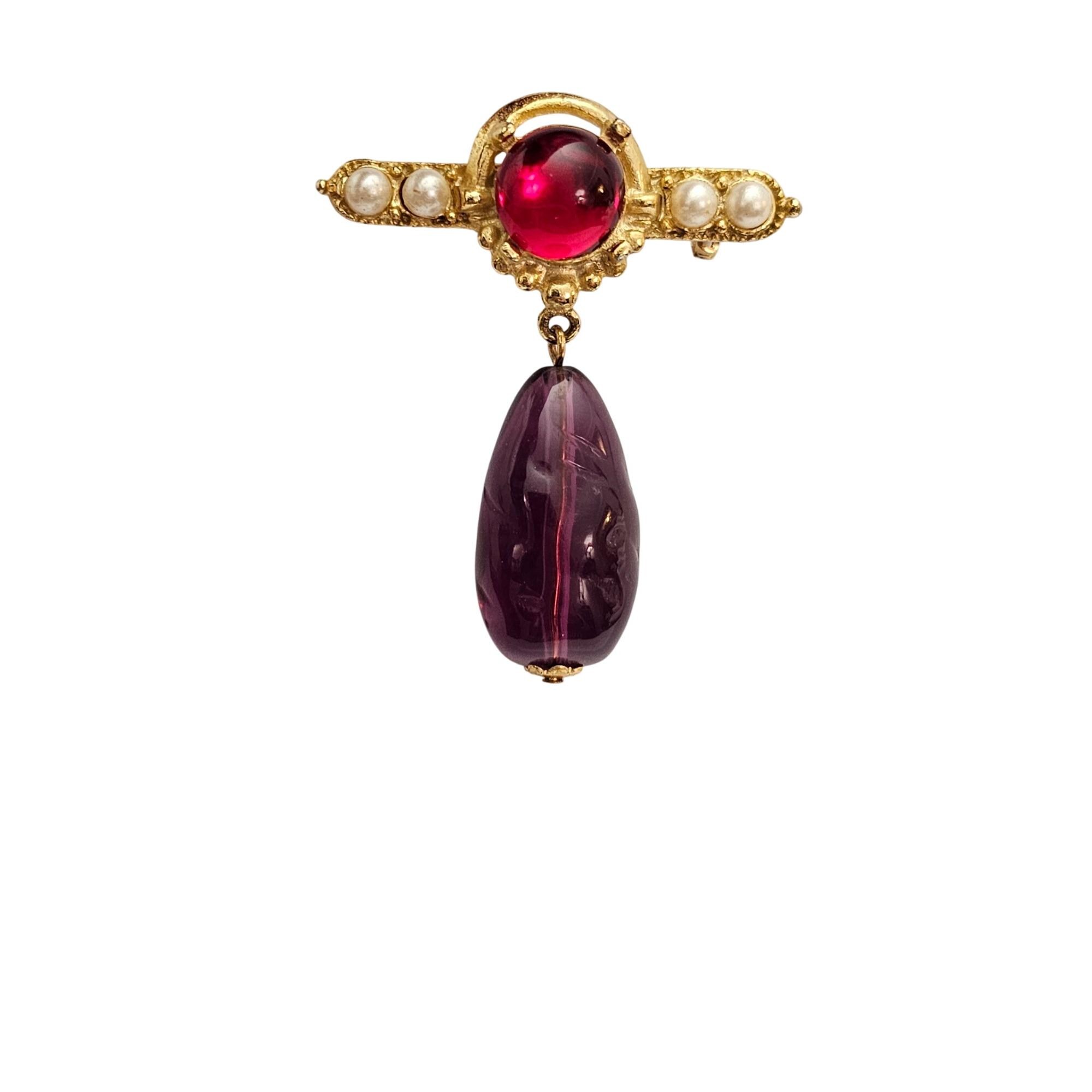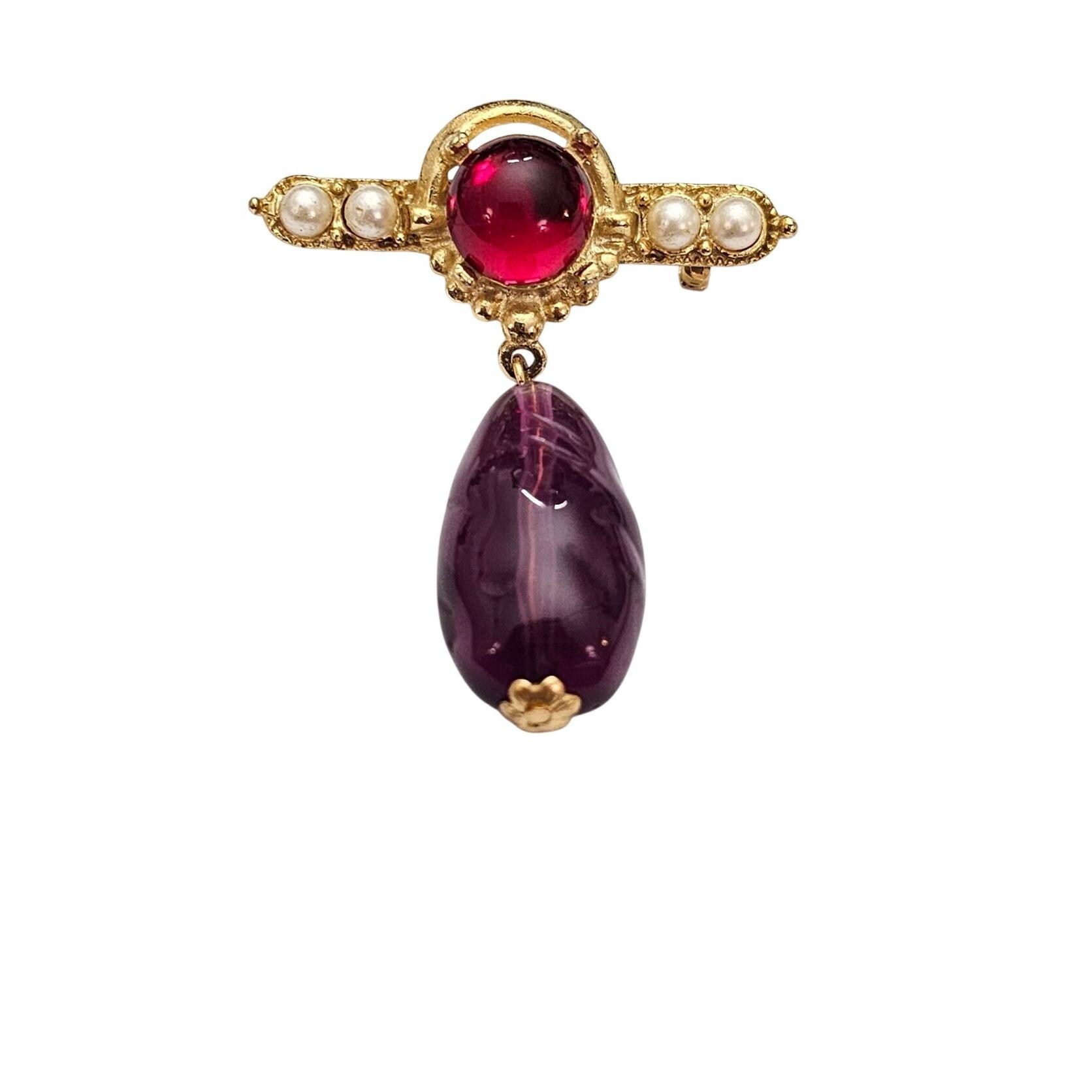 Gold Tone Red Lucite Cabochon Purple Dangle Bar Brooch Pin C865
