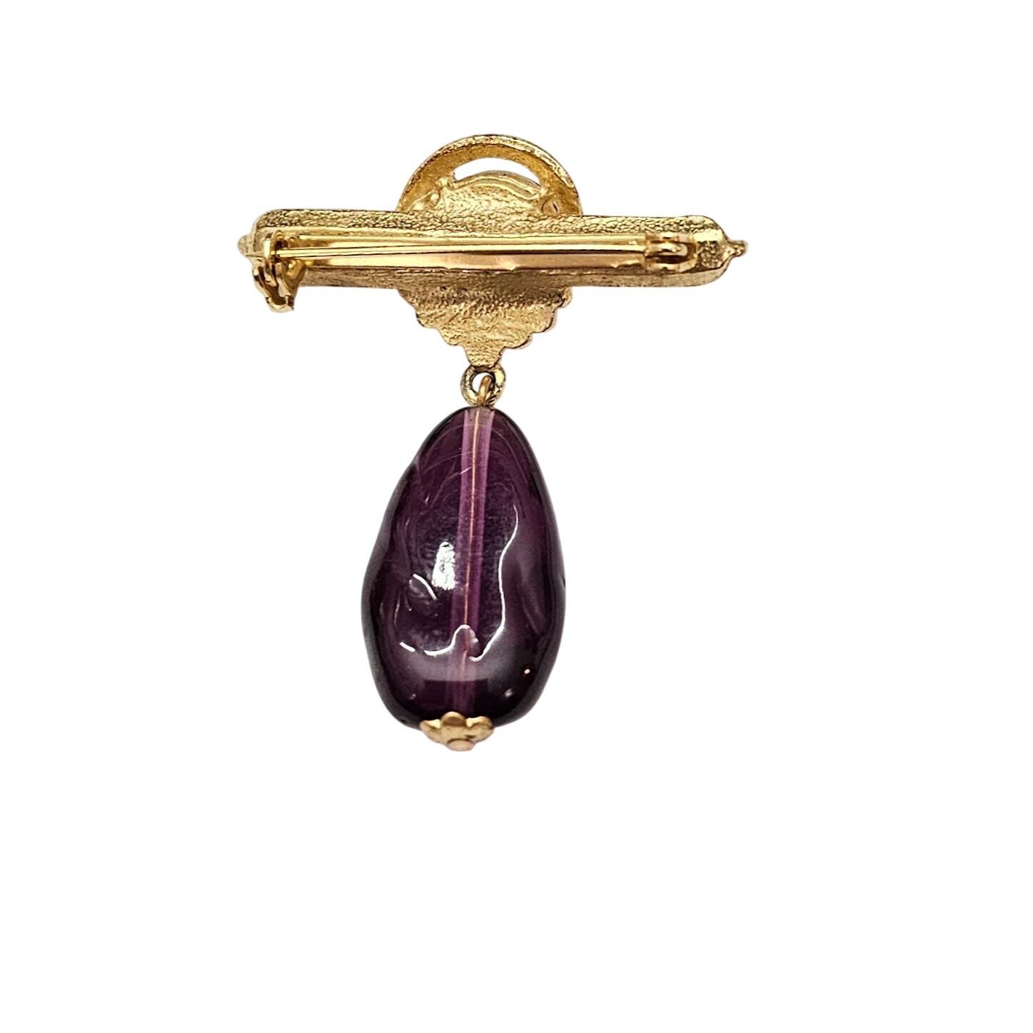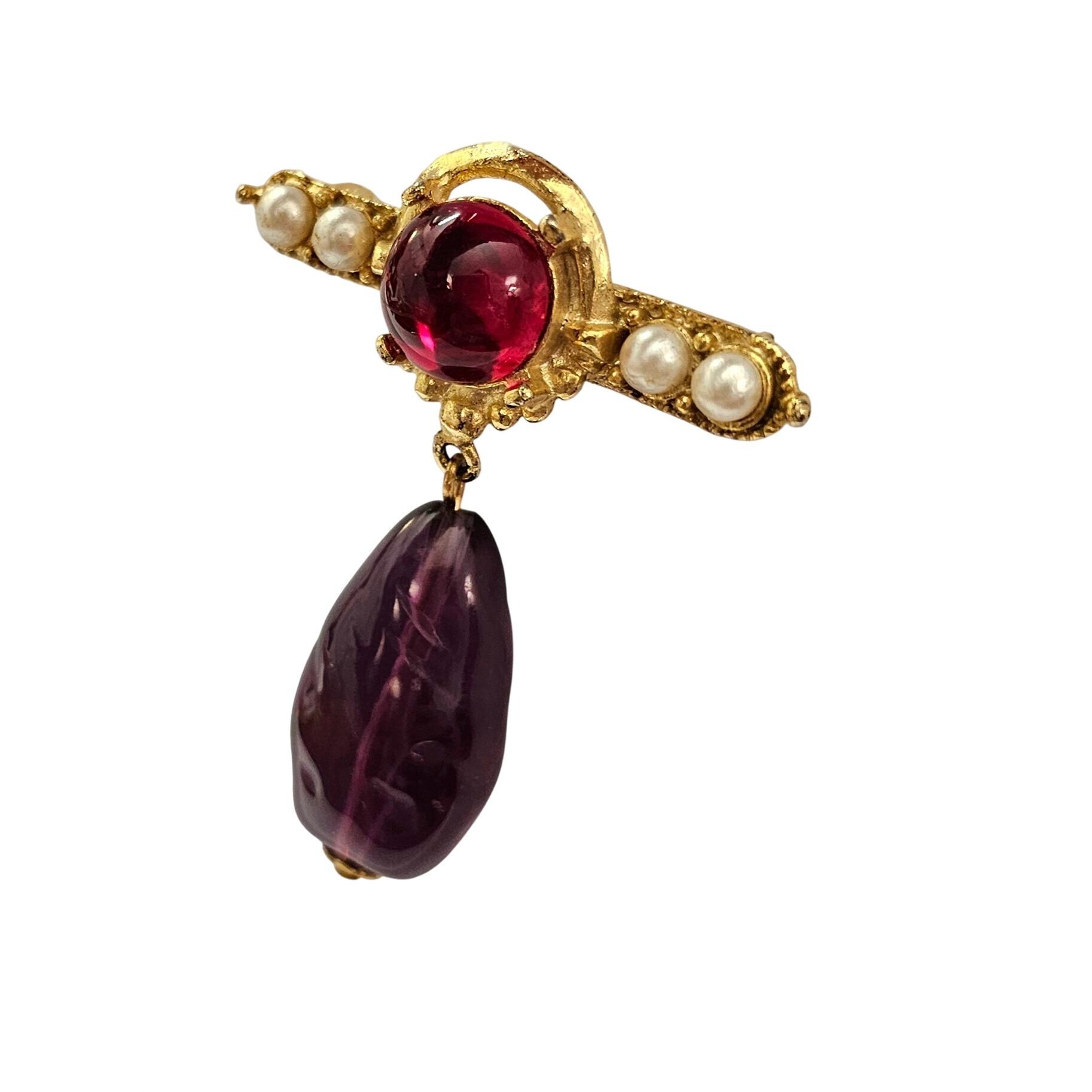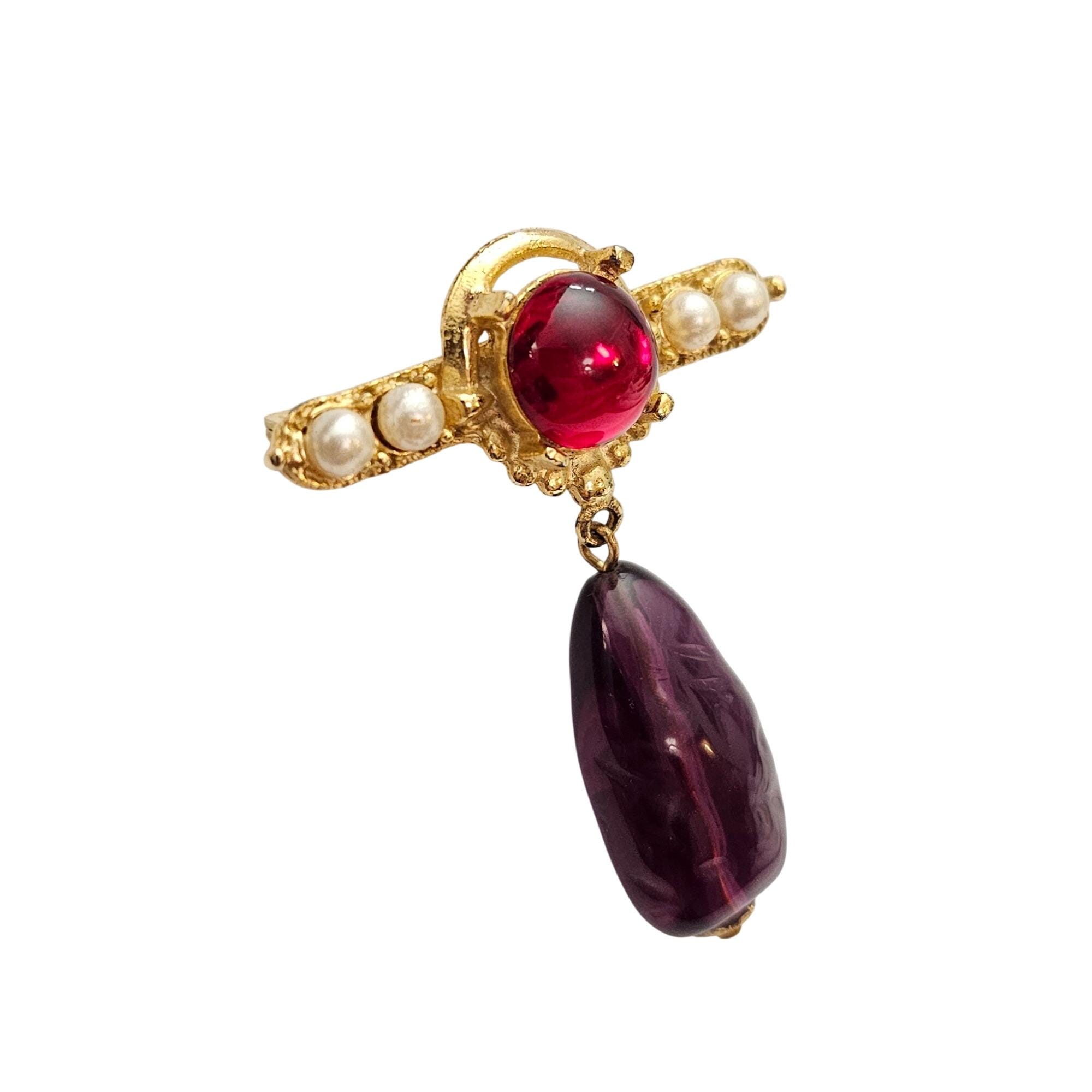 Gold Tone Red Lucite Cabochon Purple Dangle Bar Brooch Pin C865