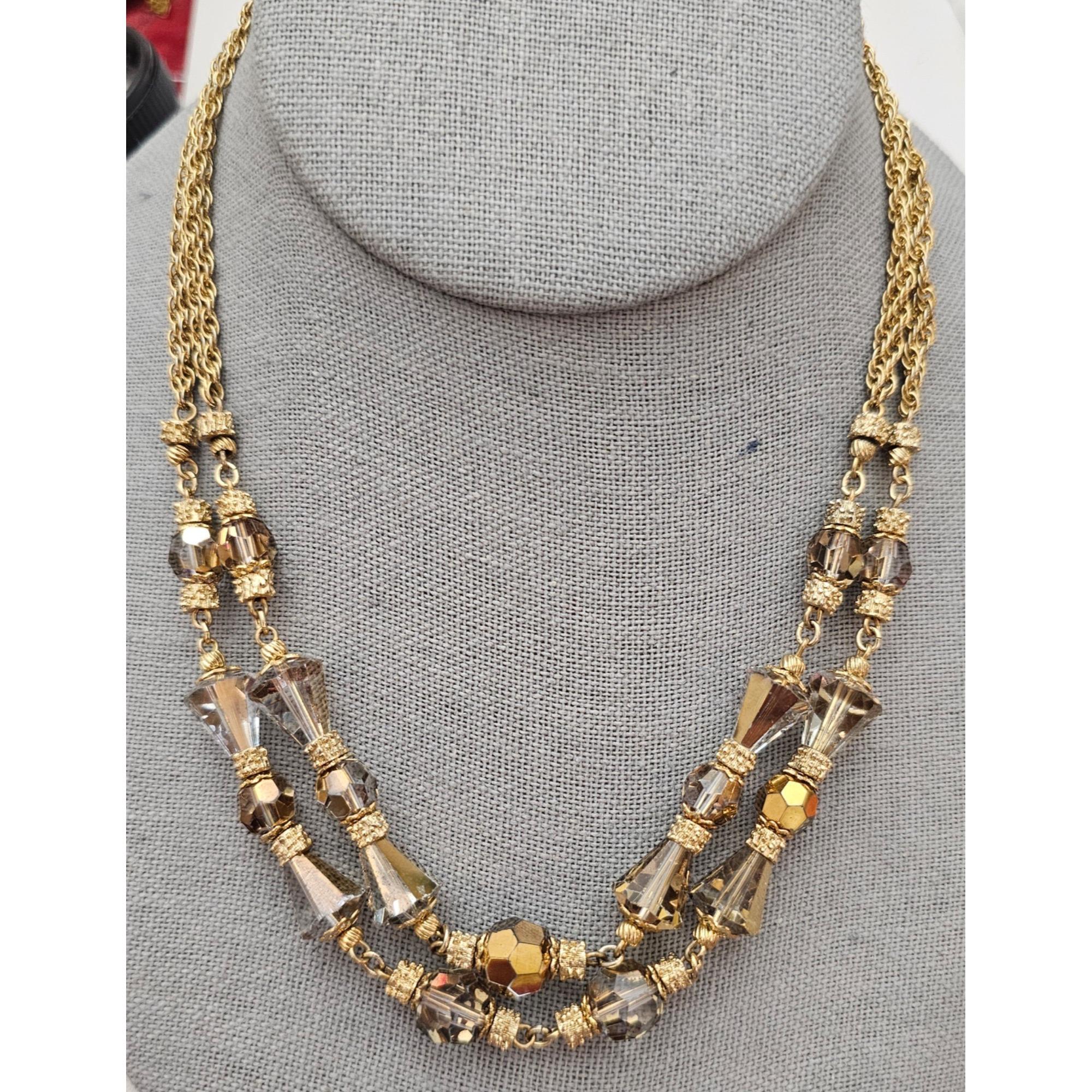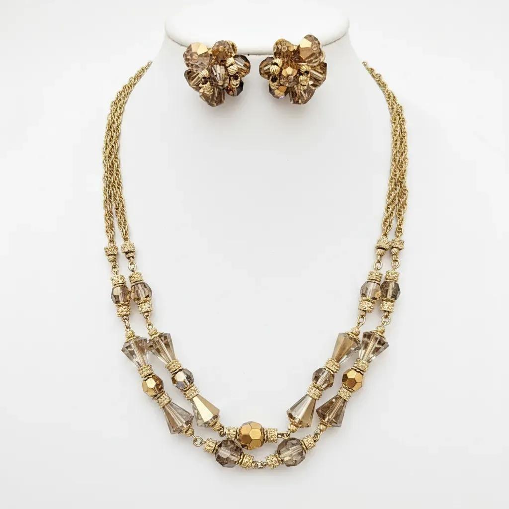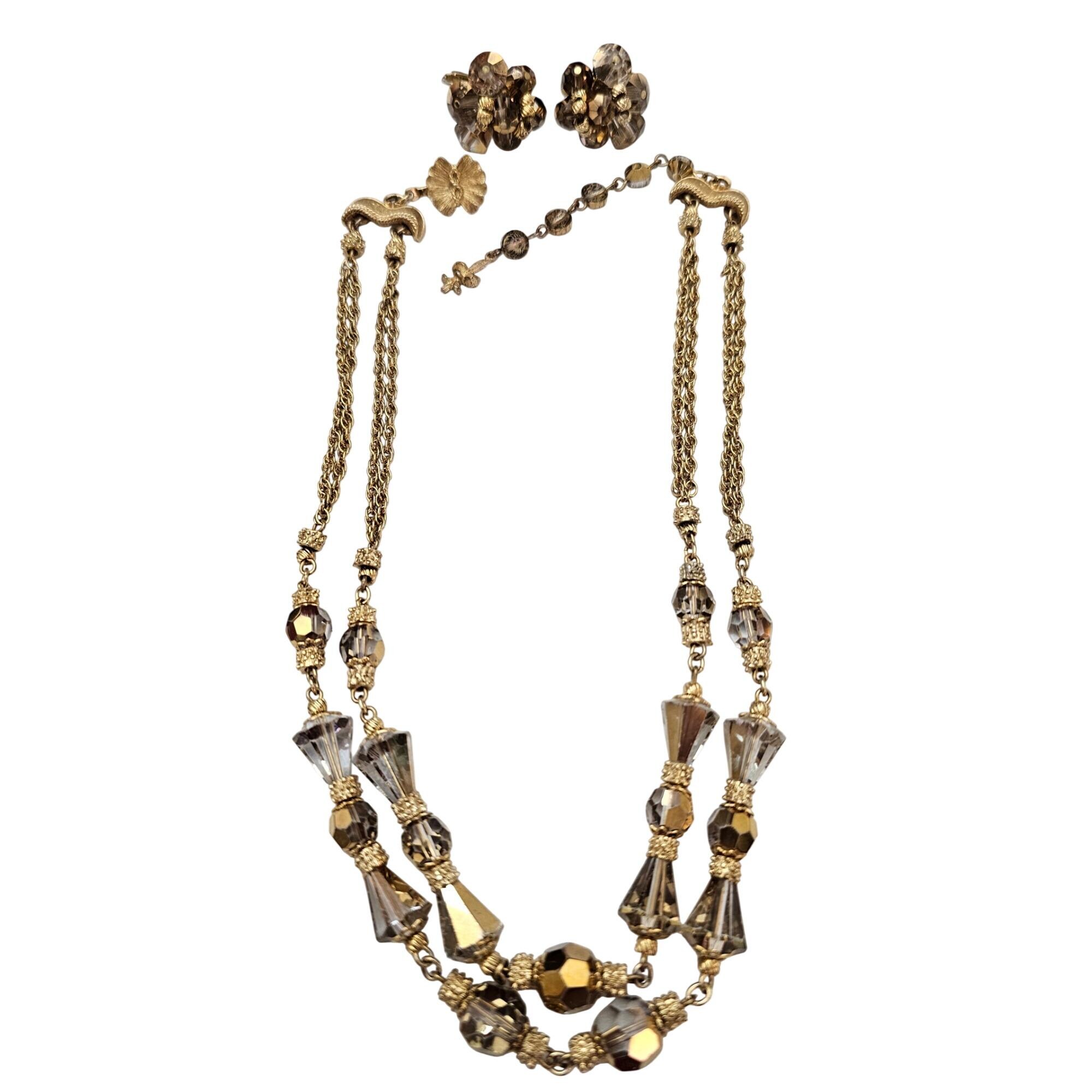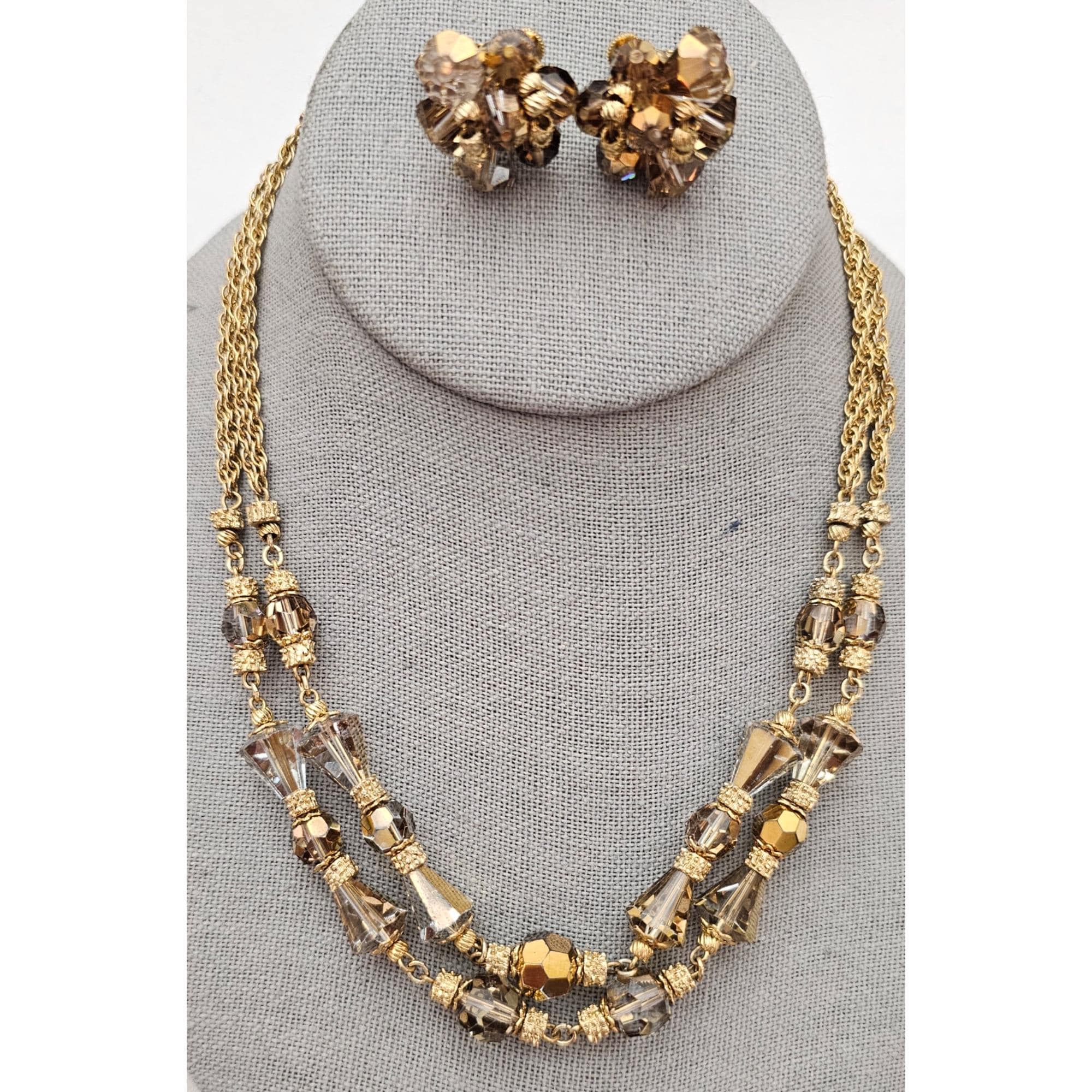 Vendome AB Gold Faceted Necklace Clip On Earrings Set Vintage Double Strand Shepard Hook Signed, C911