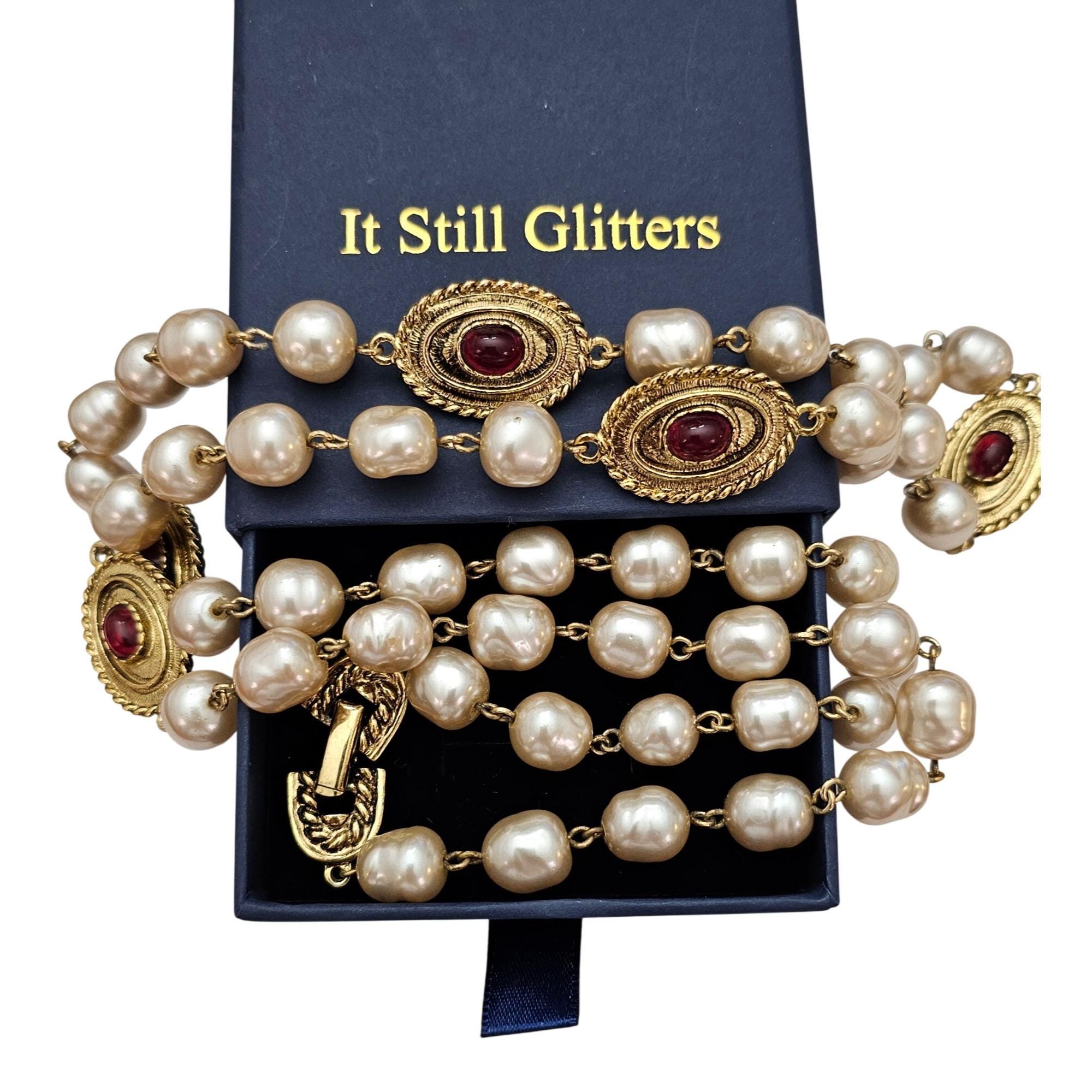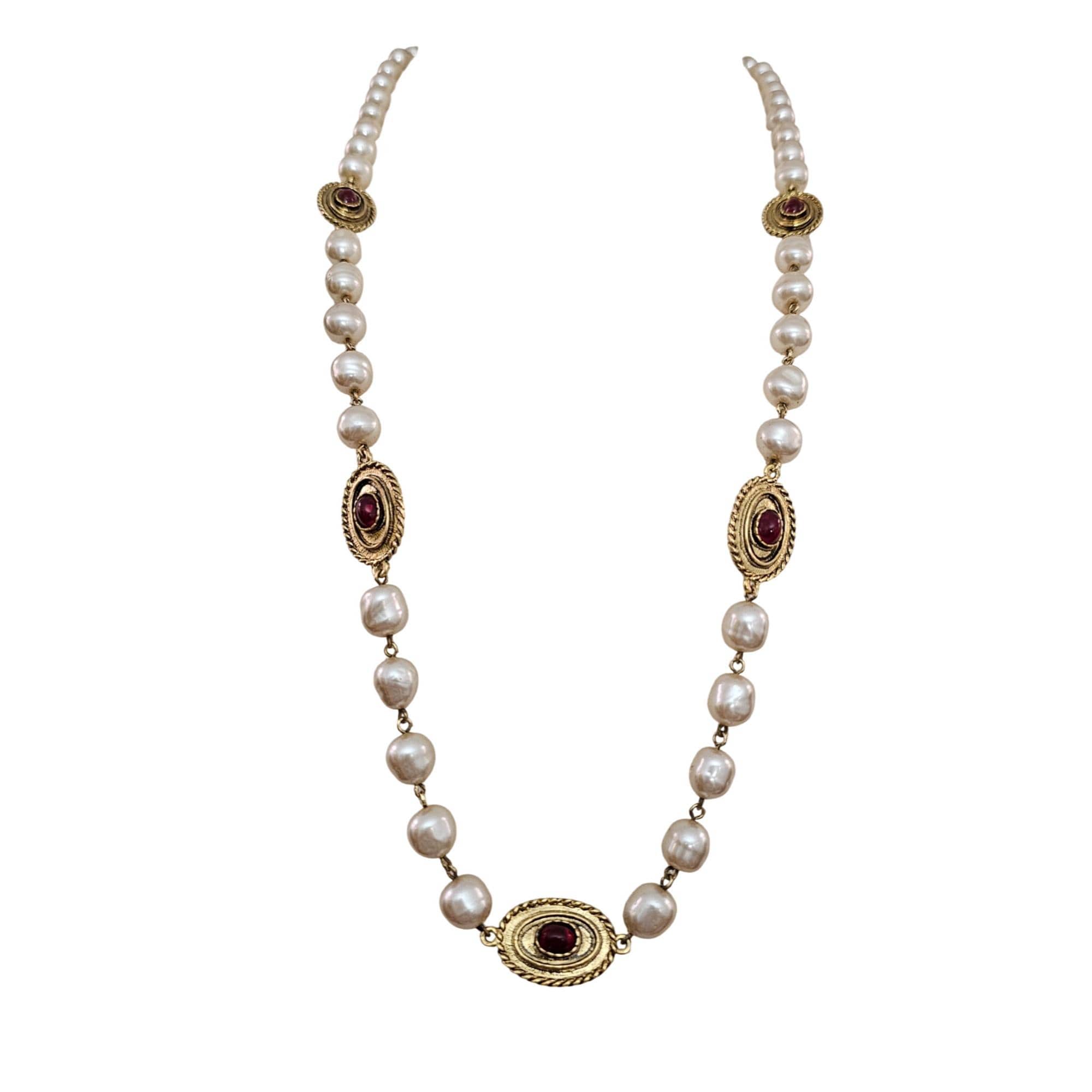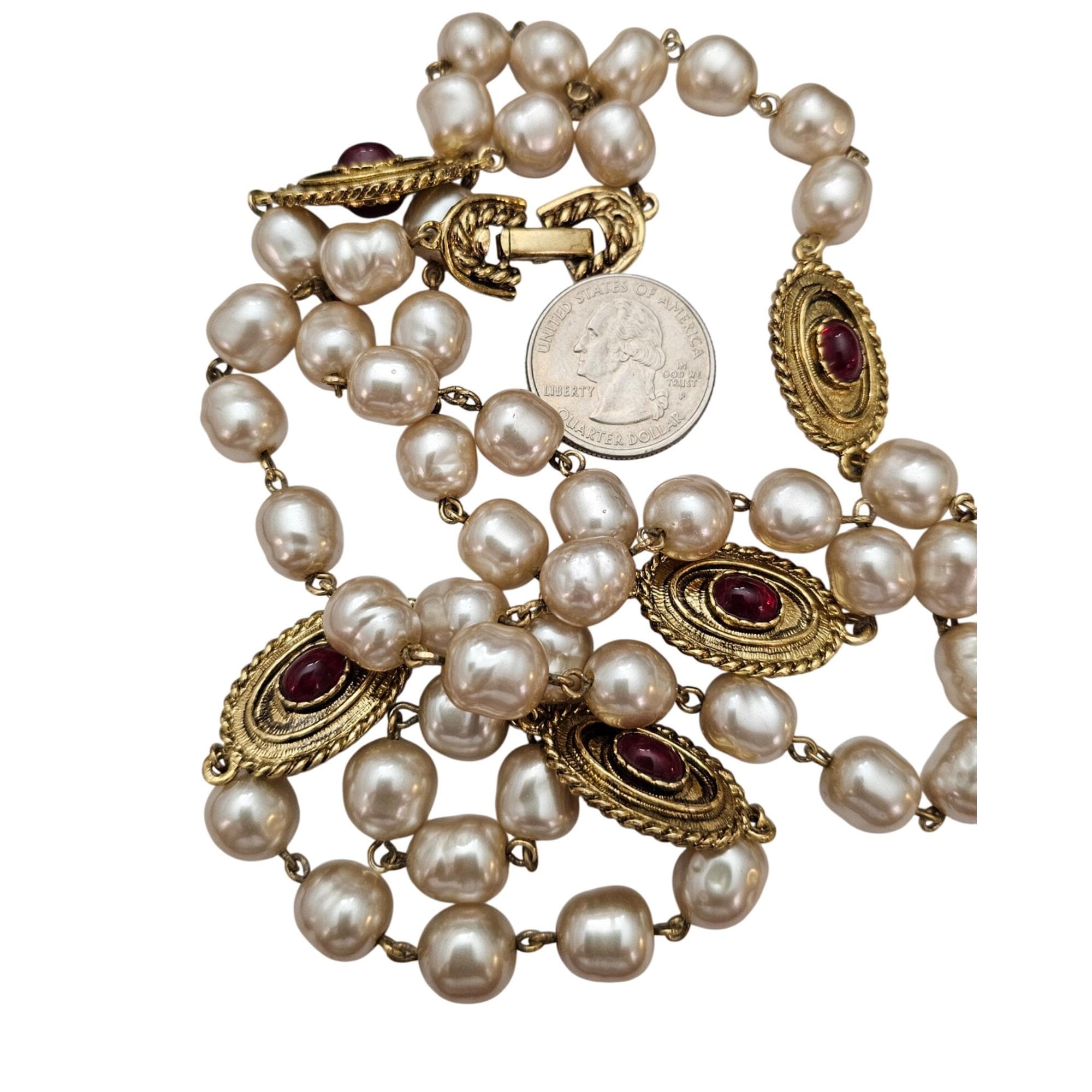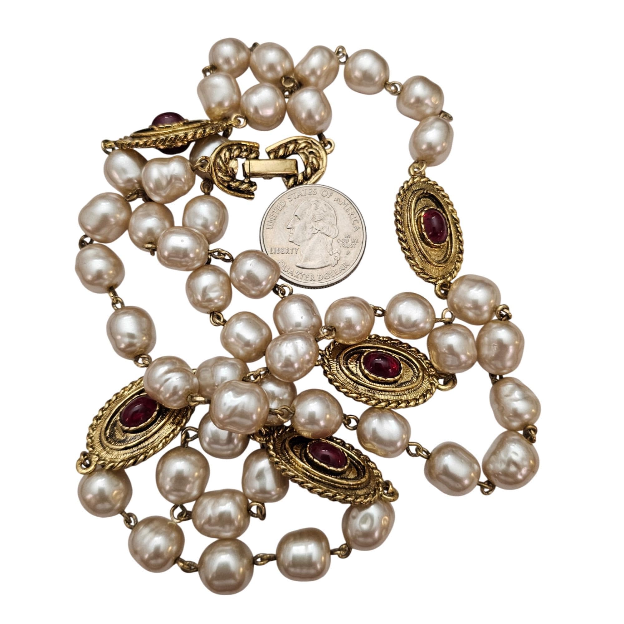 Vintage Glass Faux Pearl Chain, Gold Tone Red Glass Cab Oval Stations Necklace Fold Over Clasp C889