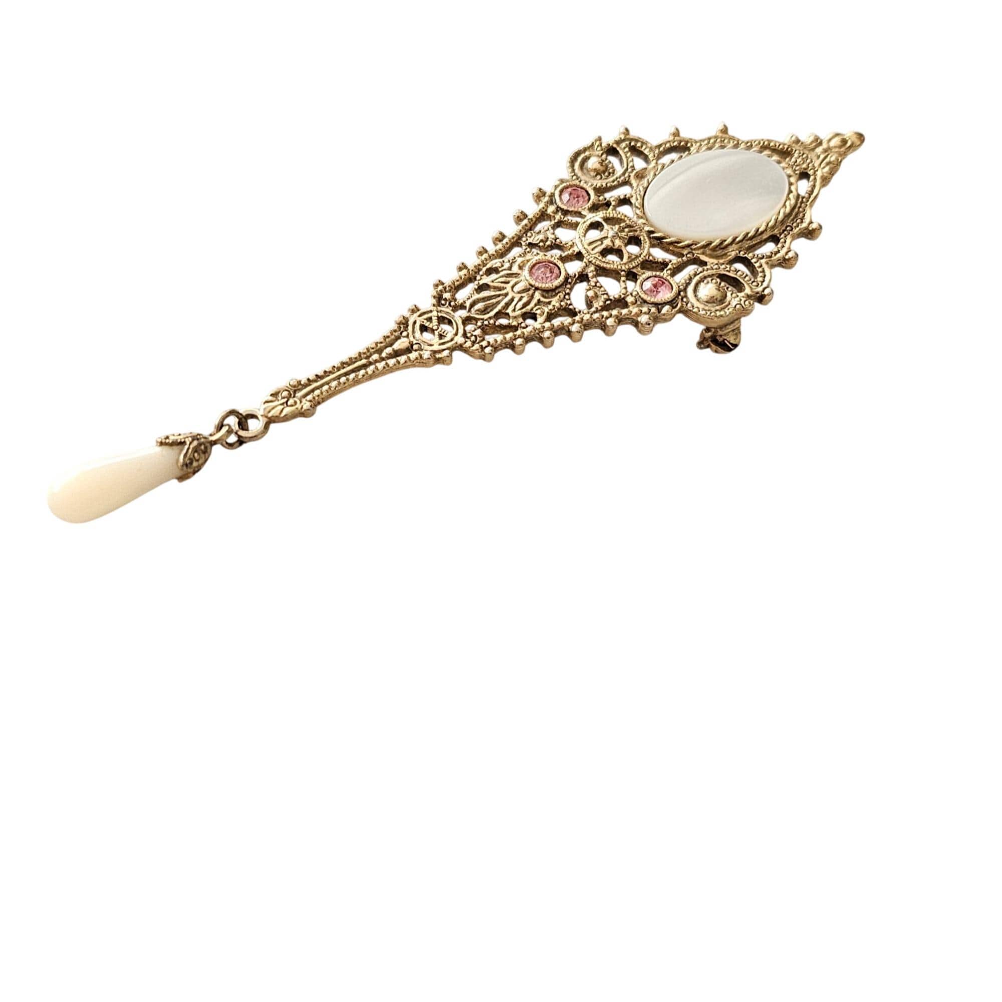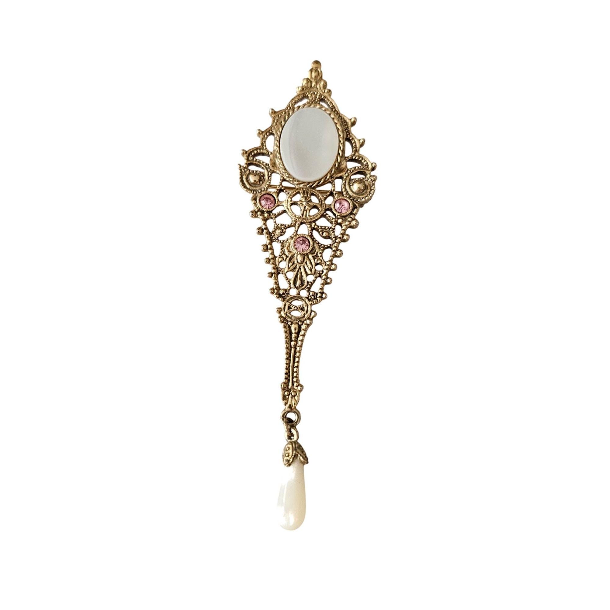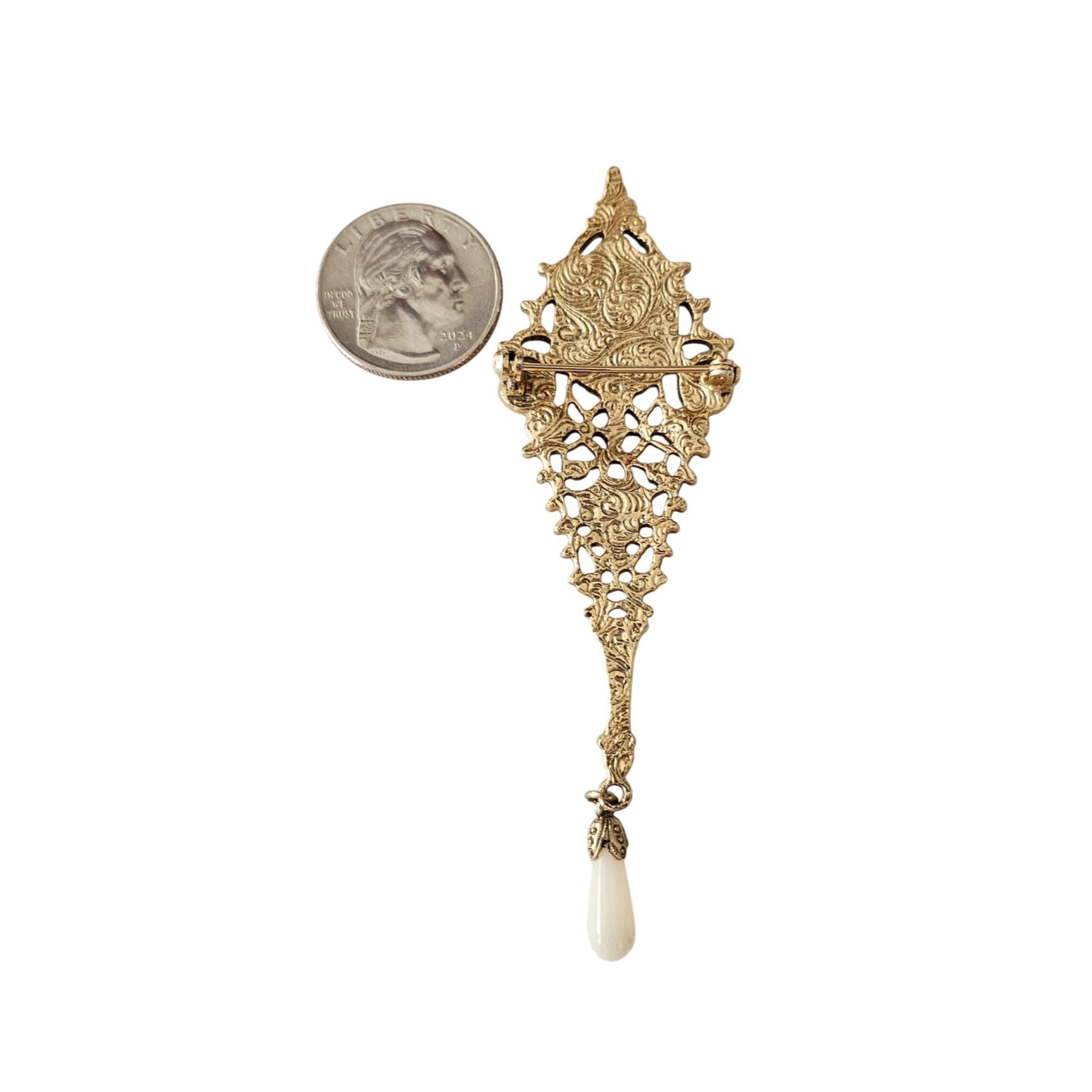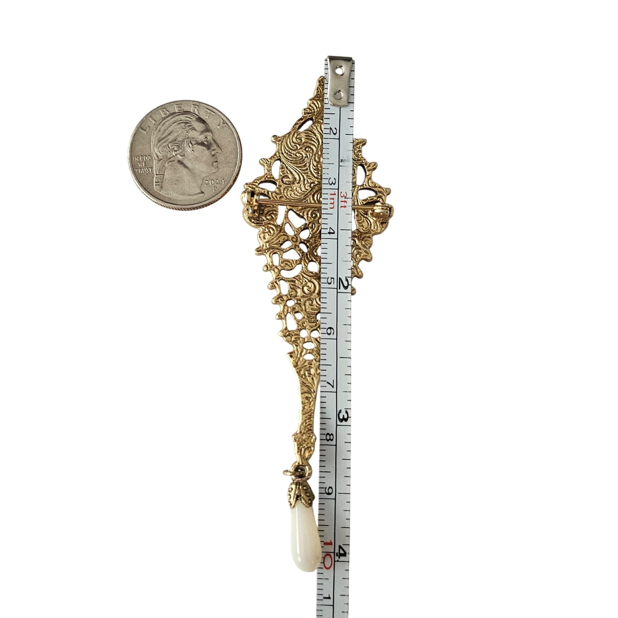 1928 Brand Victorian Style Brooch Fleur De Lis Shell MOP Long Open, Dangle Pin J194