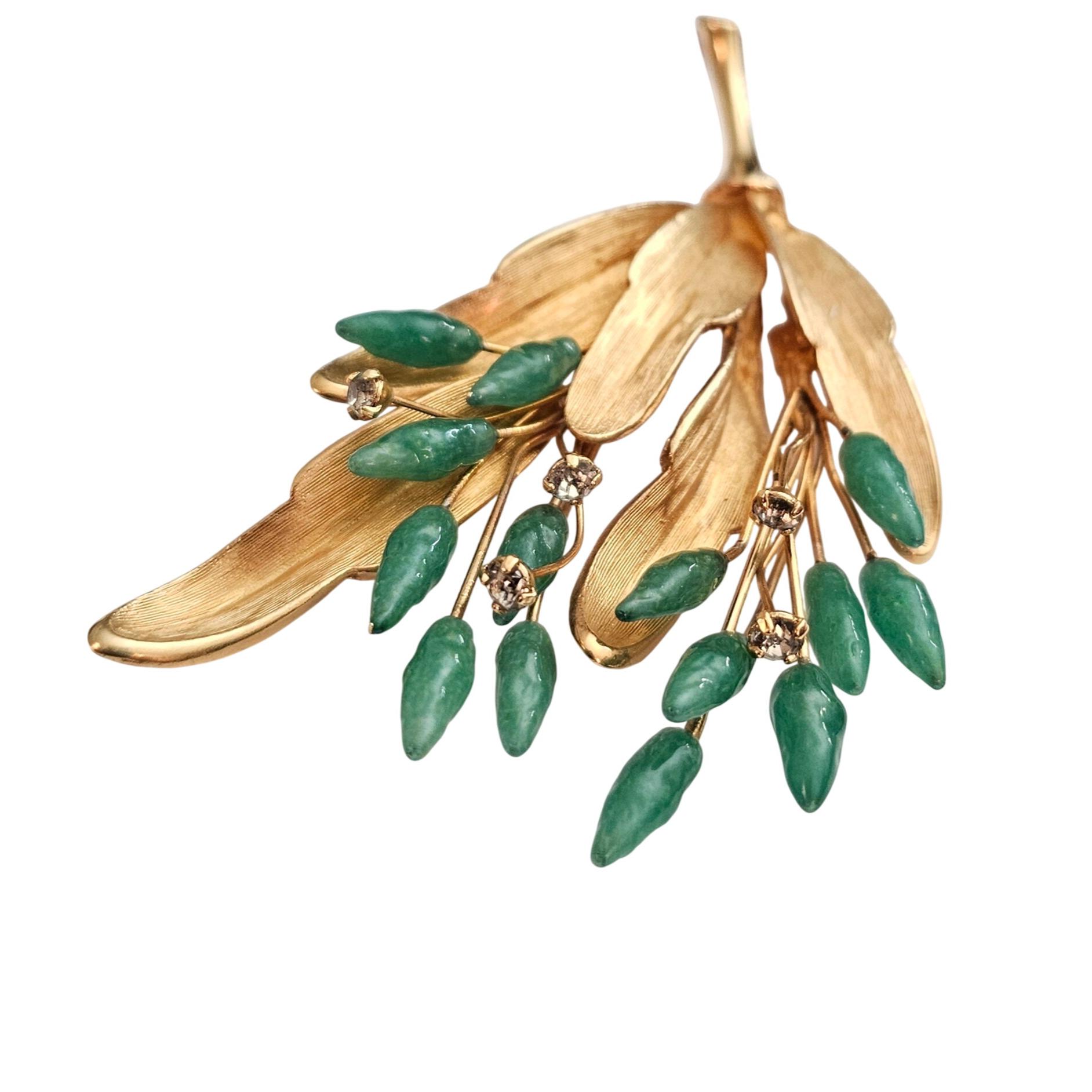 Green Glass Lamp Work Flower Frond Leaf Brooch Clear Rhinestone Pin C944