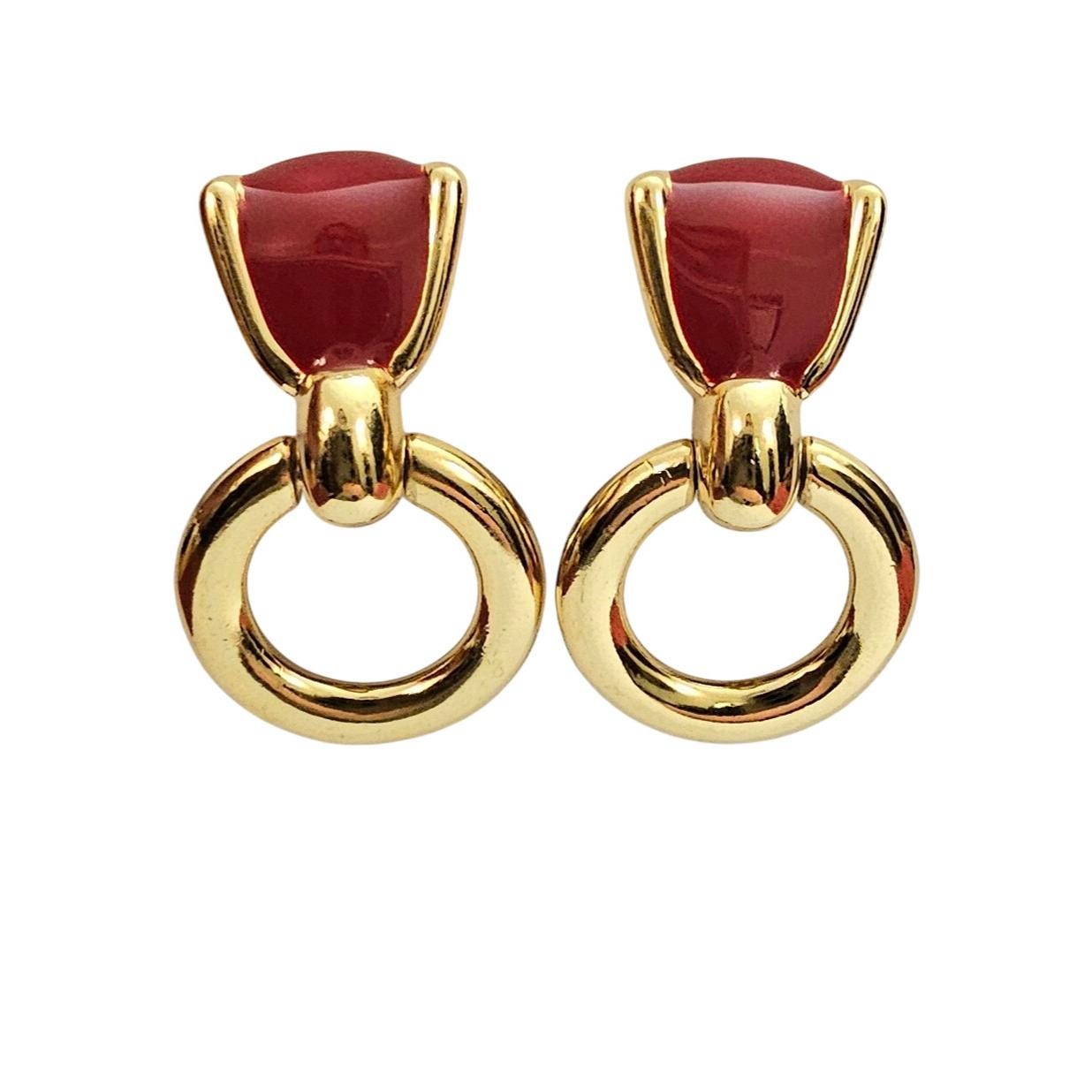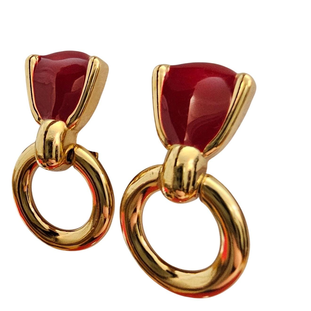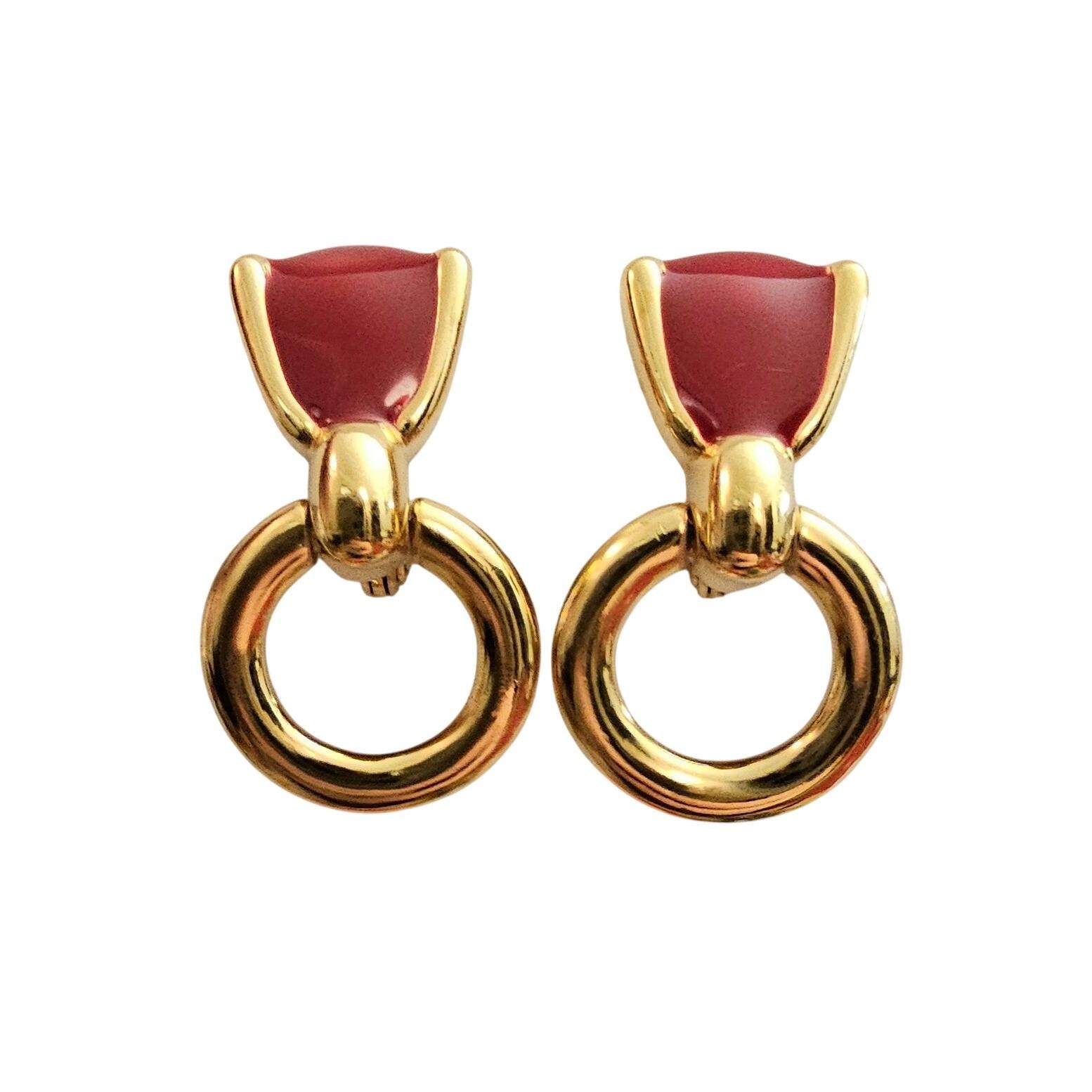 Monet Wine Enamel Door Knocker Clip On Maroon Gold Tone Earrings Signed, C941