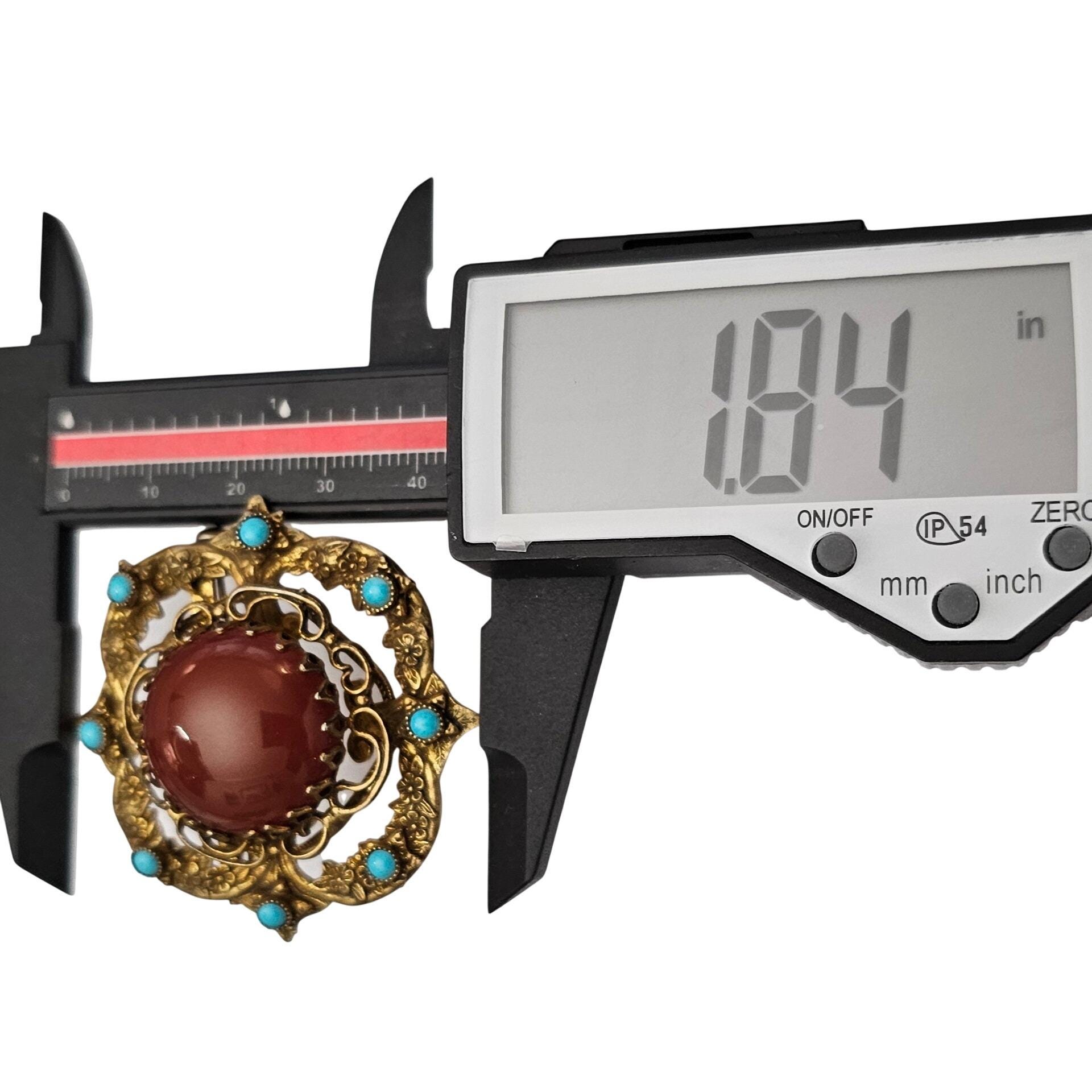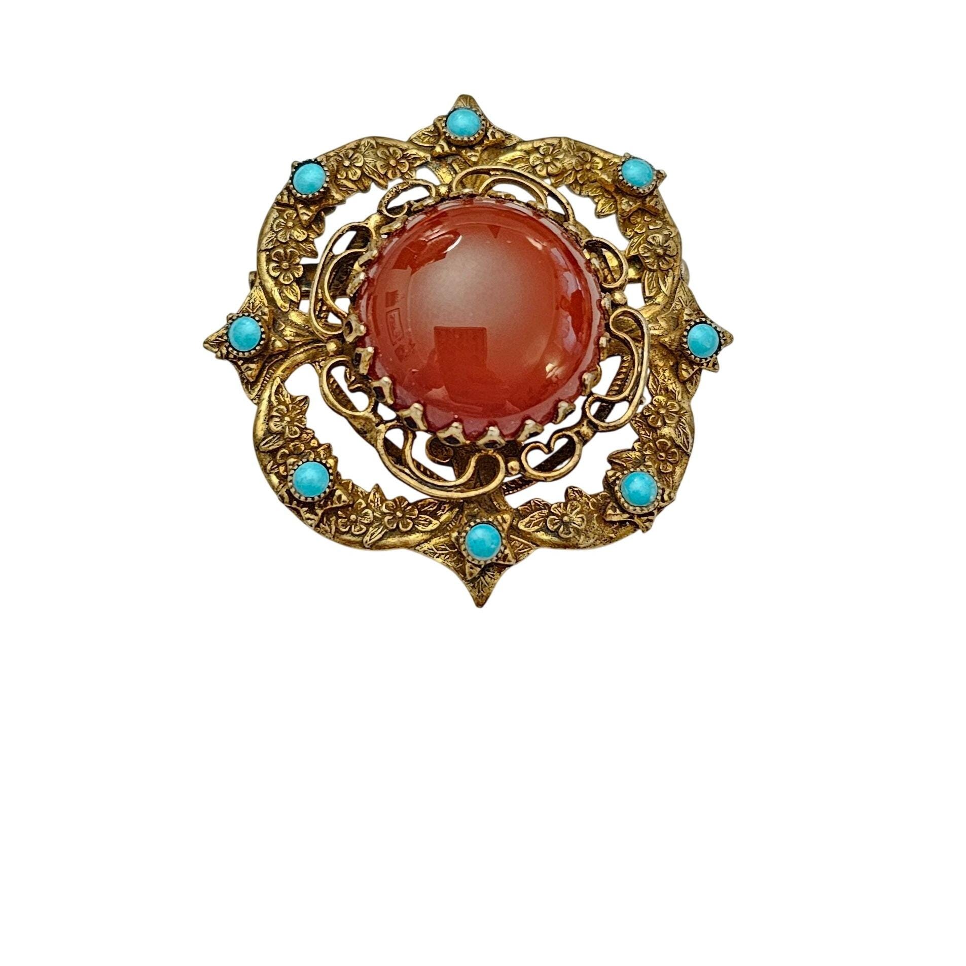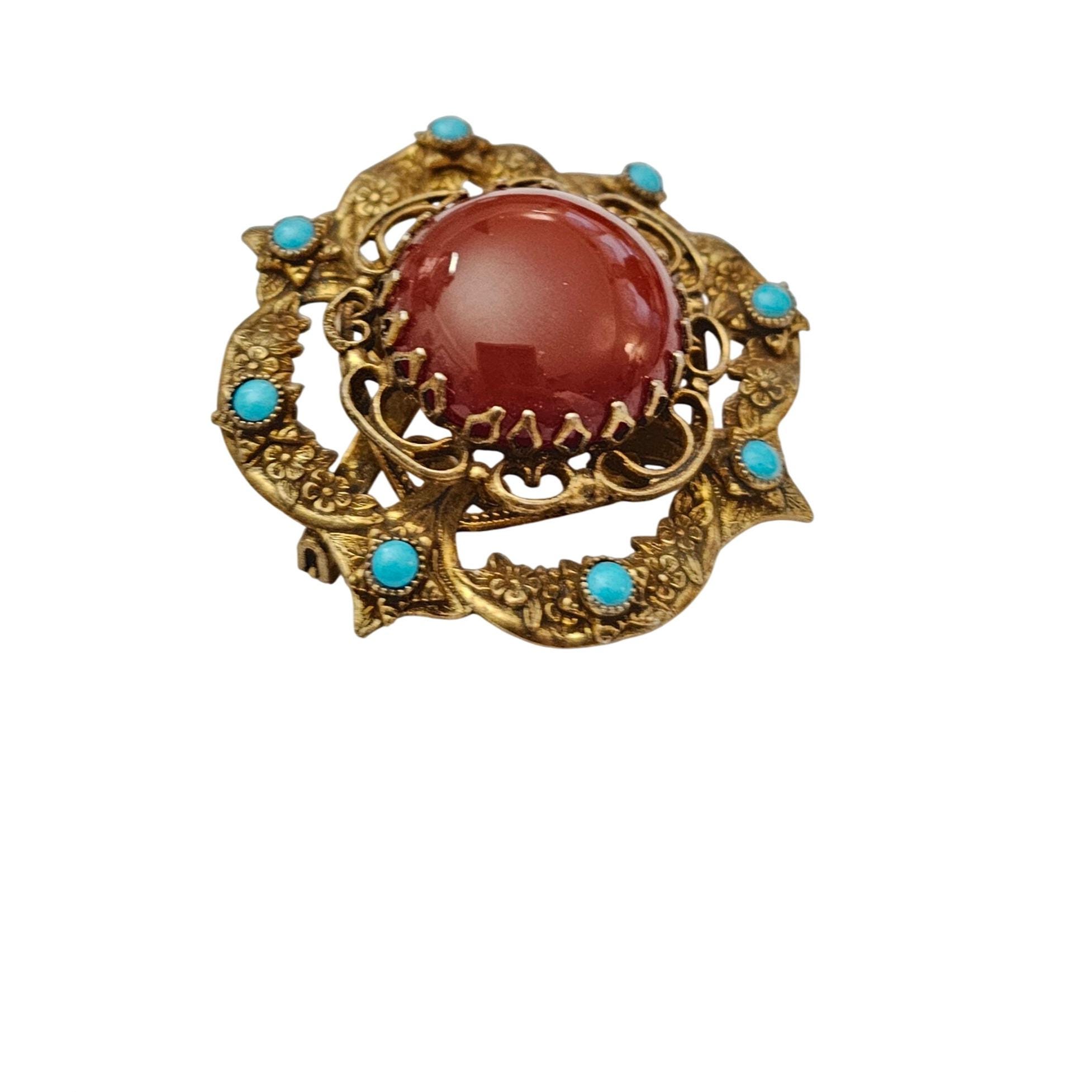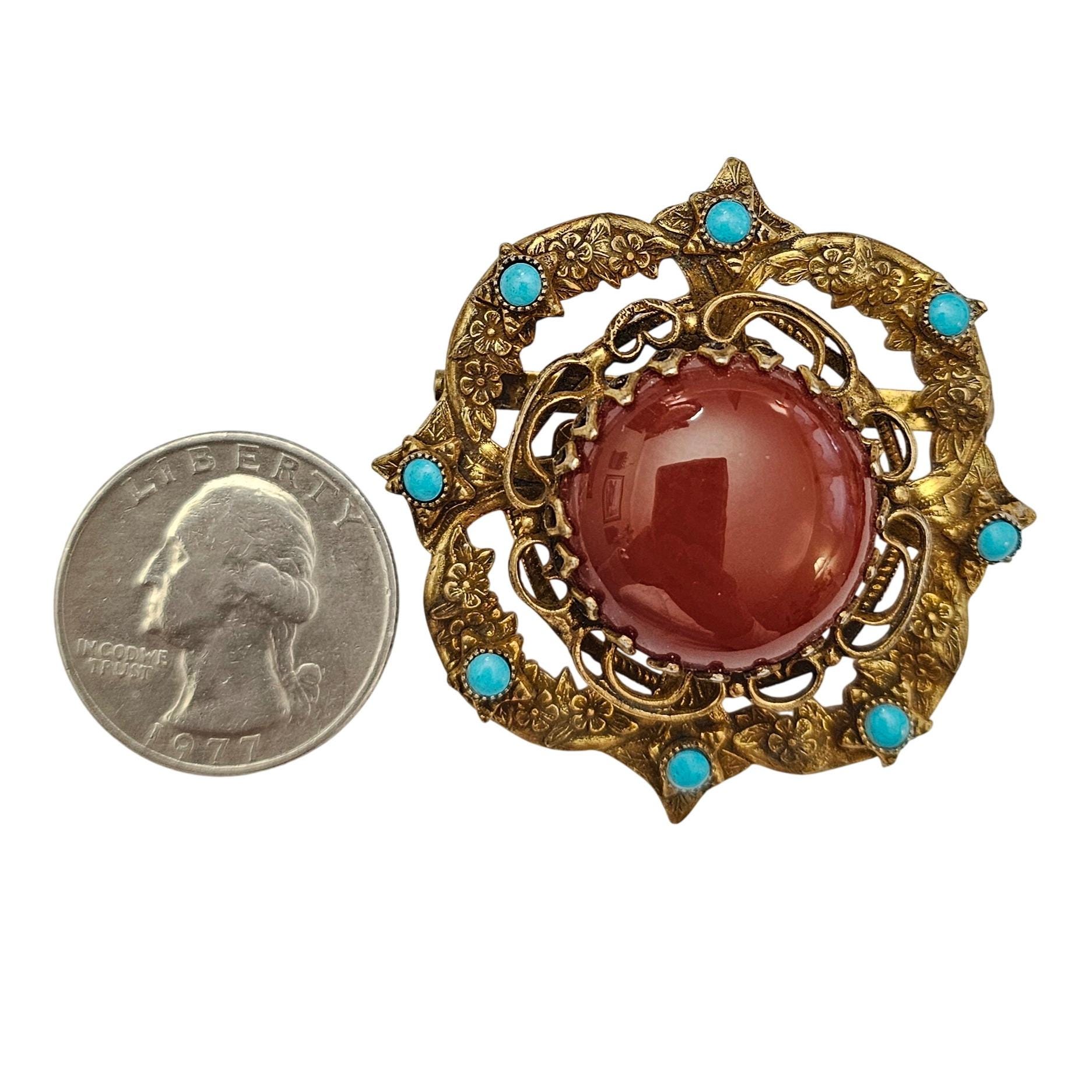 Sandor Cornelian Glass Cab, Turquoise Rhinestone Filigree Nouveau Style Pin Signed, C919