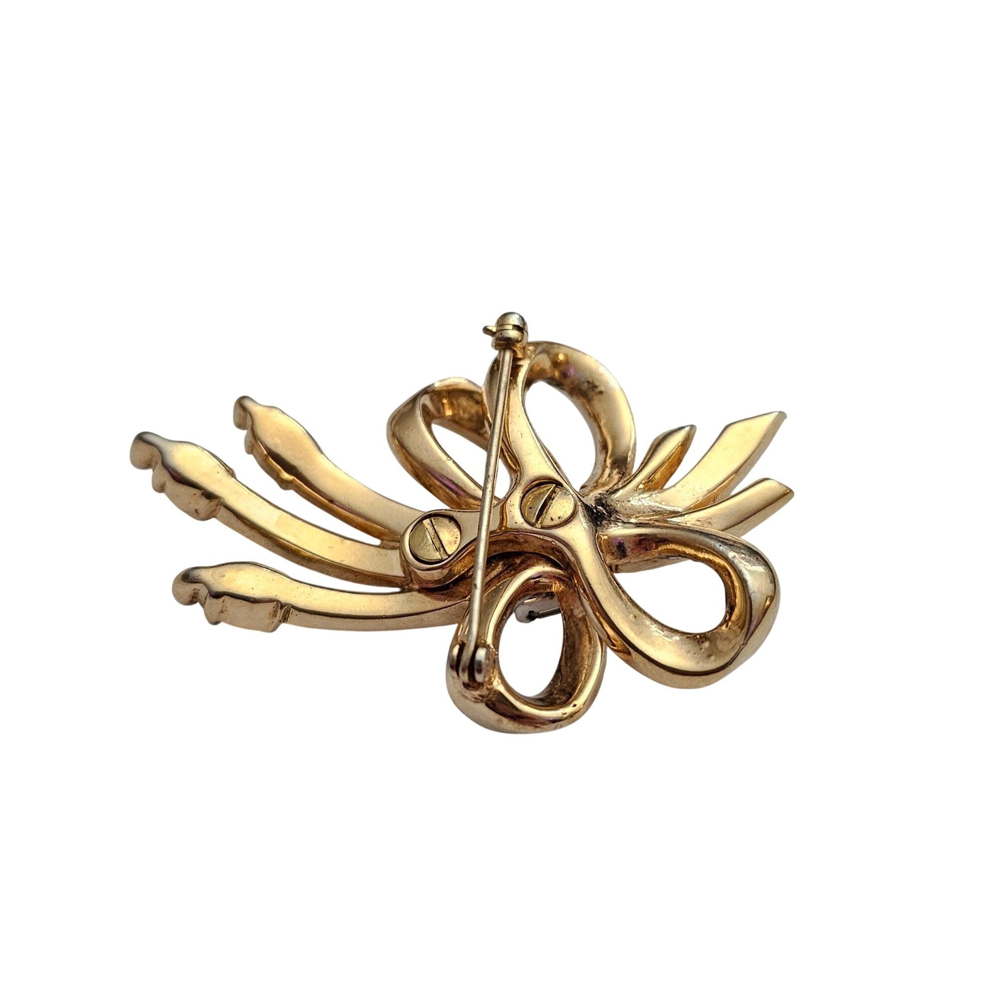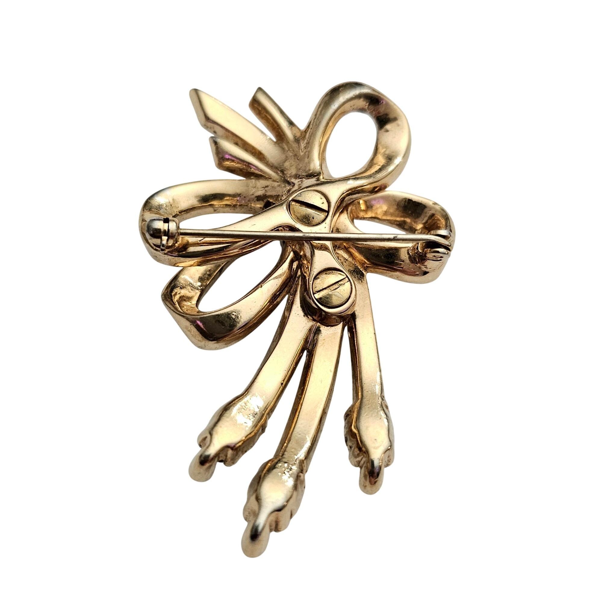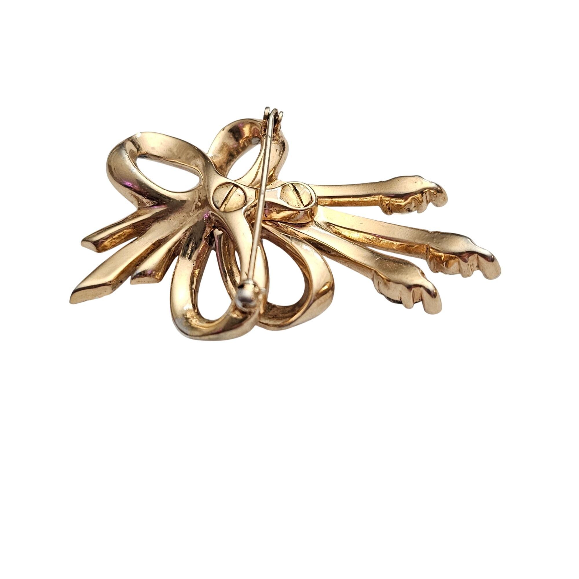 Gold Tone Rhinestone Bow Brooch Screw Construction H Vintage Designer Pin C963