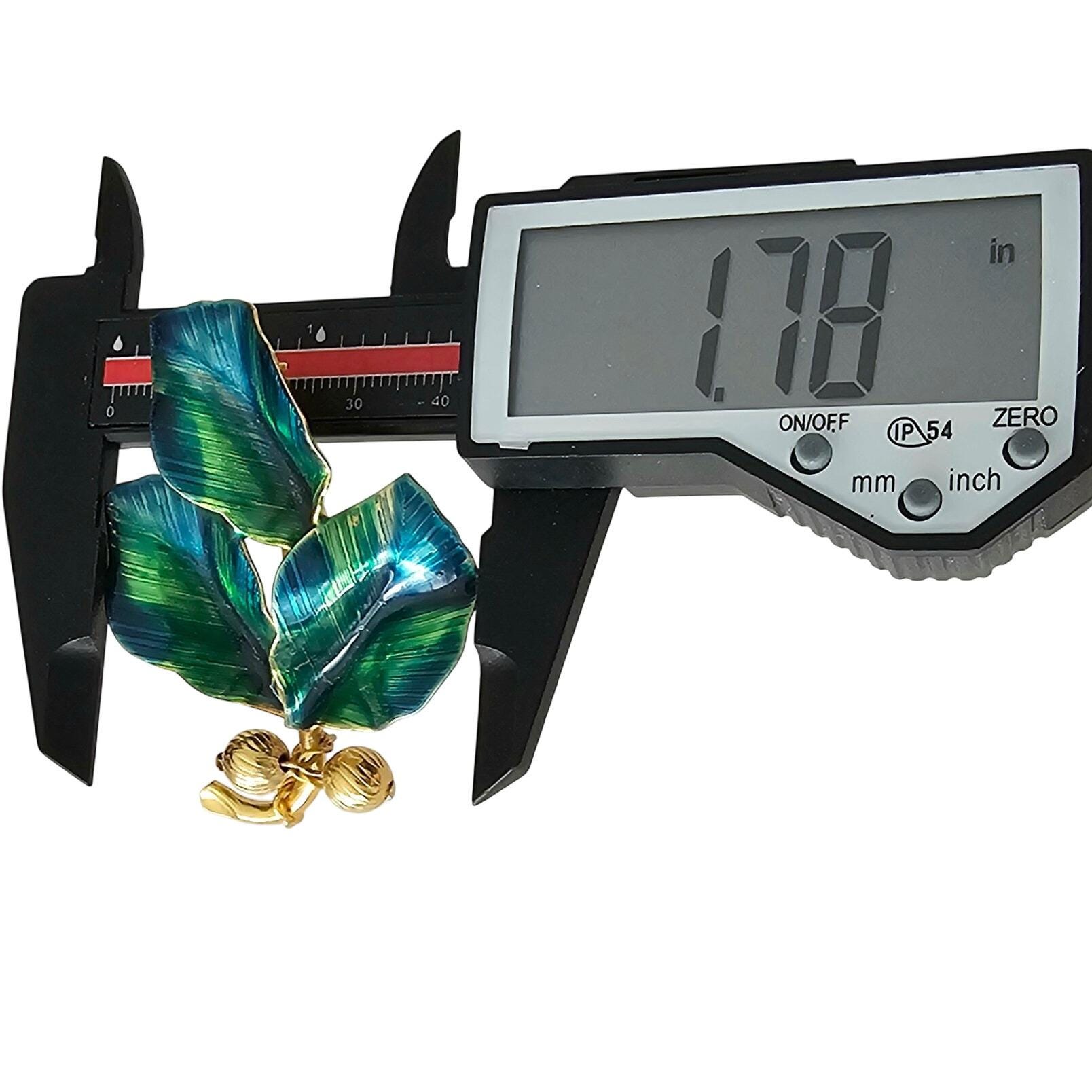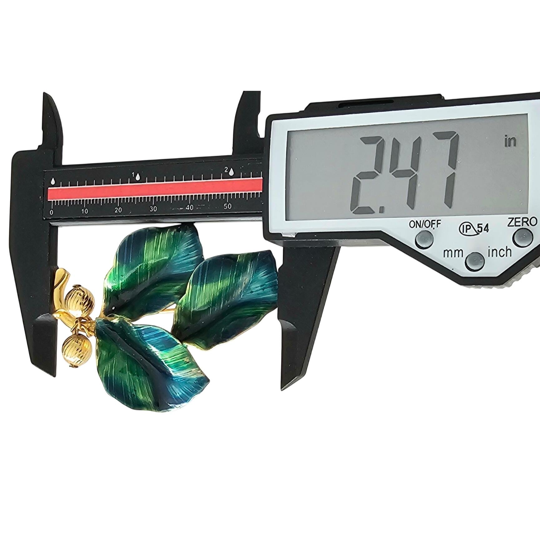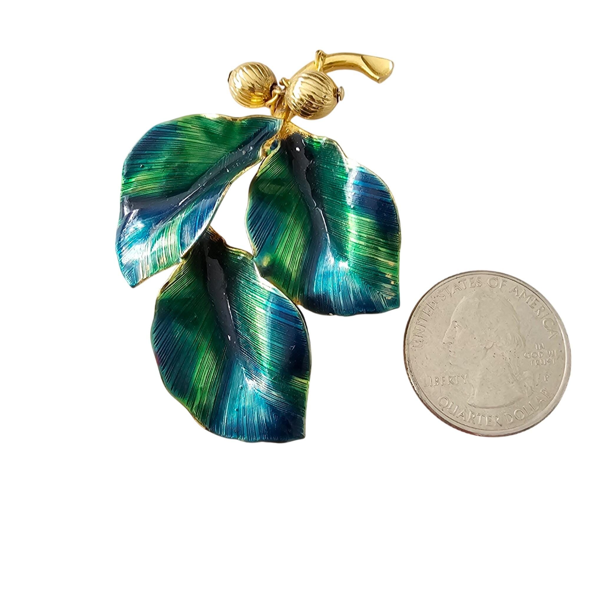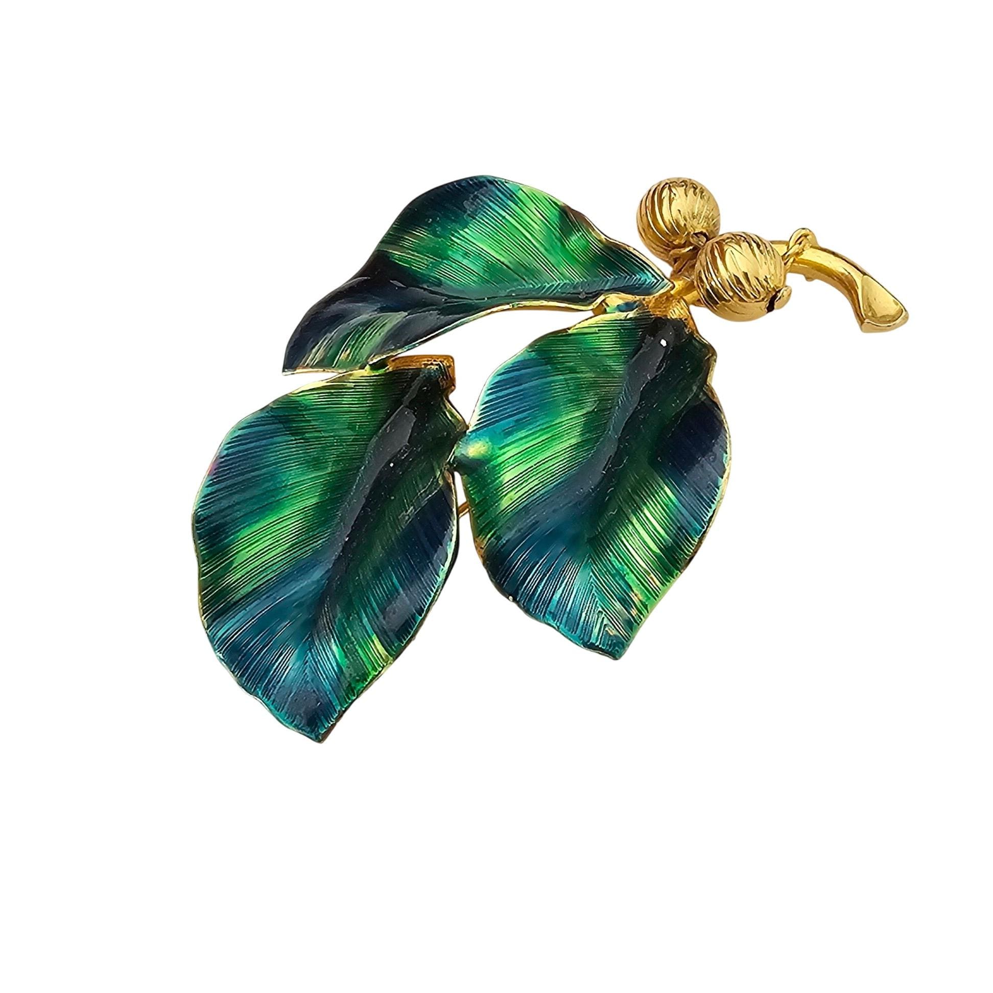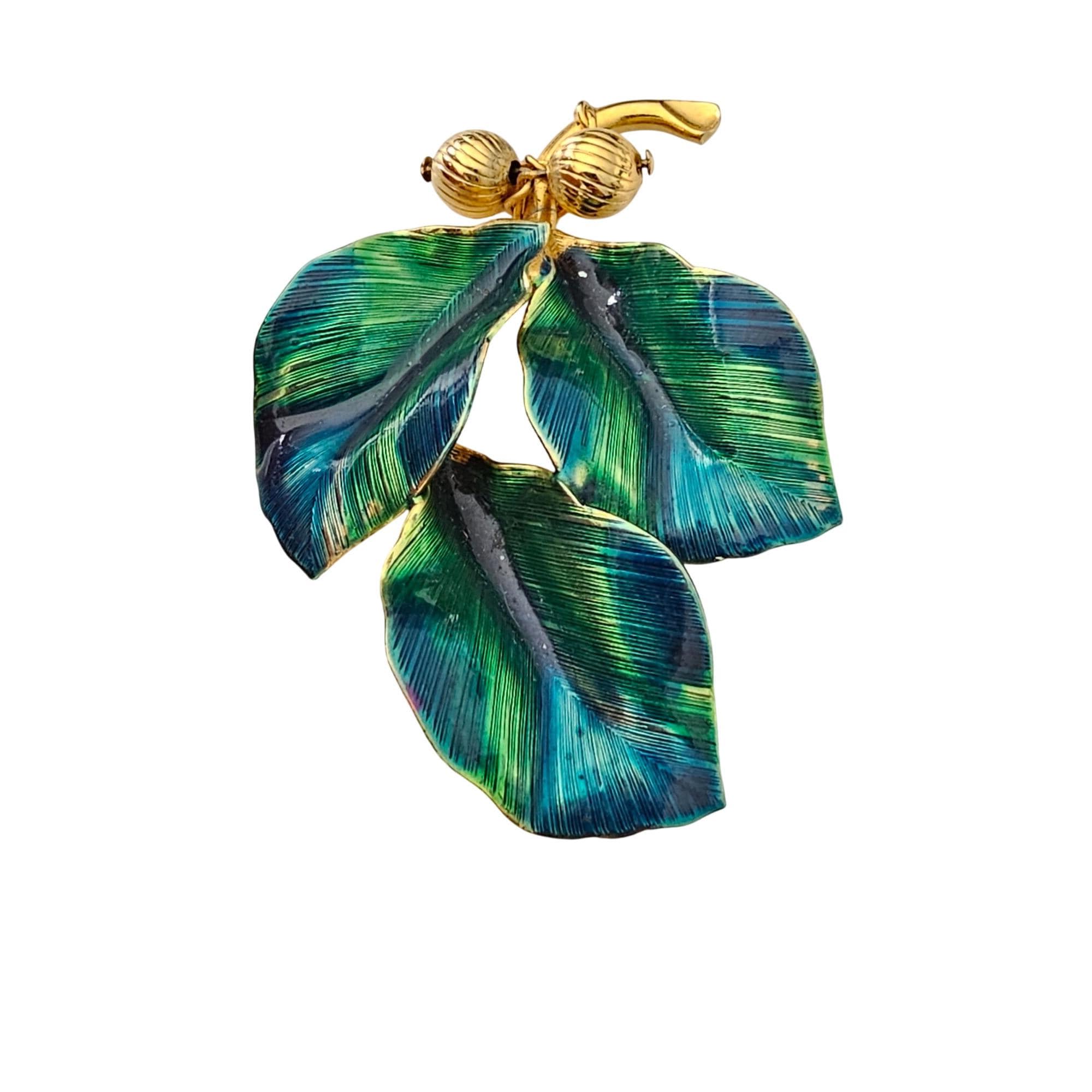 Blue Green Vintage Leaves Brooch Brass Bead Enamel Wired Leaf Pin J319