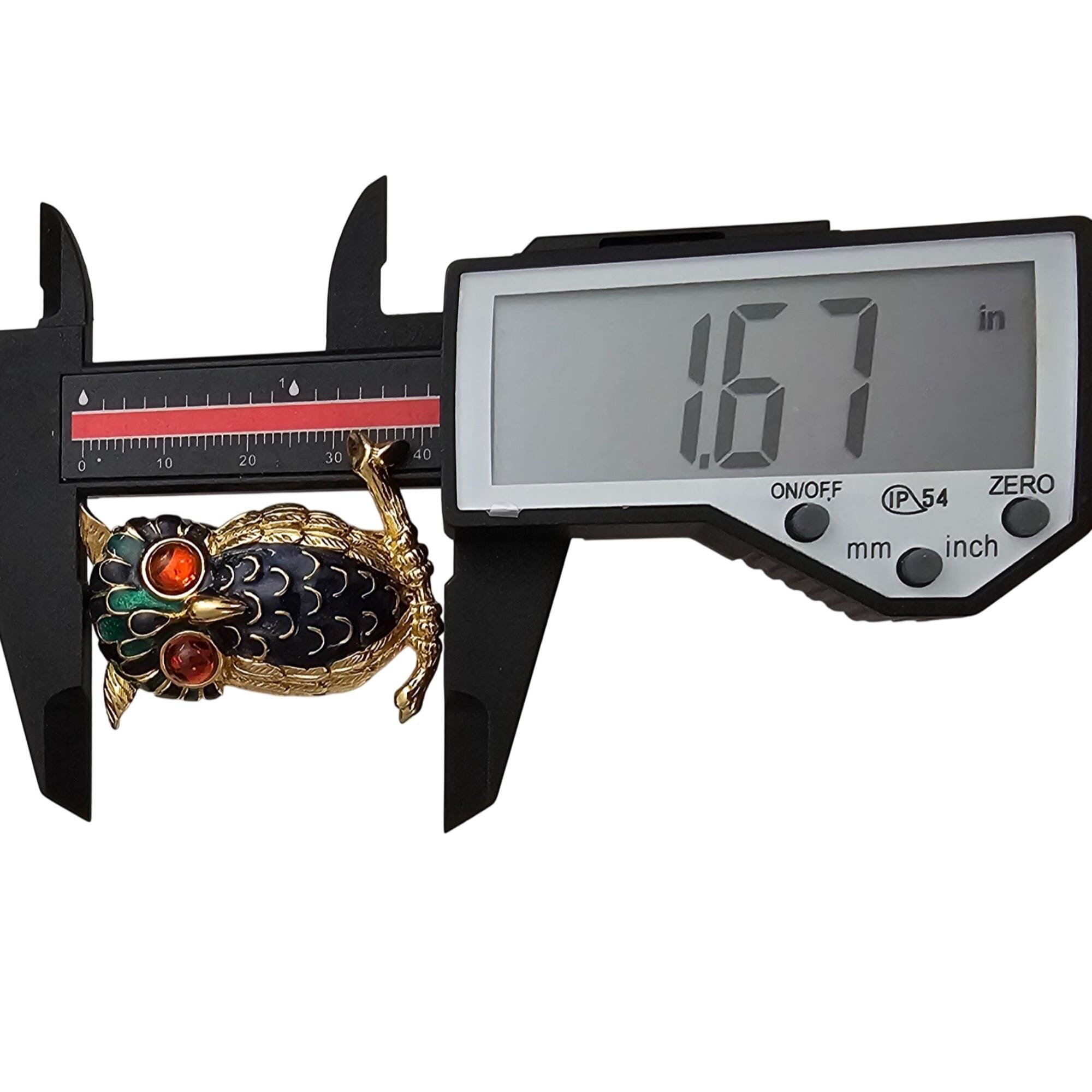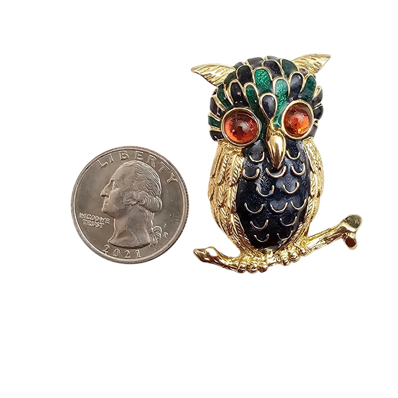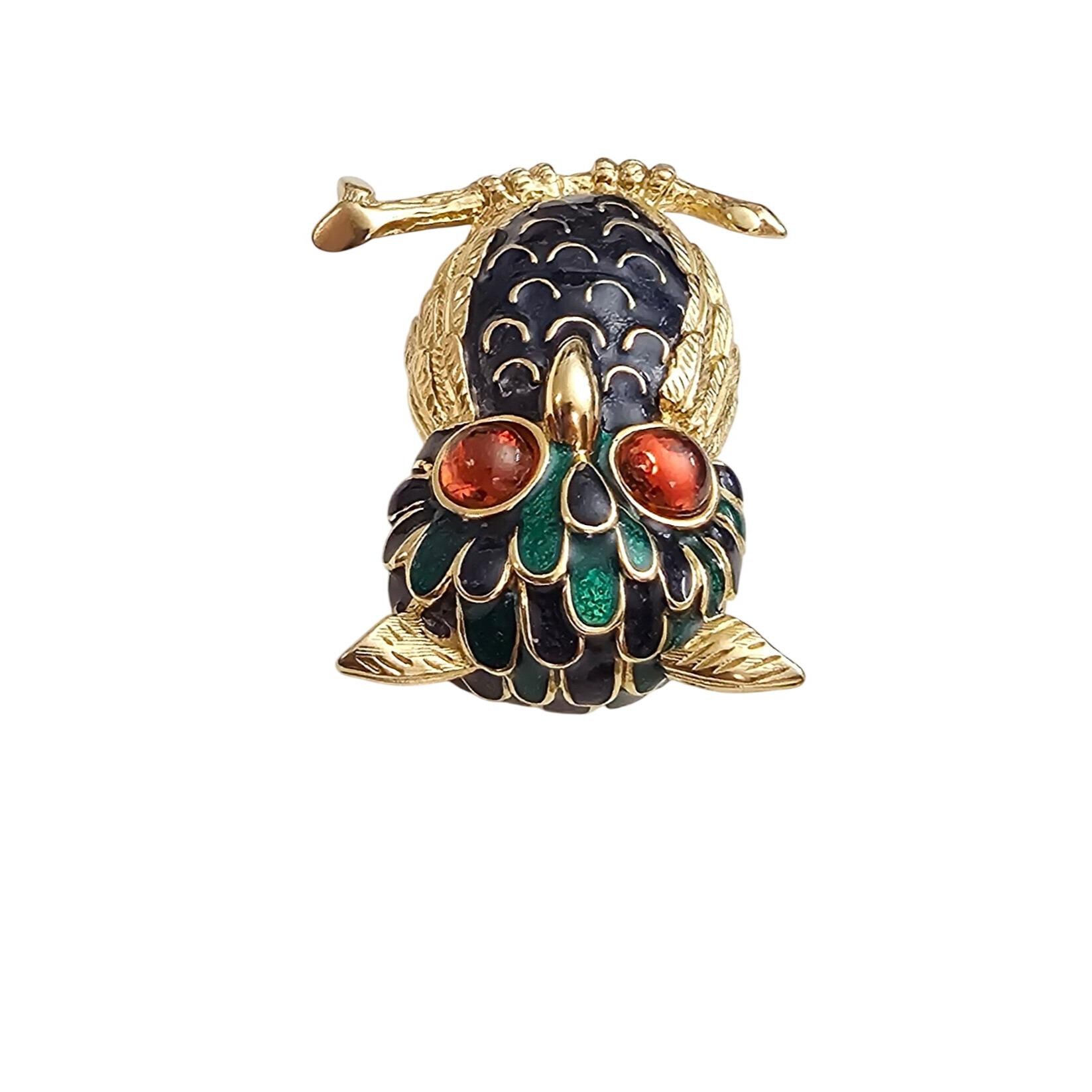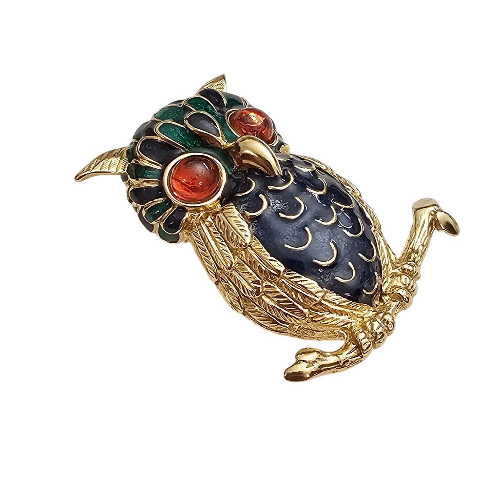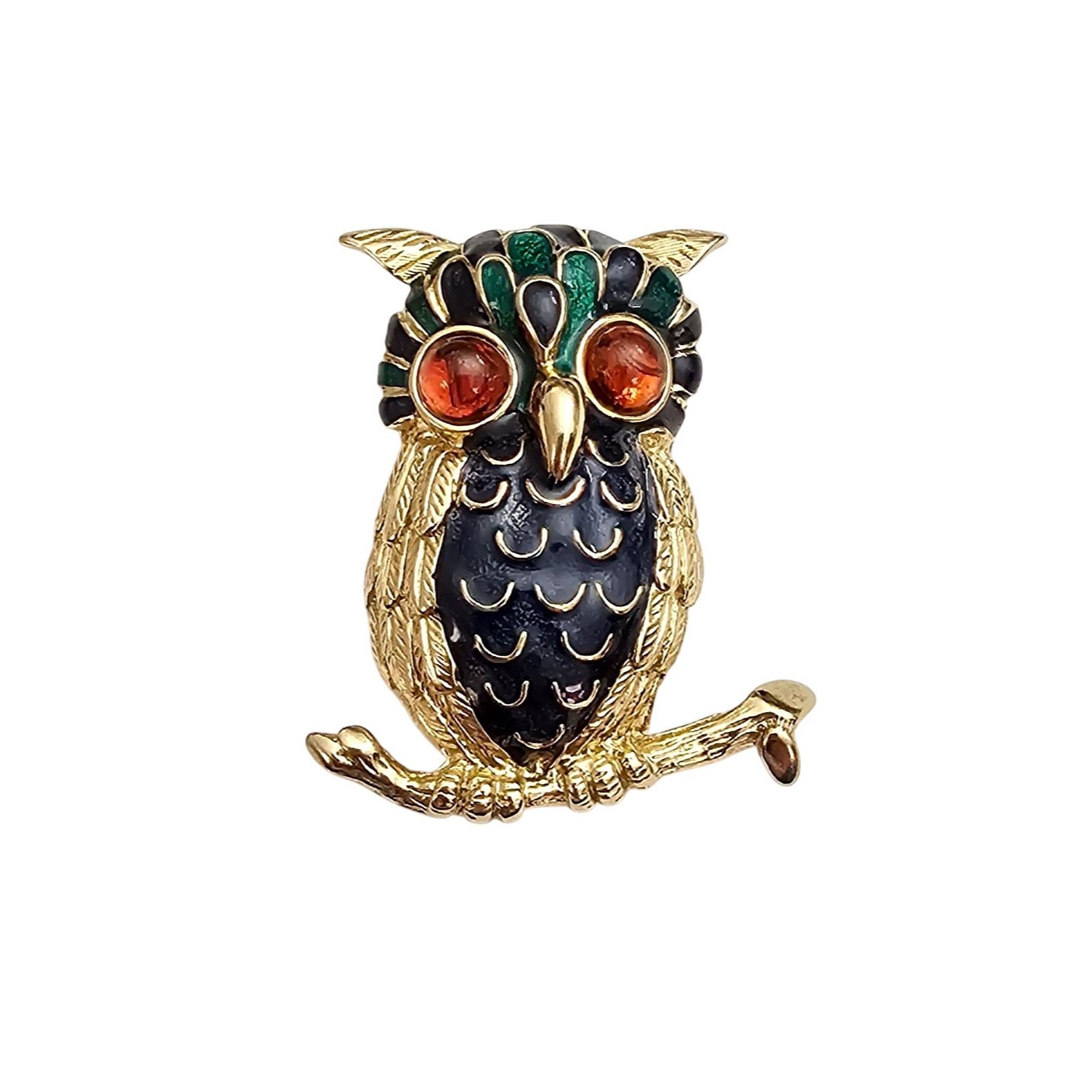 D’Orlan Owl Brooch, Orange Glass Cab Blue Green Enamel Pin Signed, C999