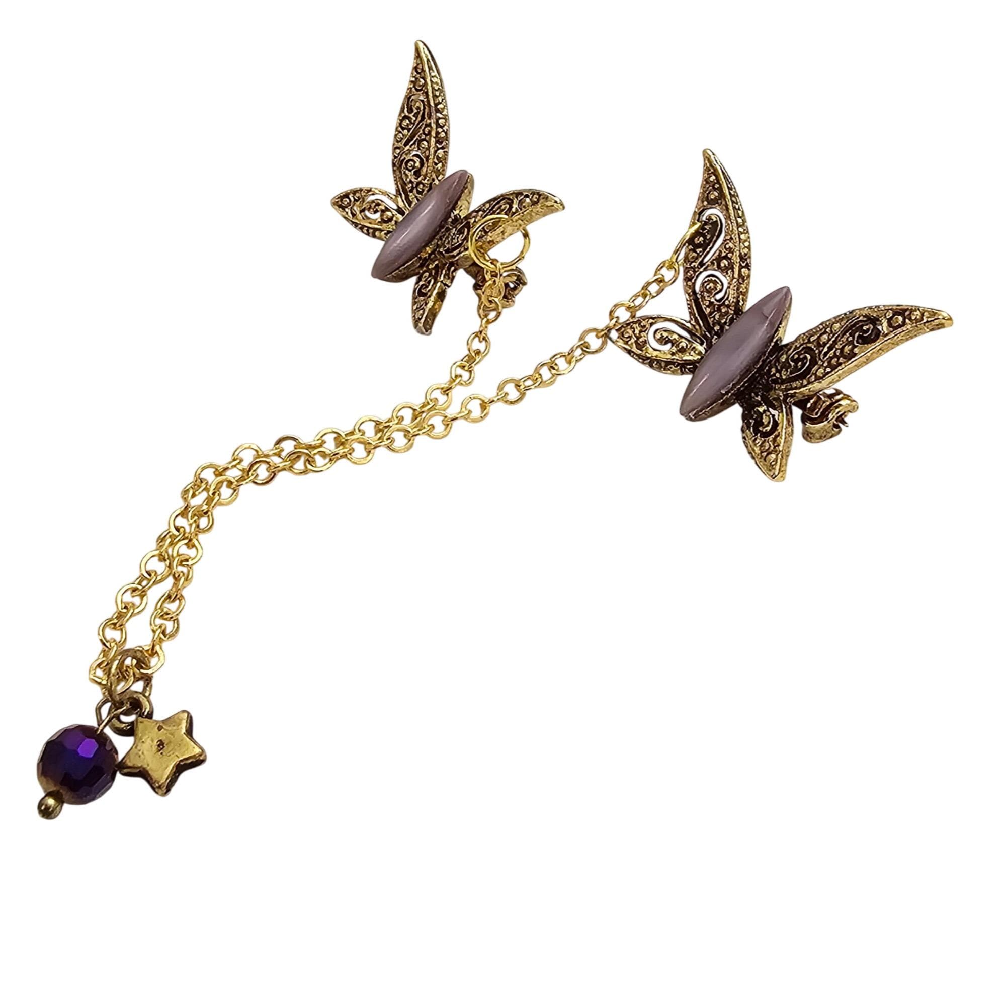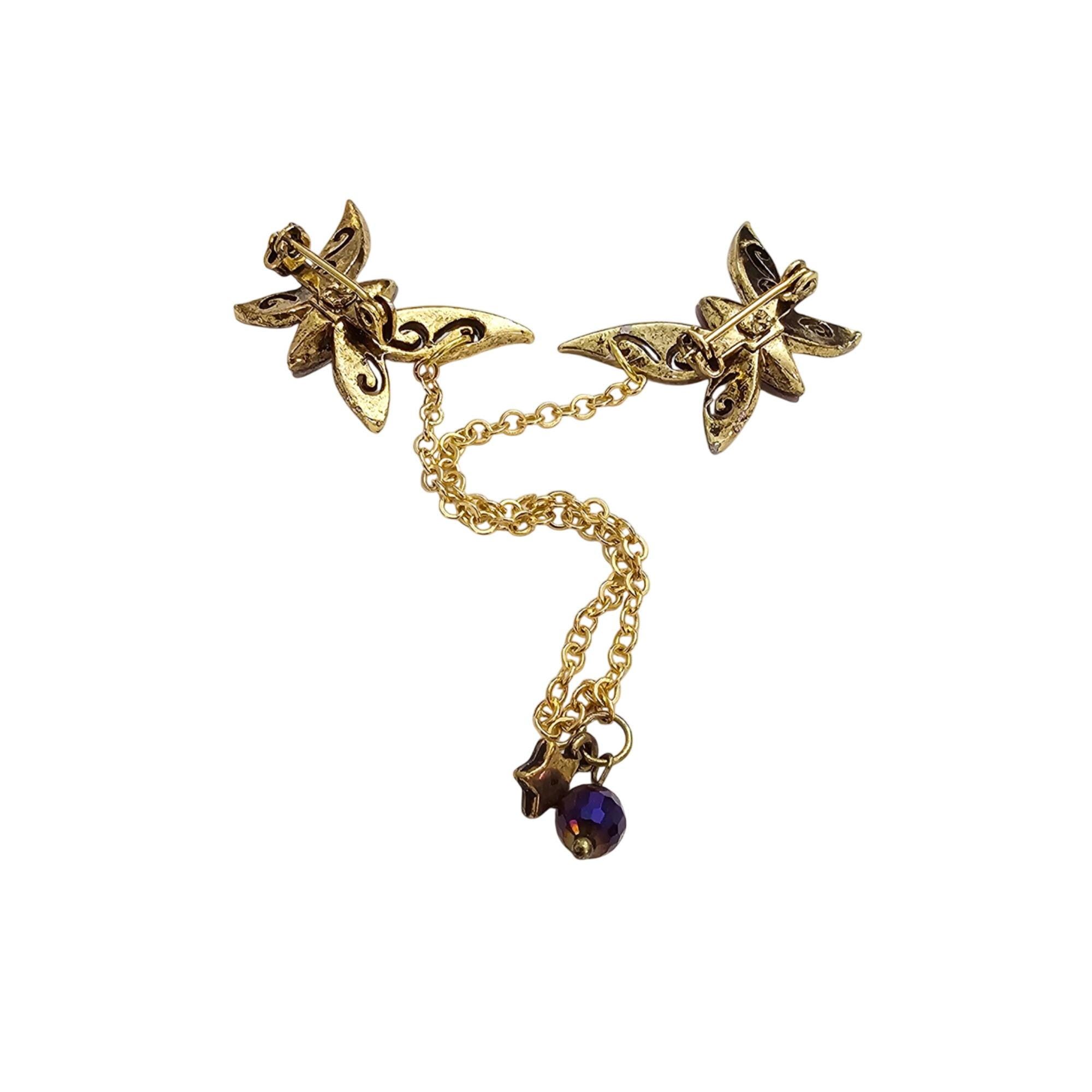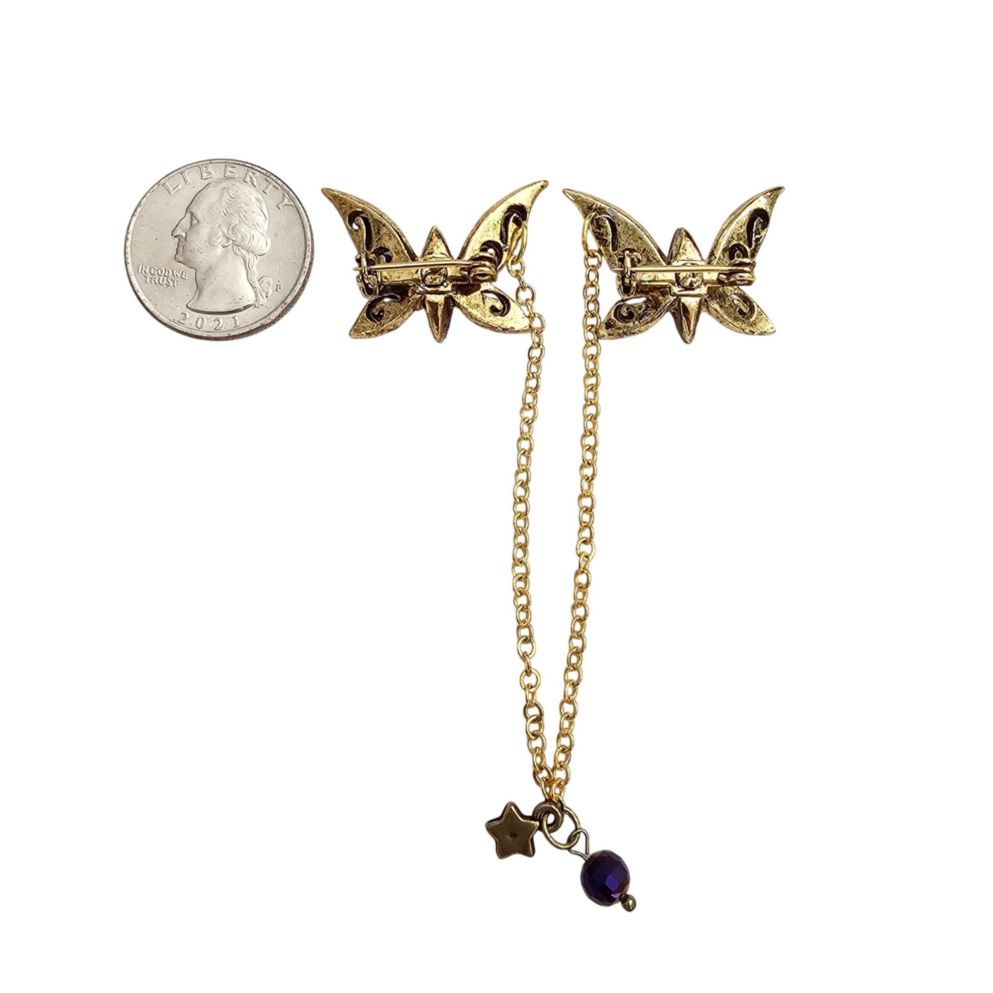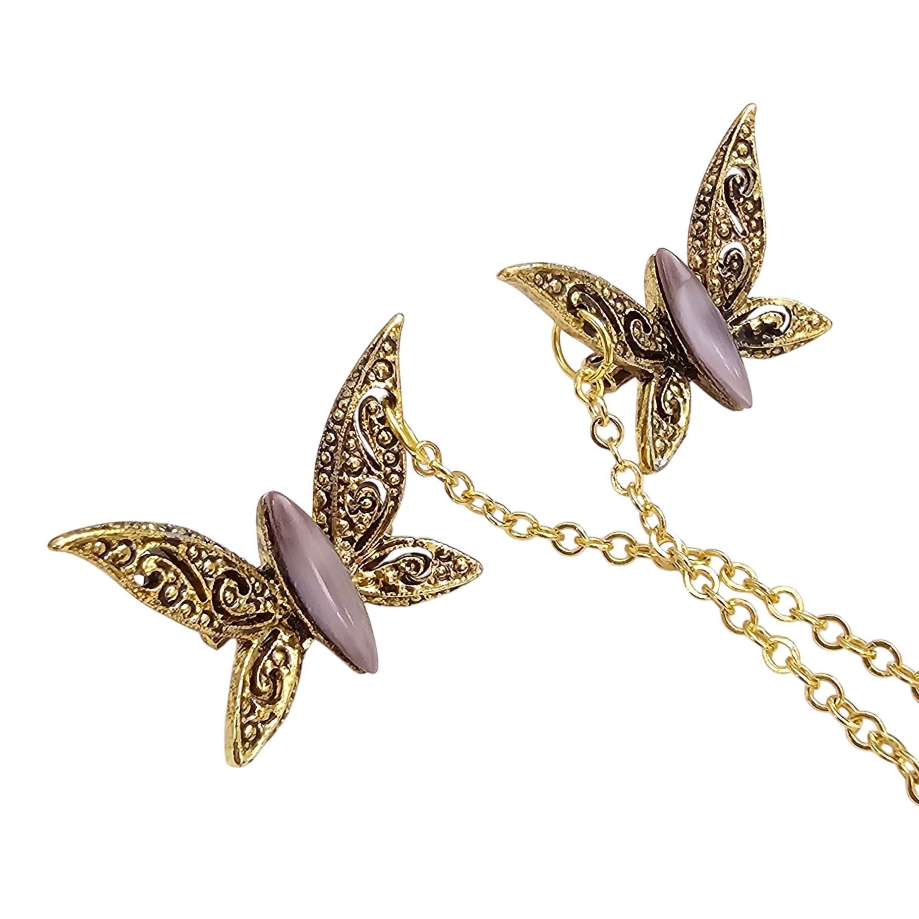 Gold Tone Purple Glass Moonstone Butterfly Filigree Brooch Set Pair Chatelaine Sweater Pins J306