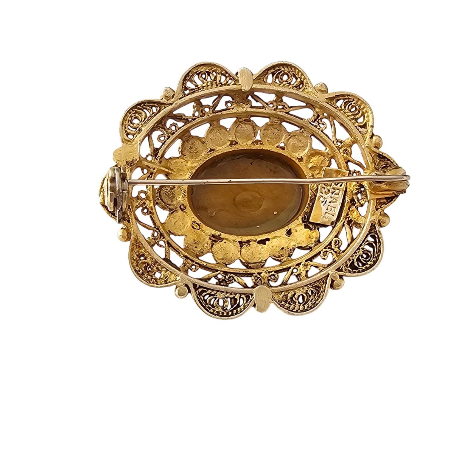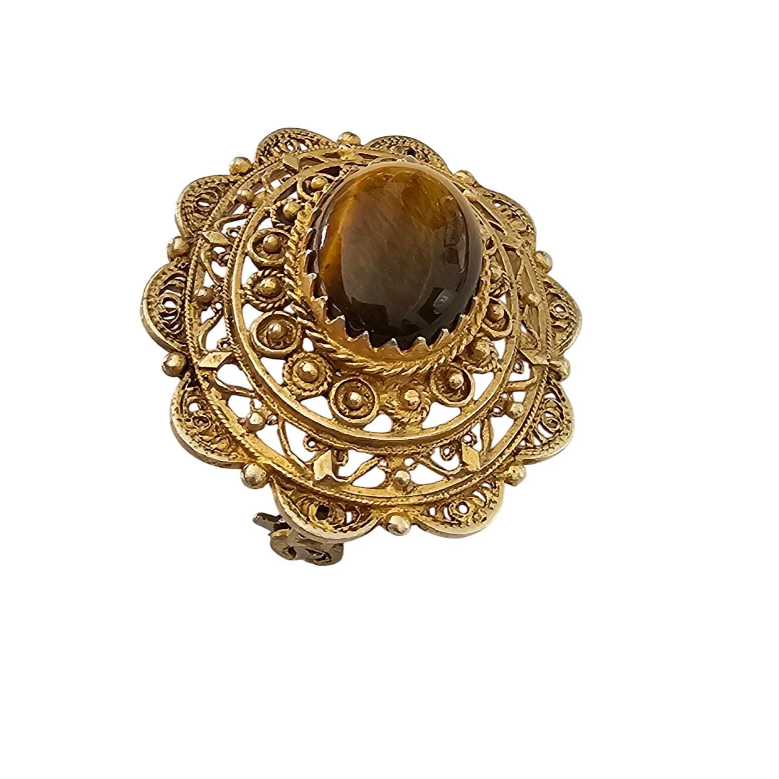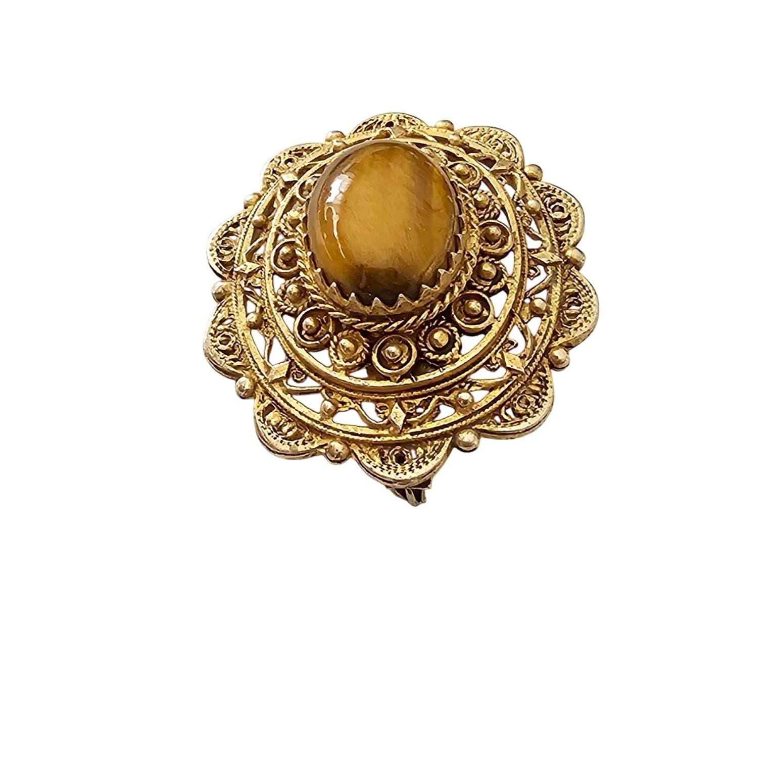 Israel 925 Gold Filigree Oval Brooch Tiger Eye Pin Signed J322