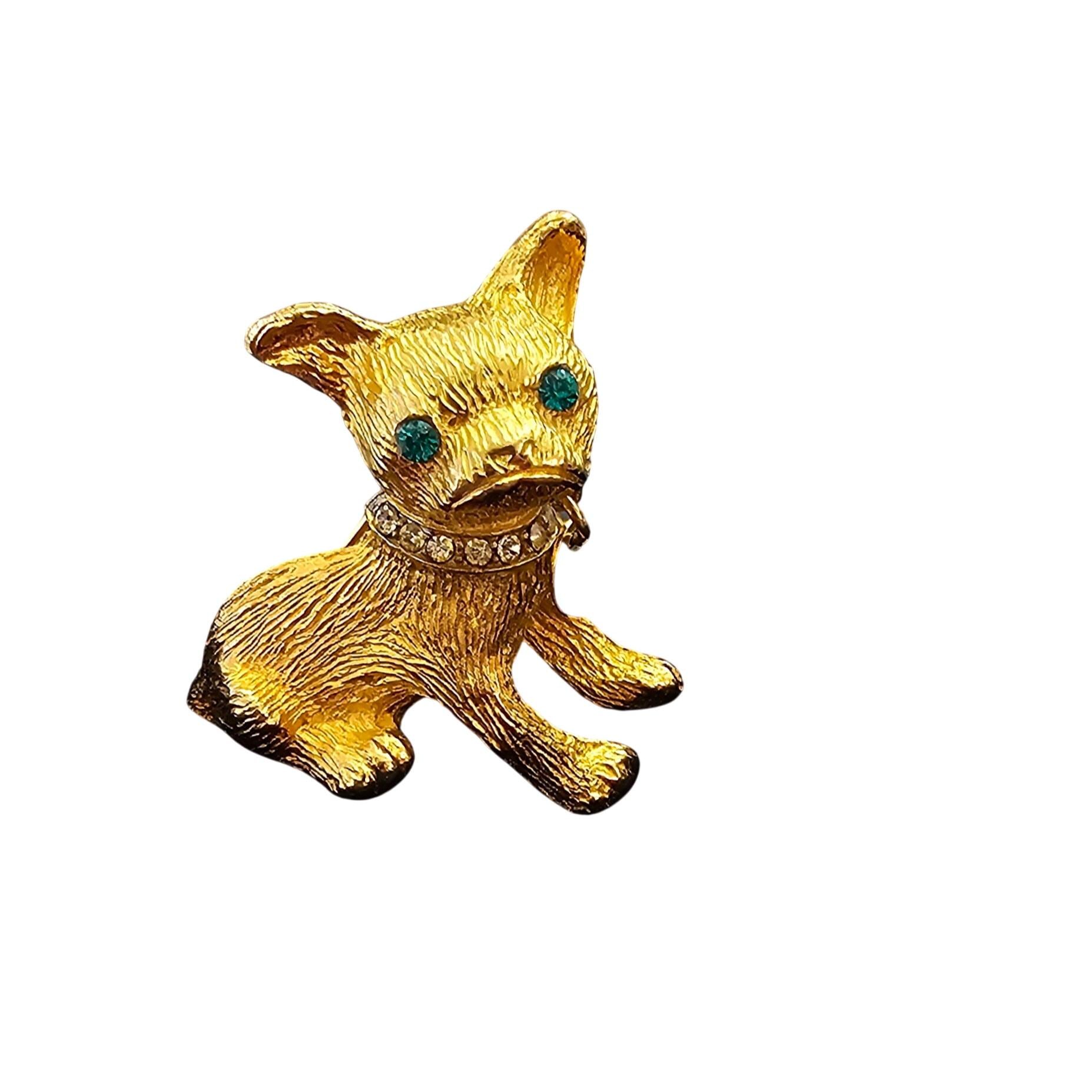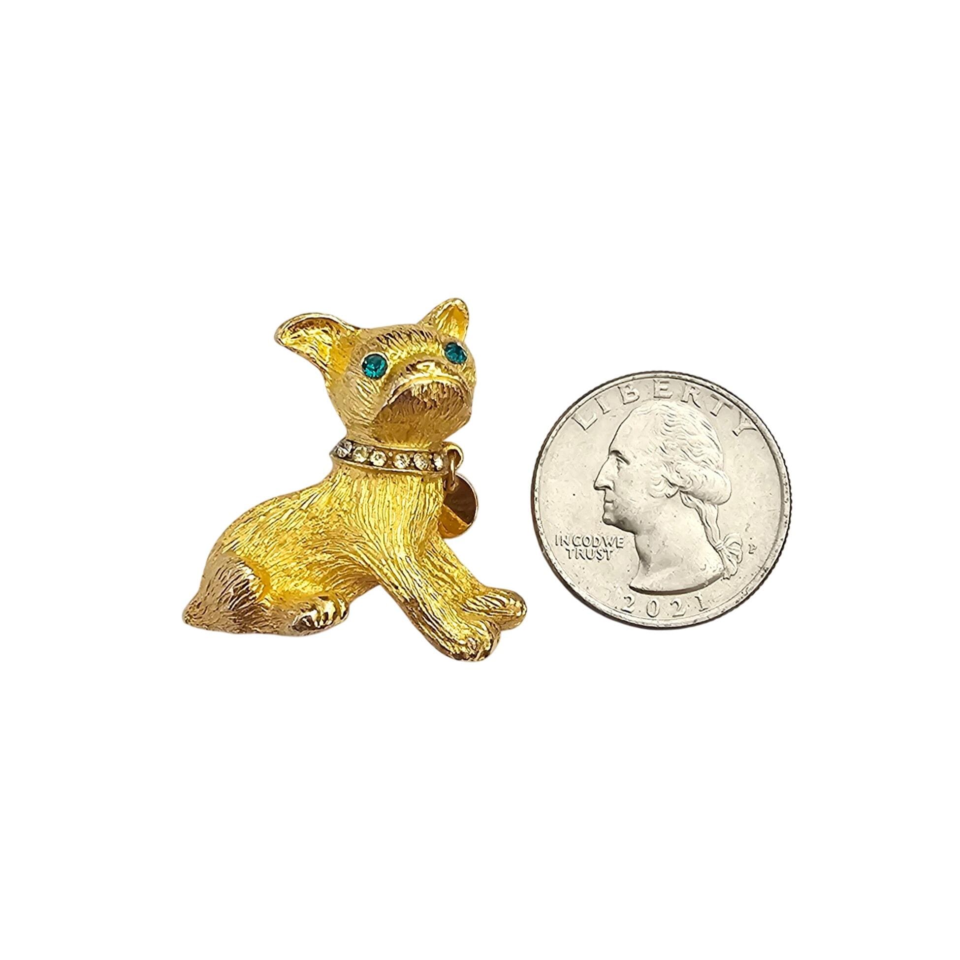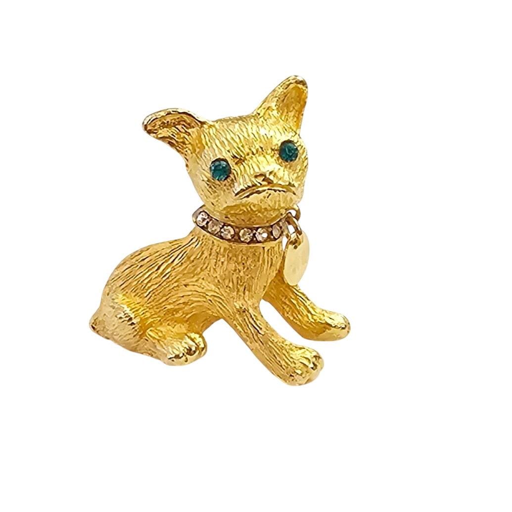 Vintage Frenchie Bulldog Brooch Gold Tone Rhinestone Collar Tag Dangle Pin C992