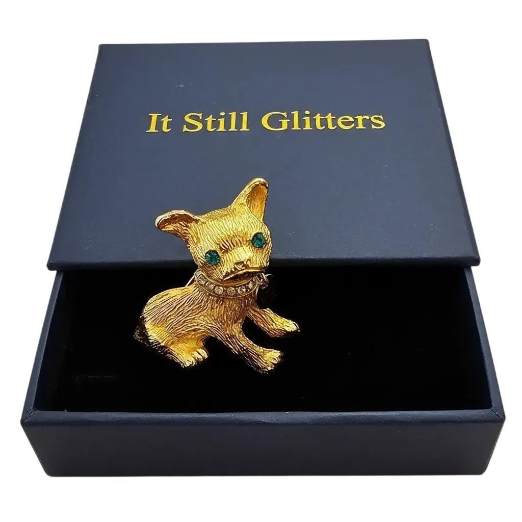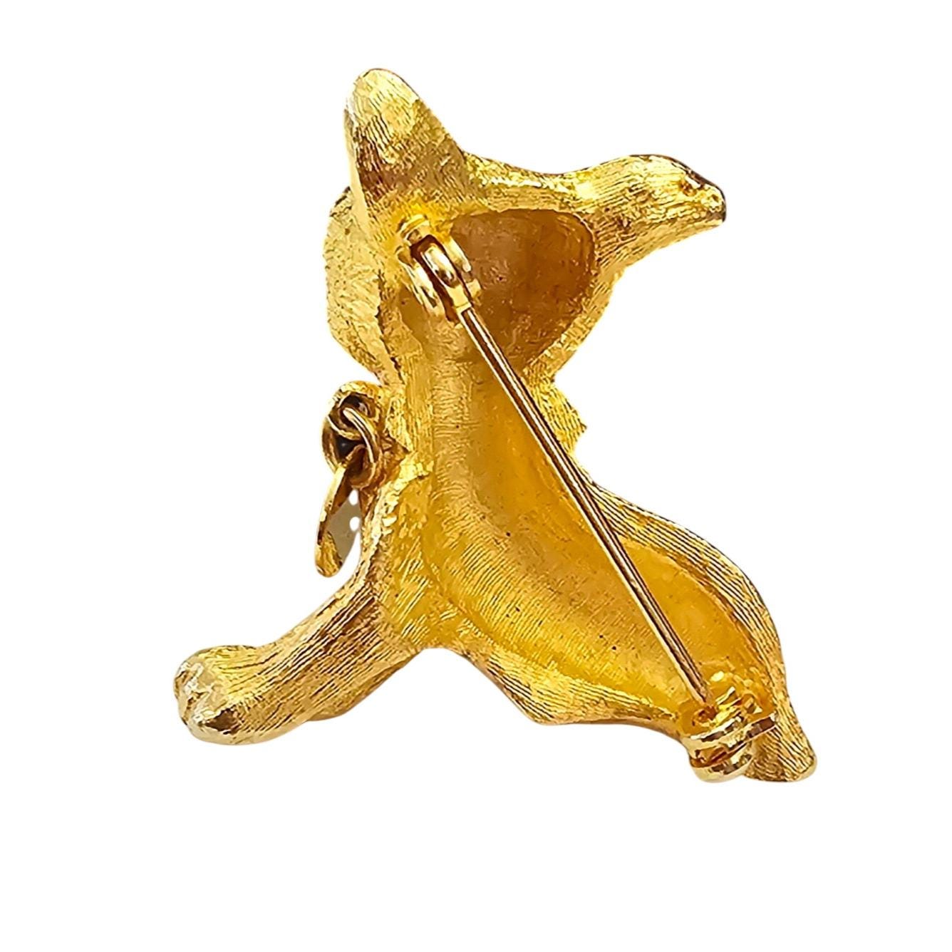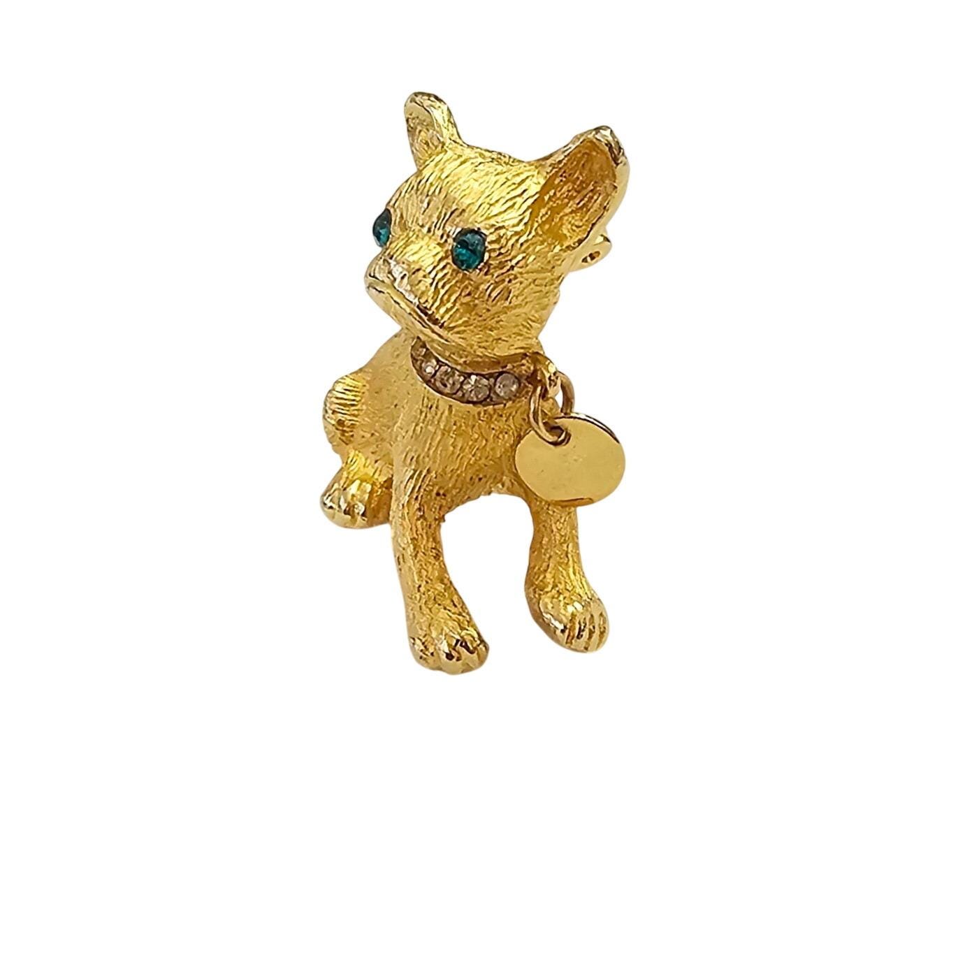 Vintage Frenchie Bulldog Brooch Gold Tone Rhinestone Collar Tag Dangle Pin C992