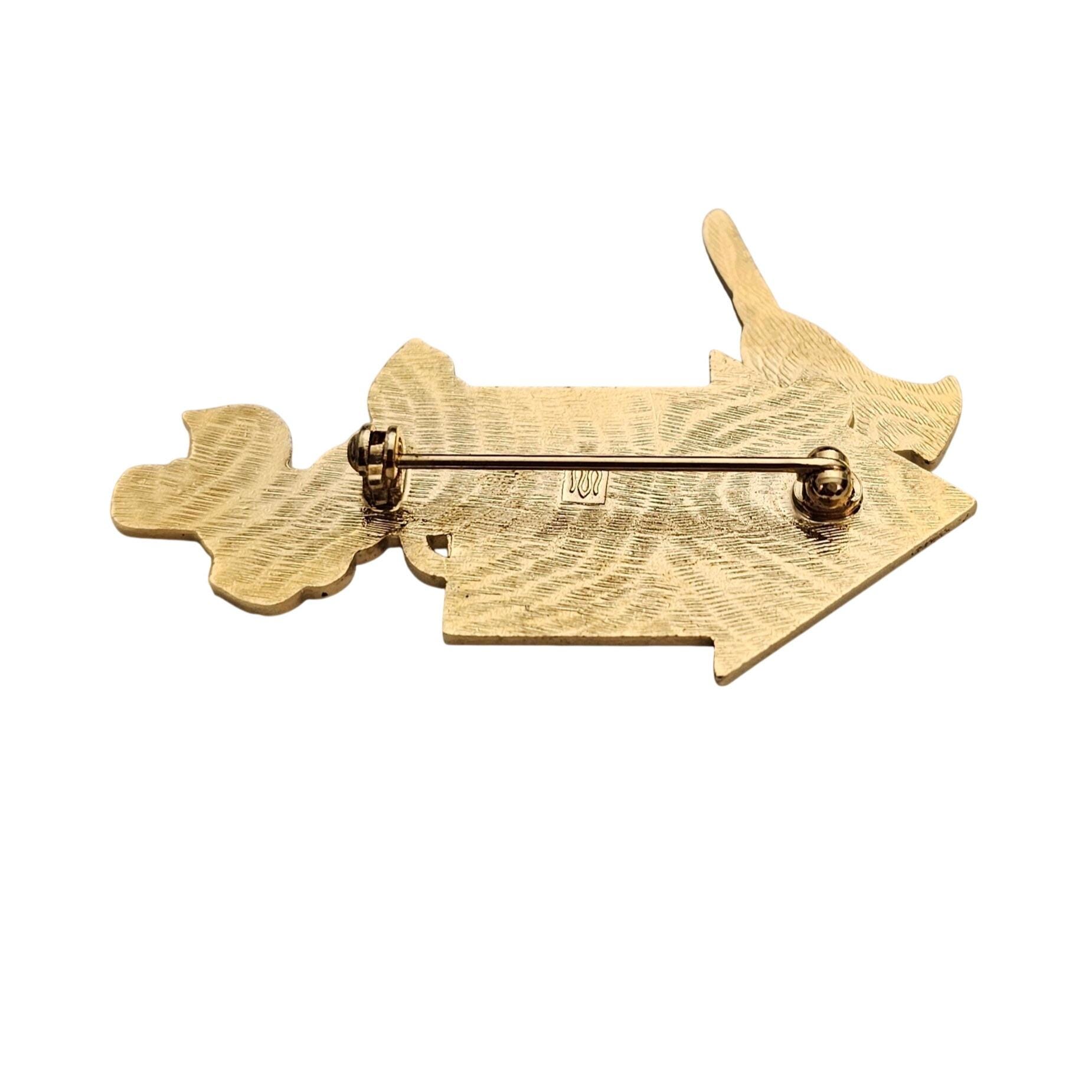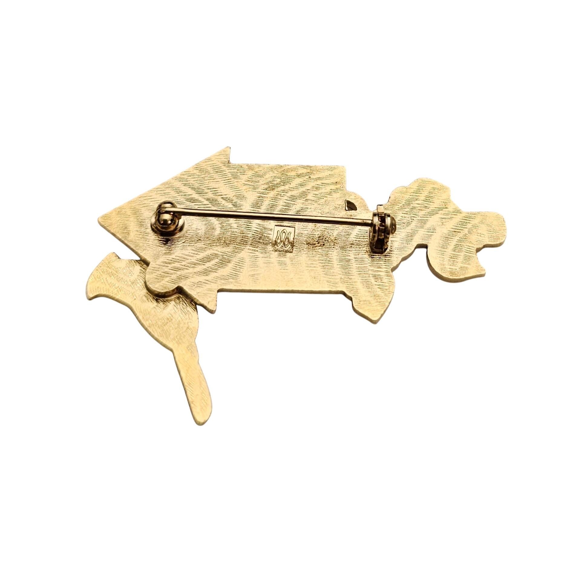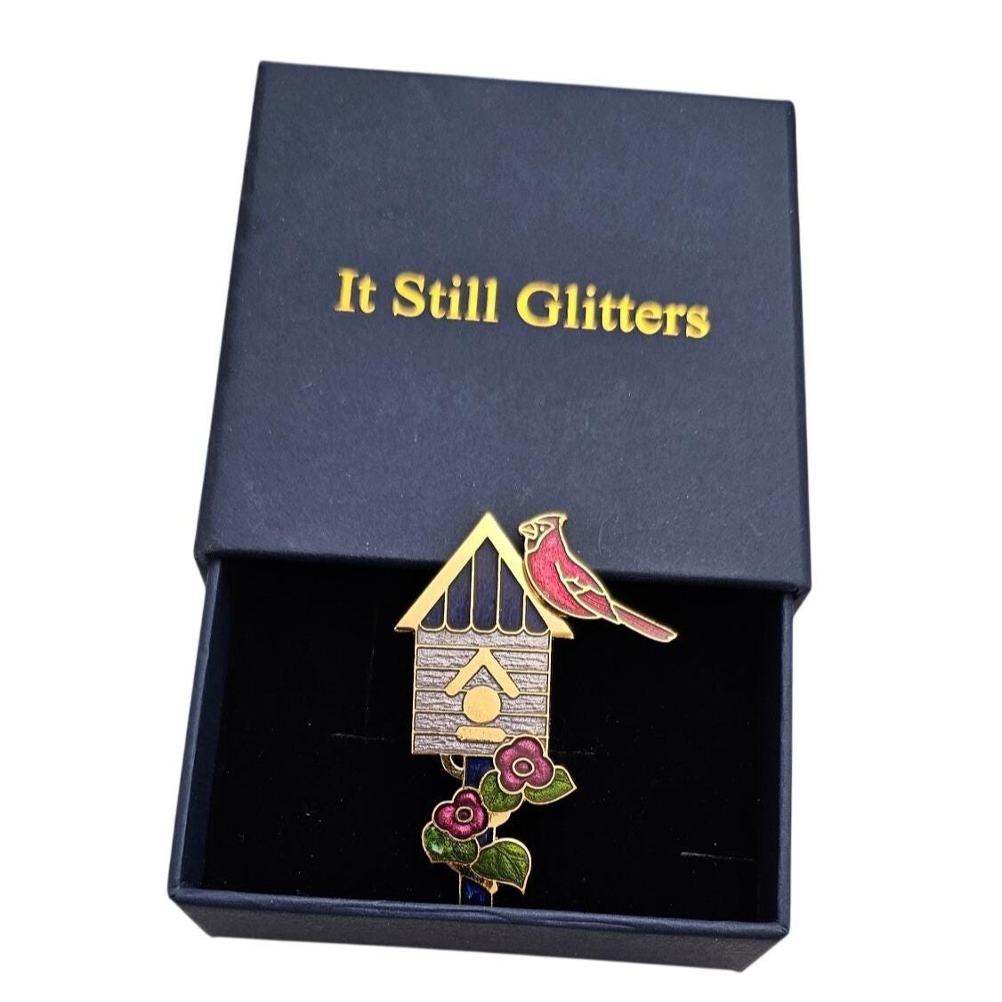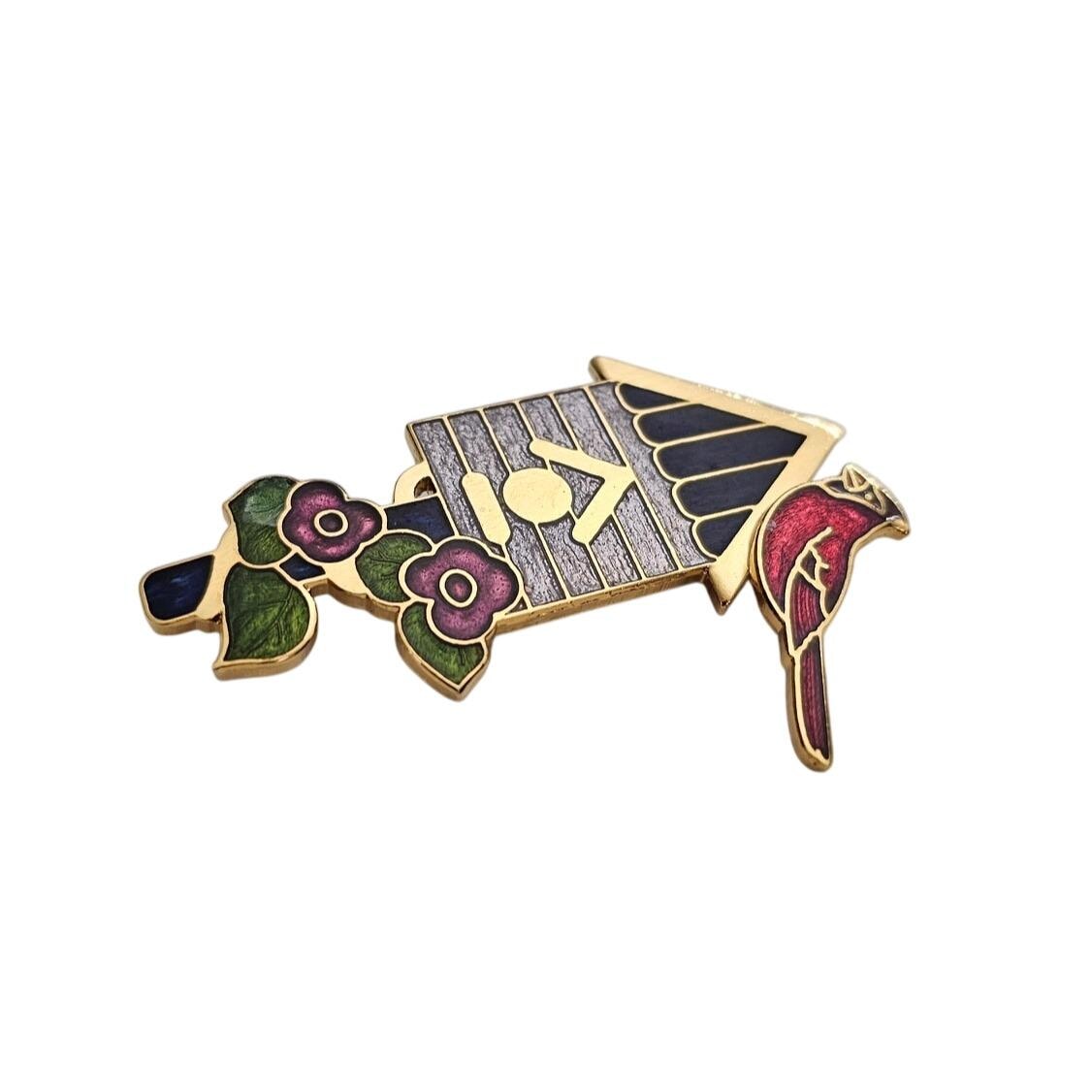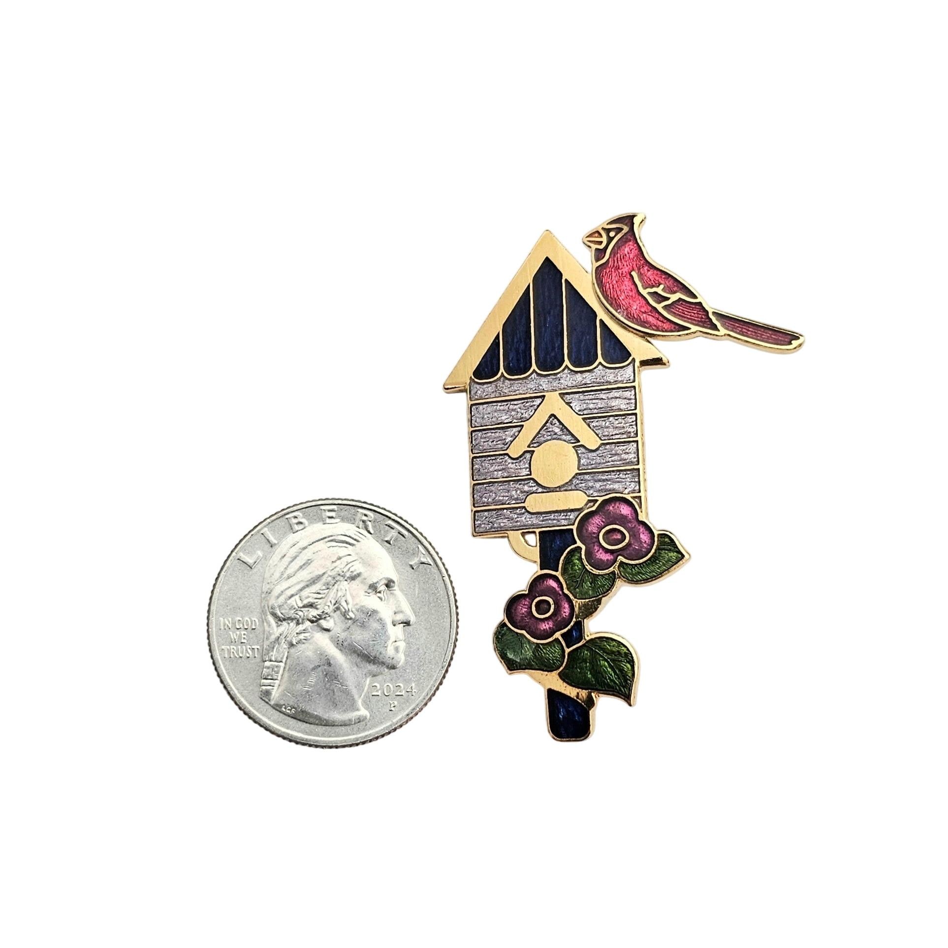 Fish Brand Cardinal Bird And Birdhouse Brooch Champleve Pin Signed, J406