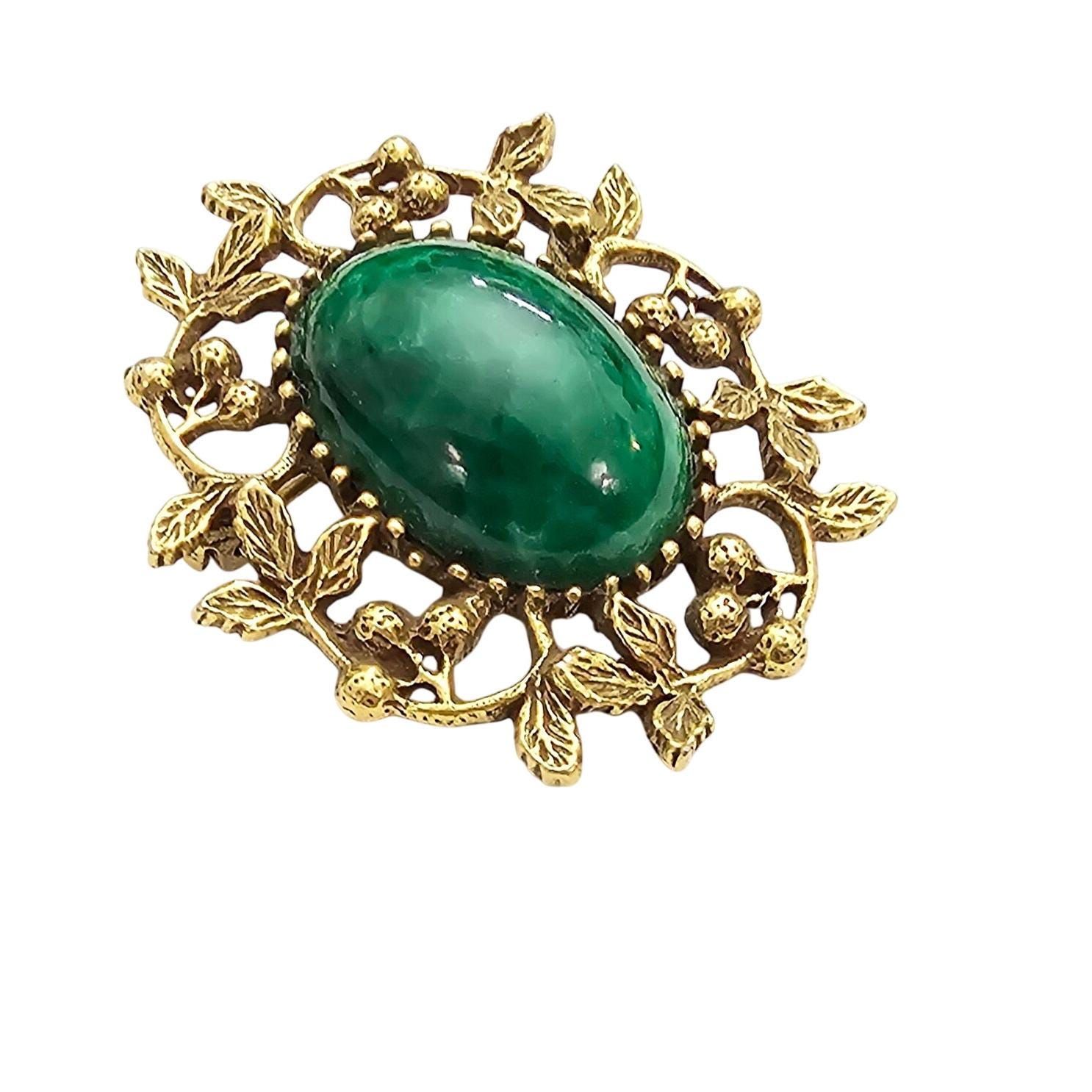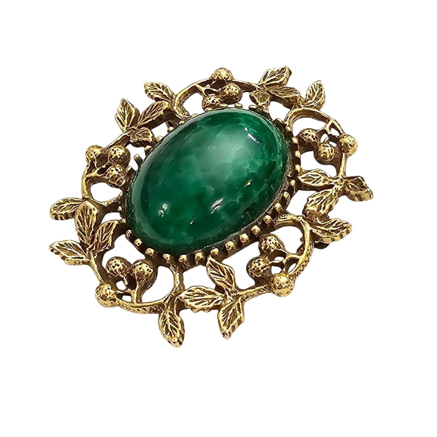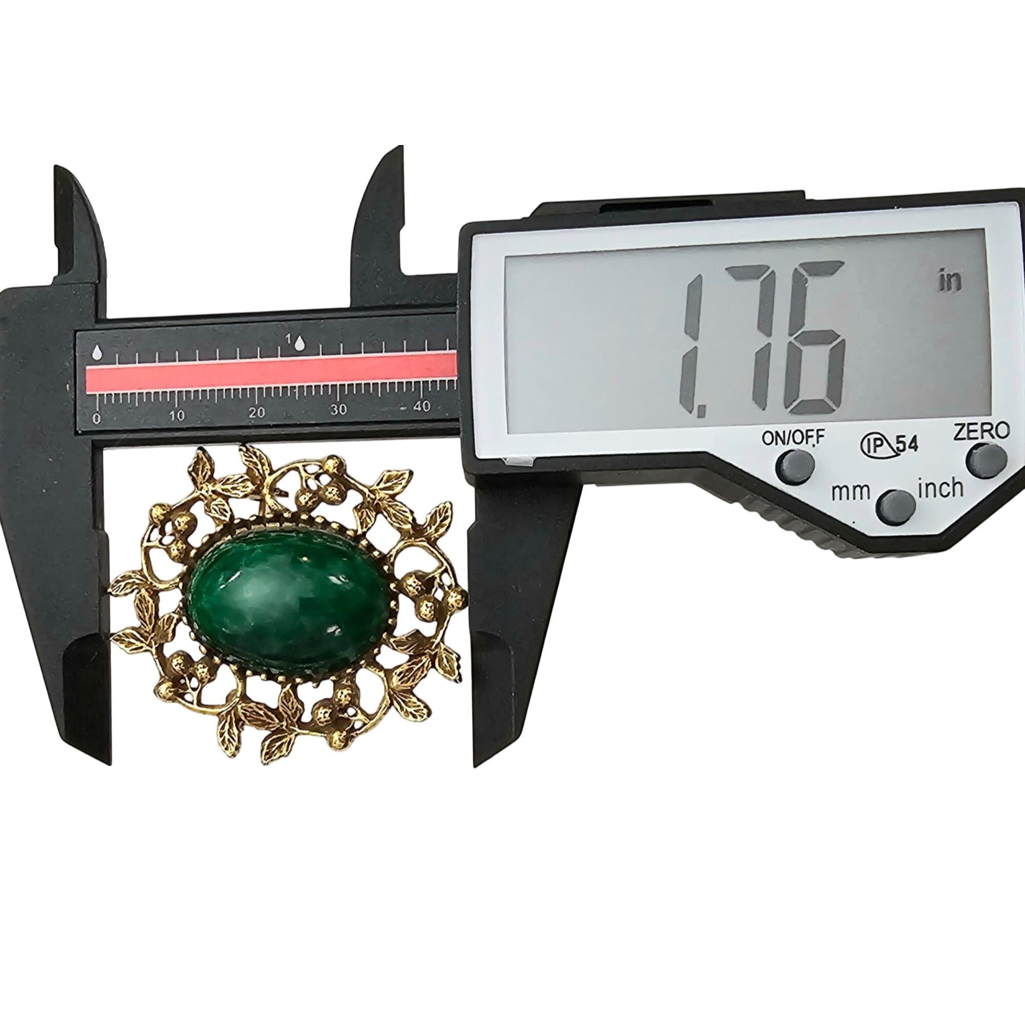 Goldette Green Mottled Glass Cab Brooch Oval Berries Leaf Pin Signed J339