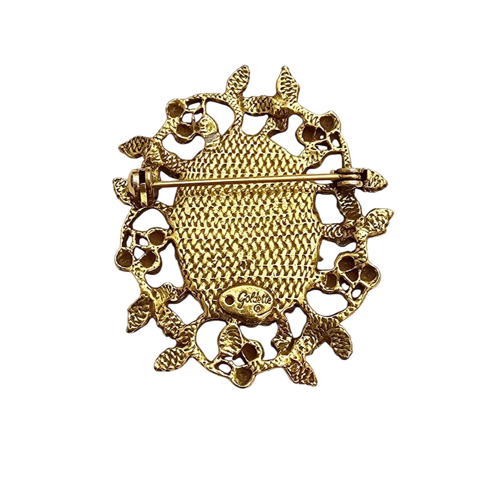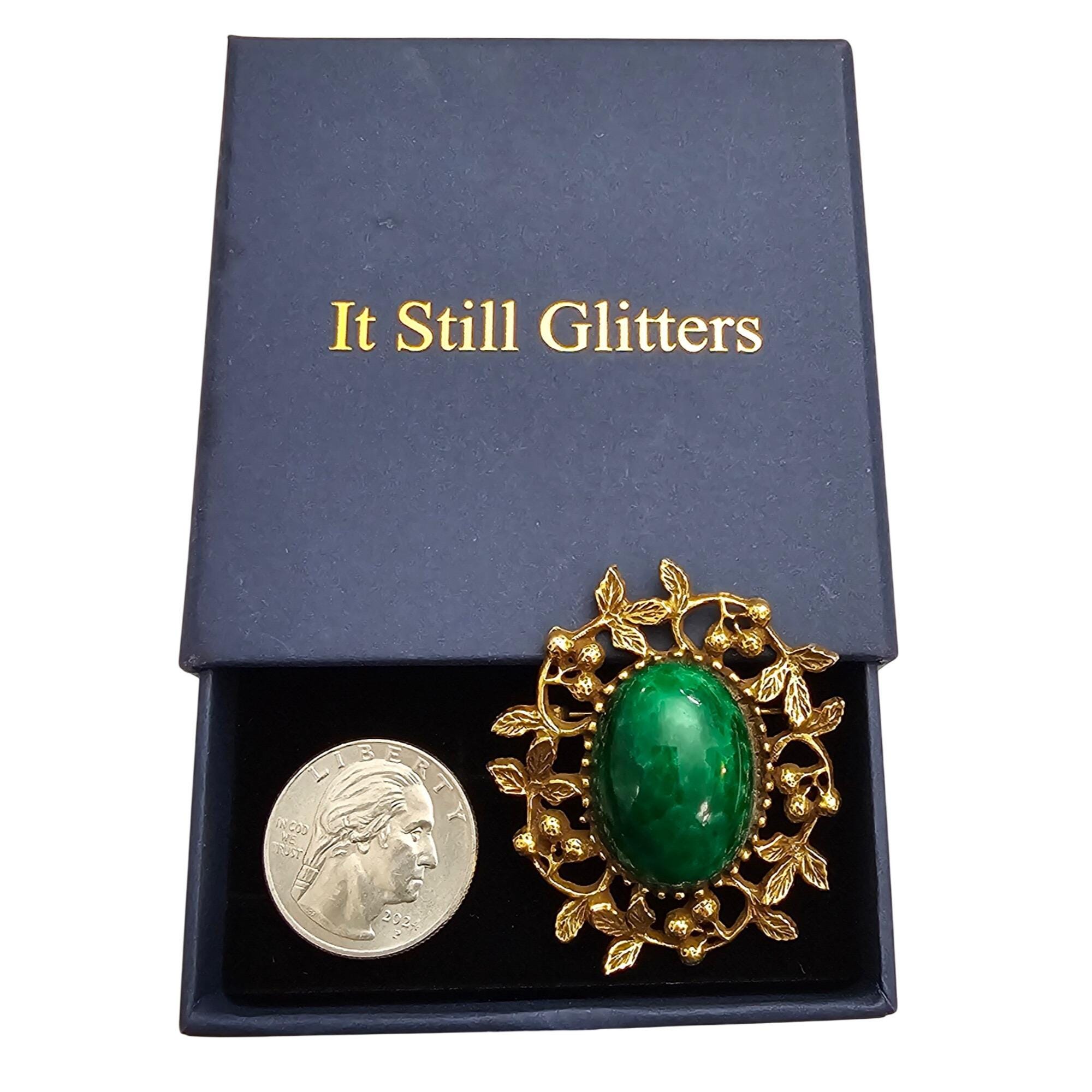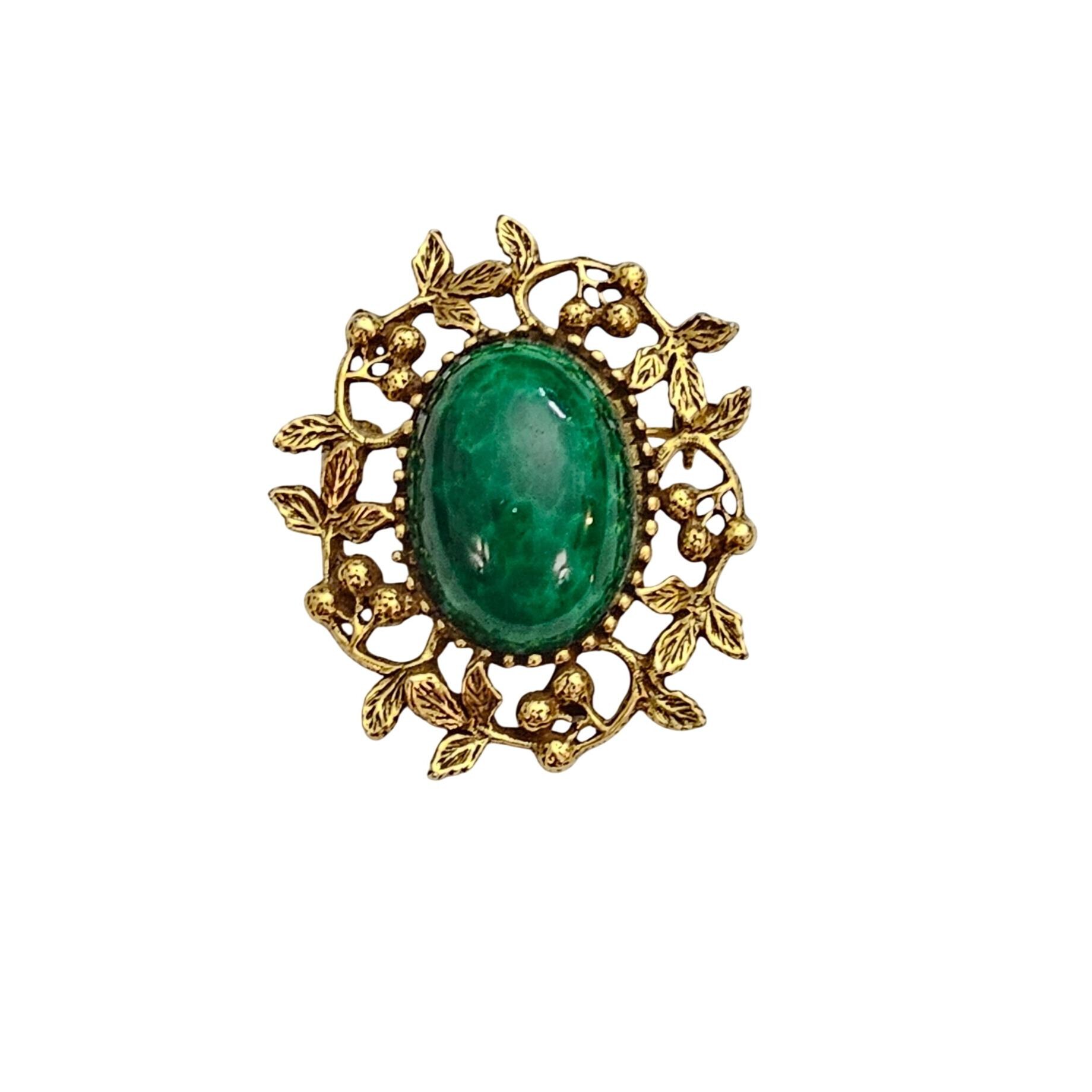 Goldette Green Mottled Glass Cab Brooch Oval Berries Leaf Pin Signed J339
