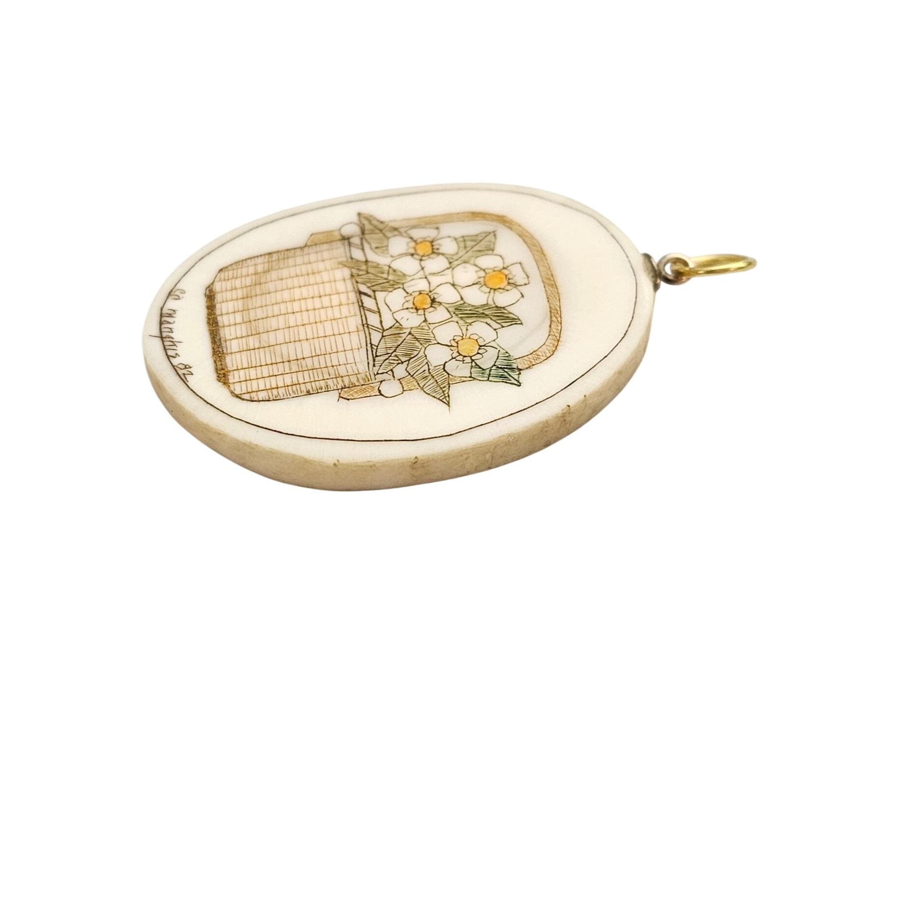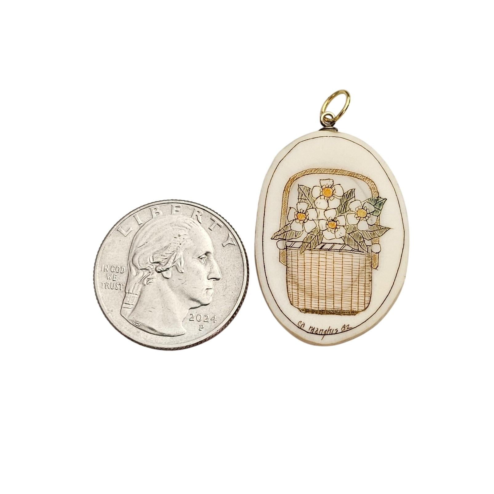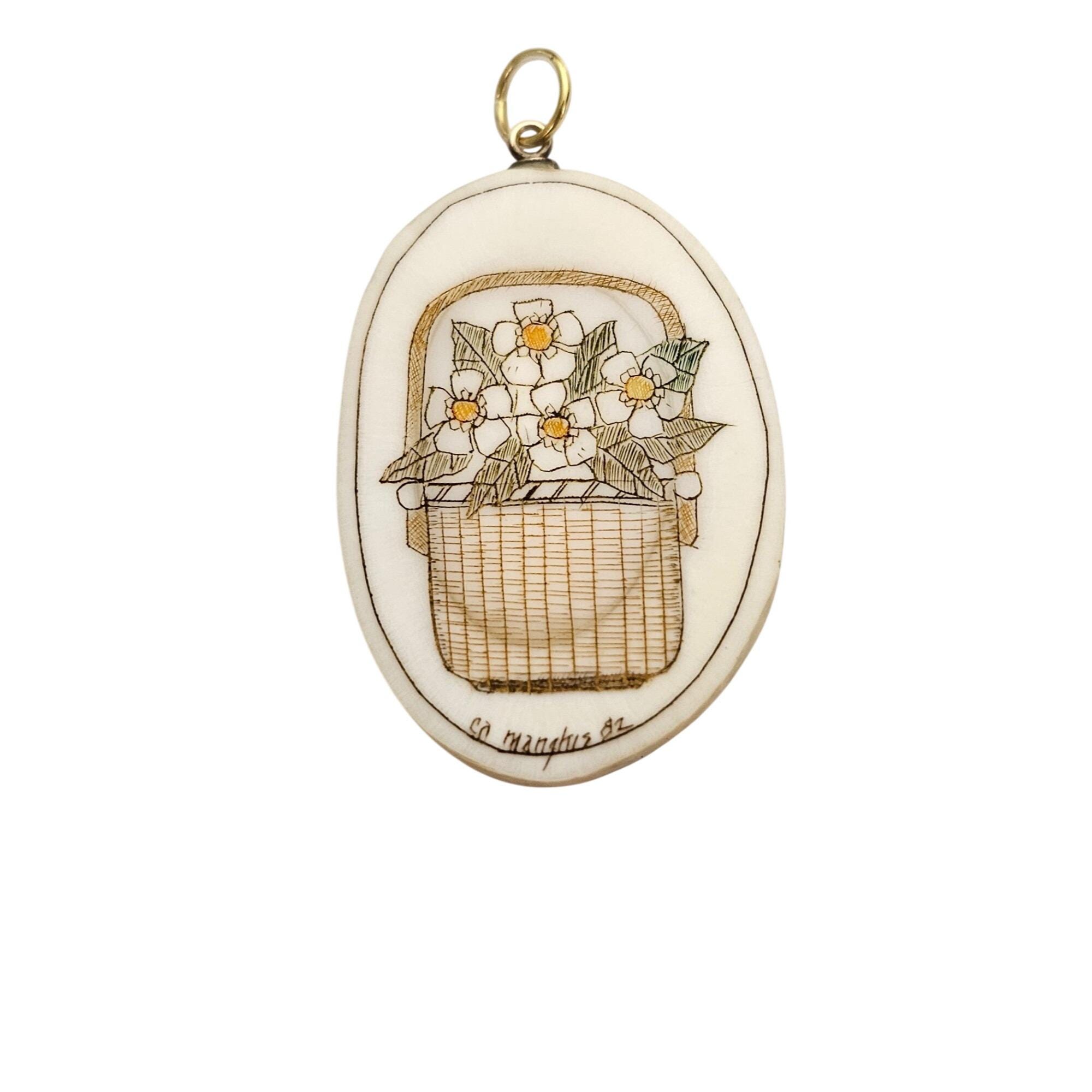 Antler Carved Pendant Basket of Flowers Signed By Artist J365