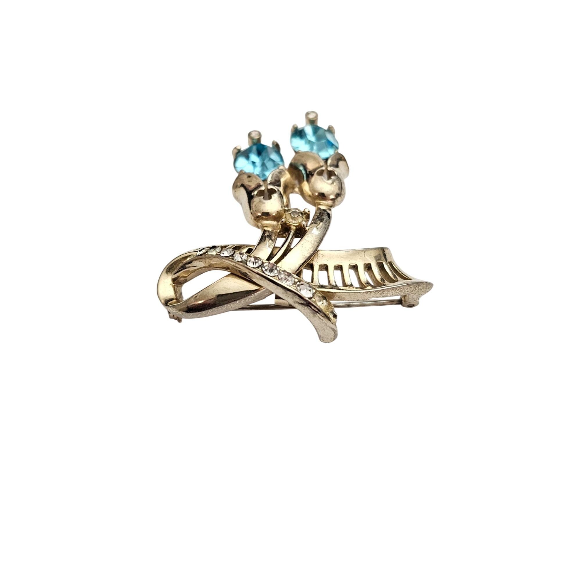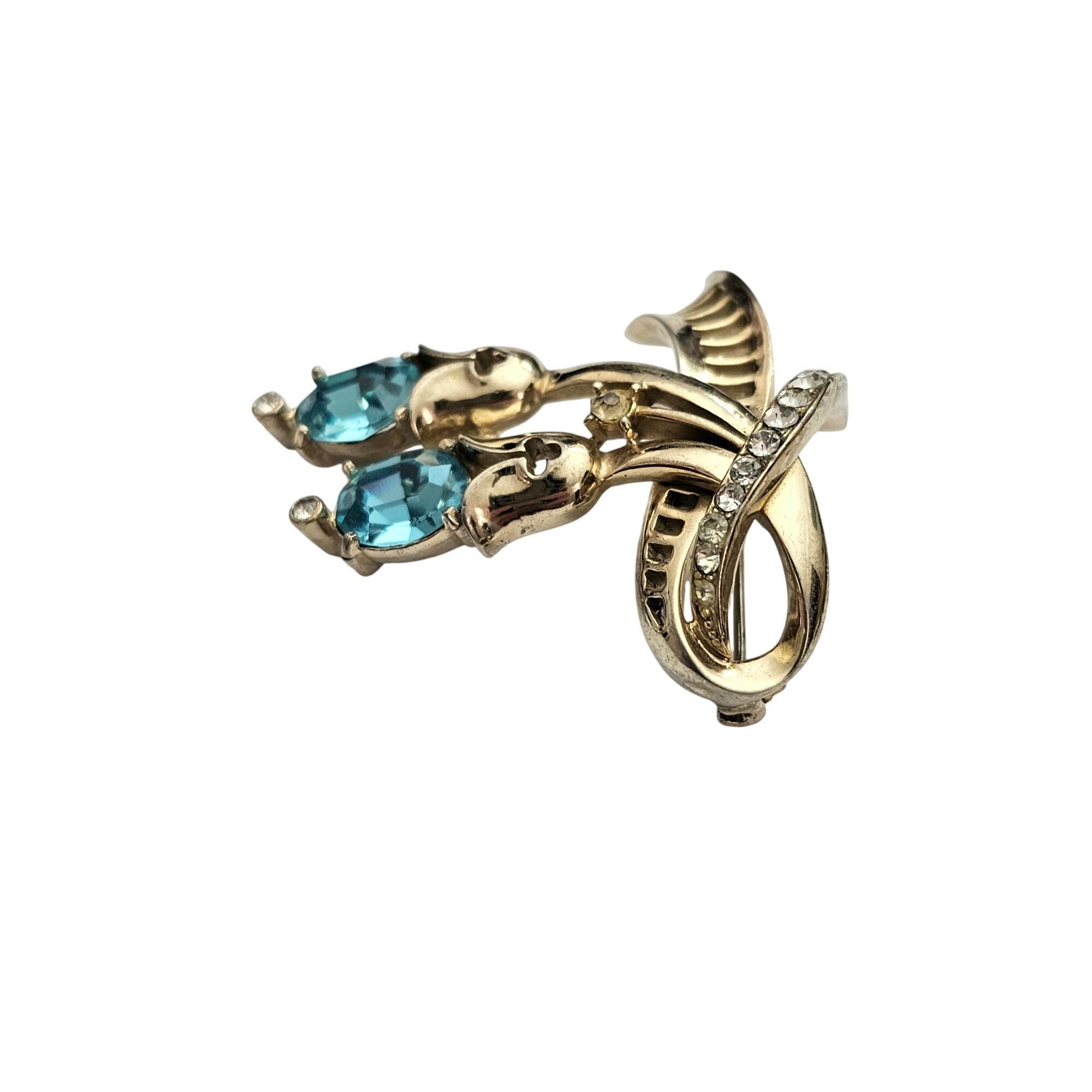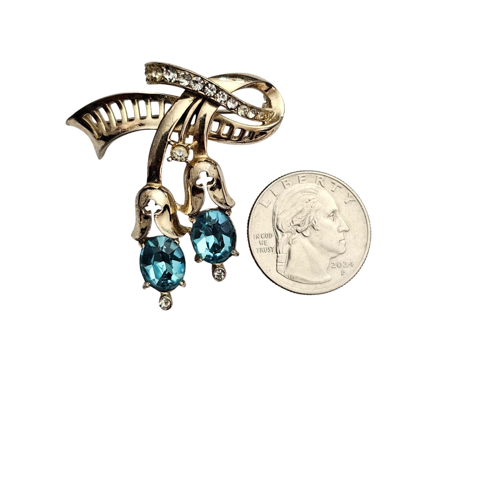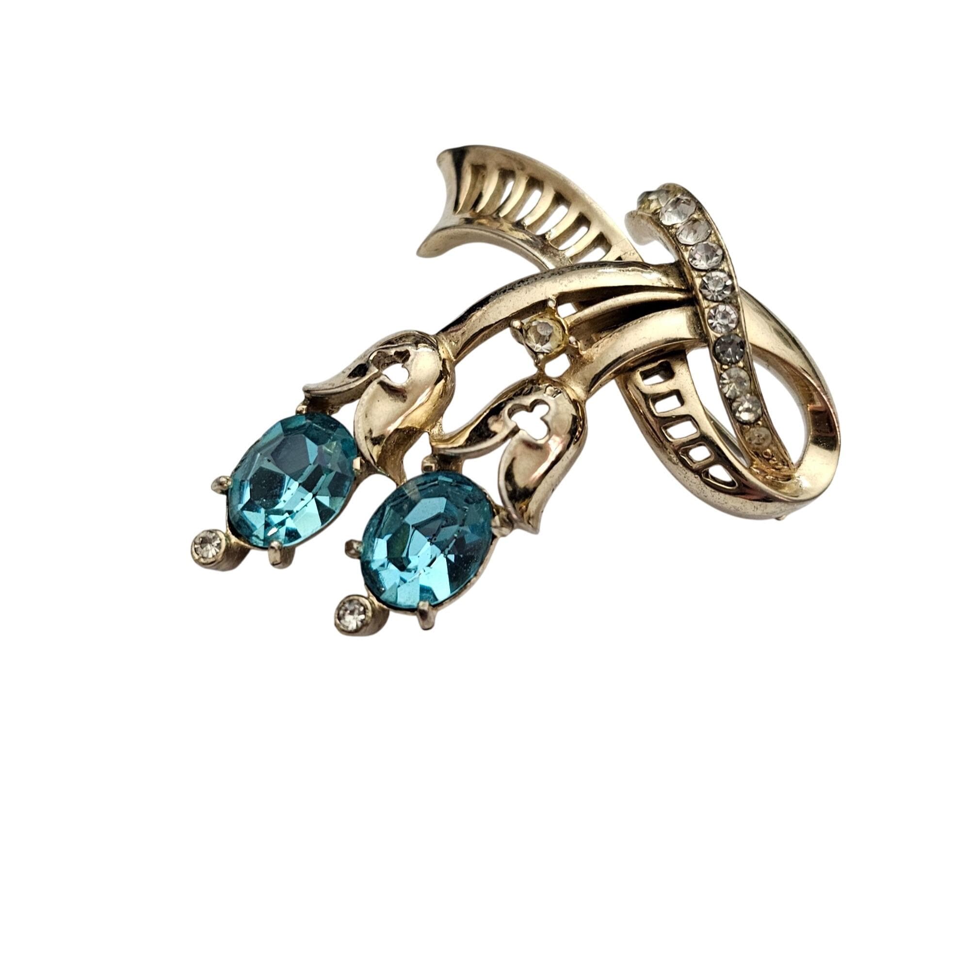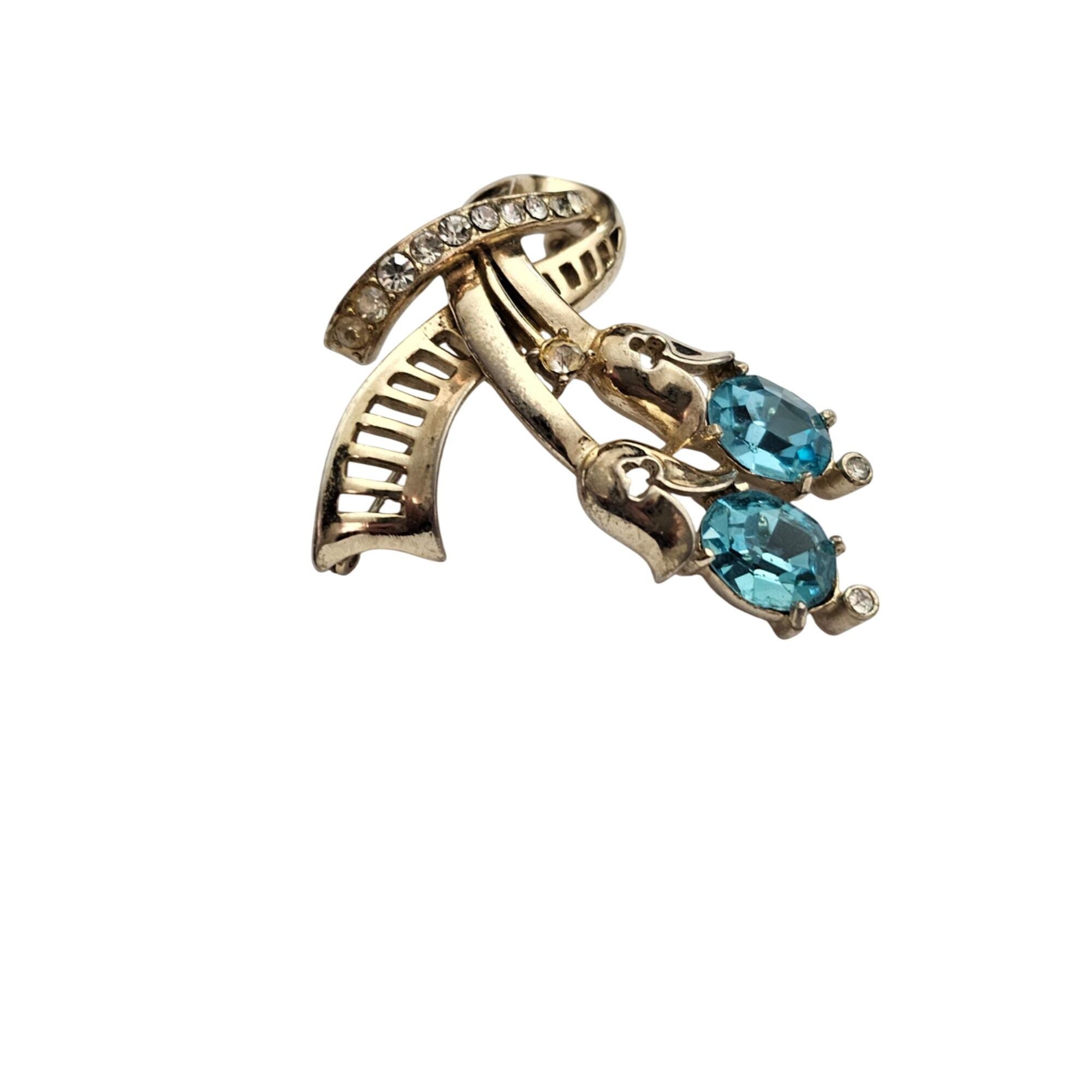 Coro Gold Tone Clear, Blue Oval Rhinestone Ribbon Brooch Pendant Signed, J423