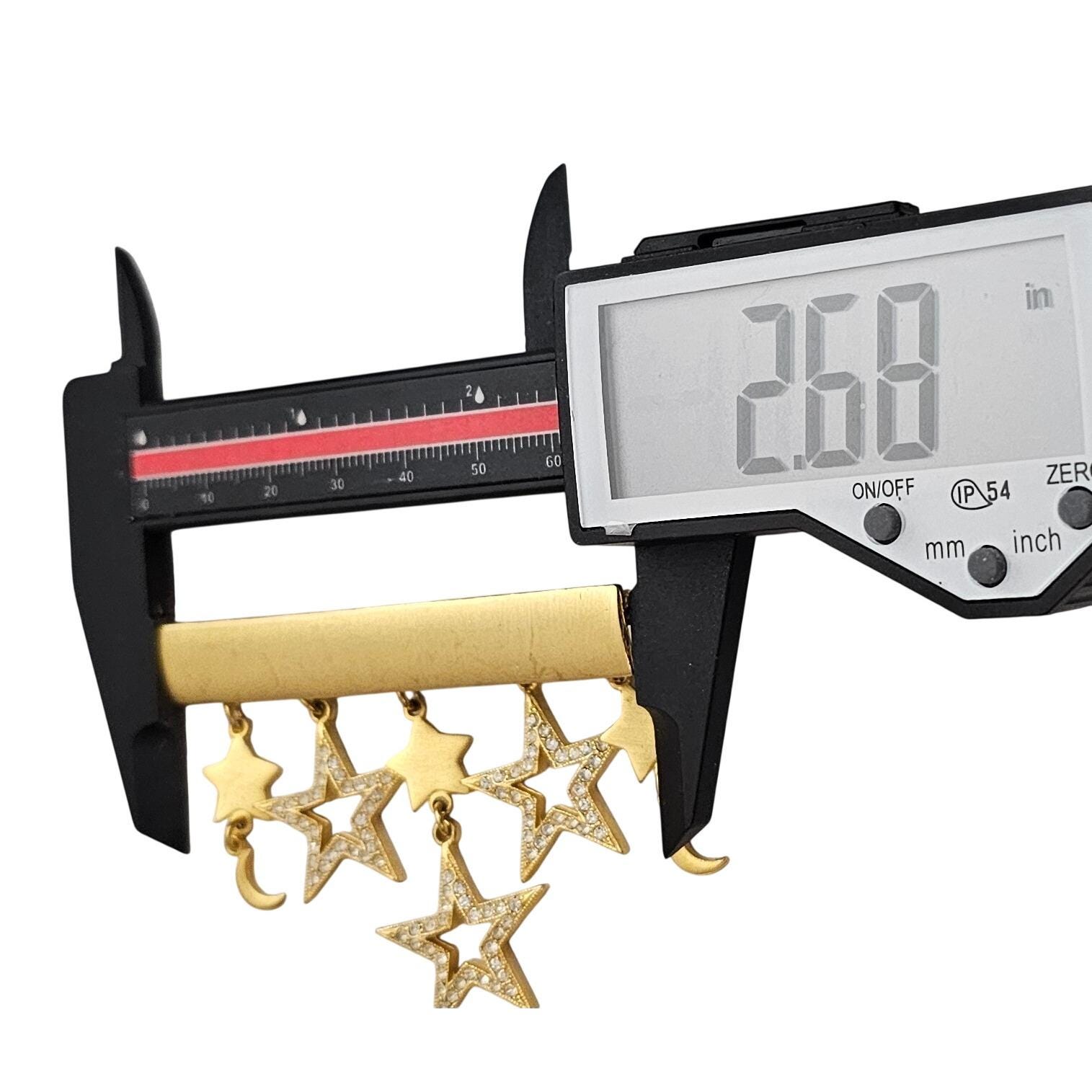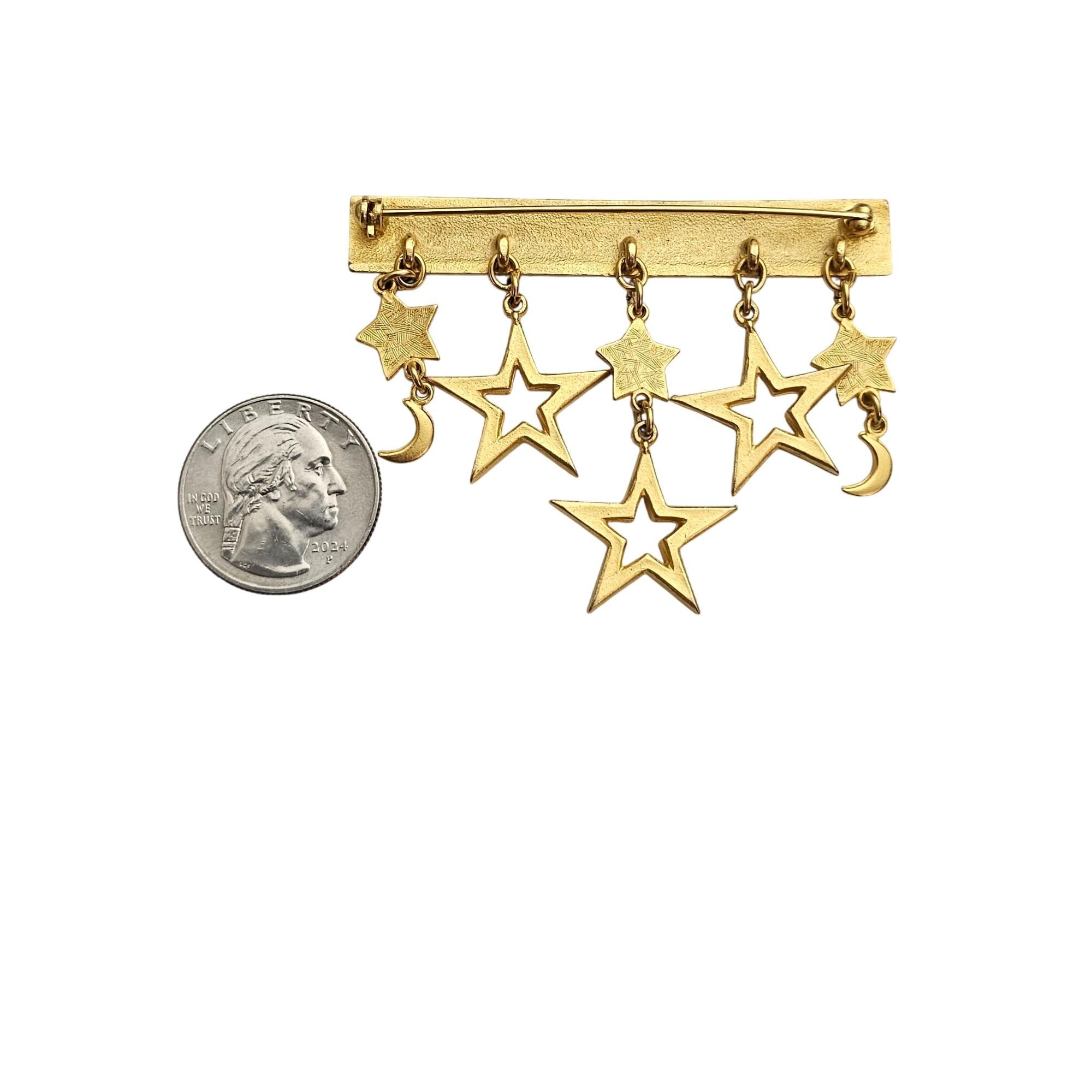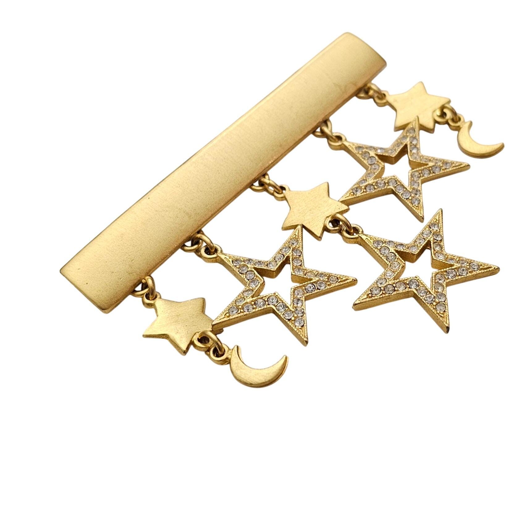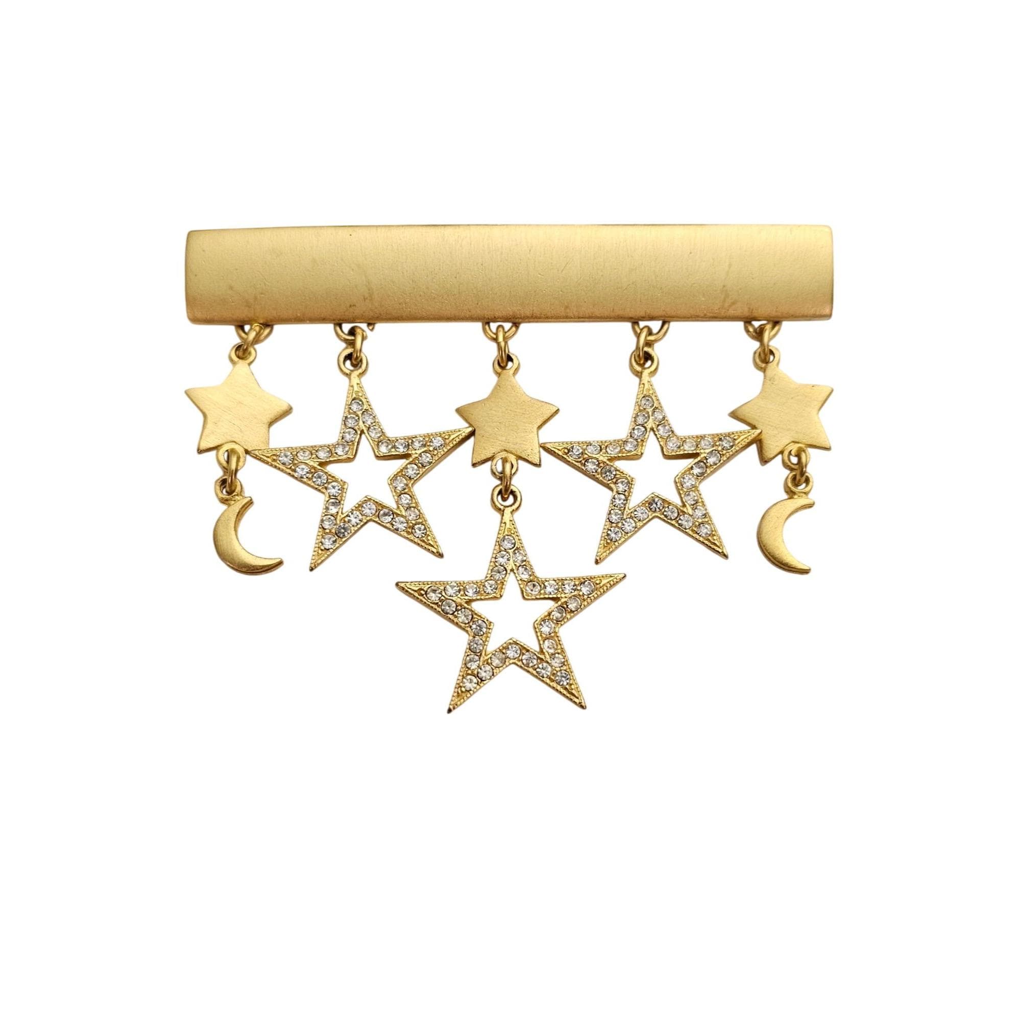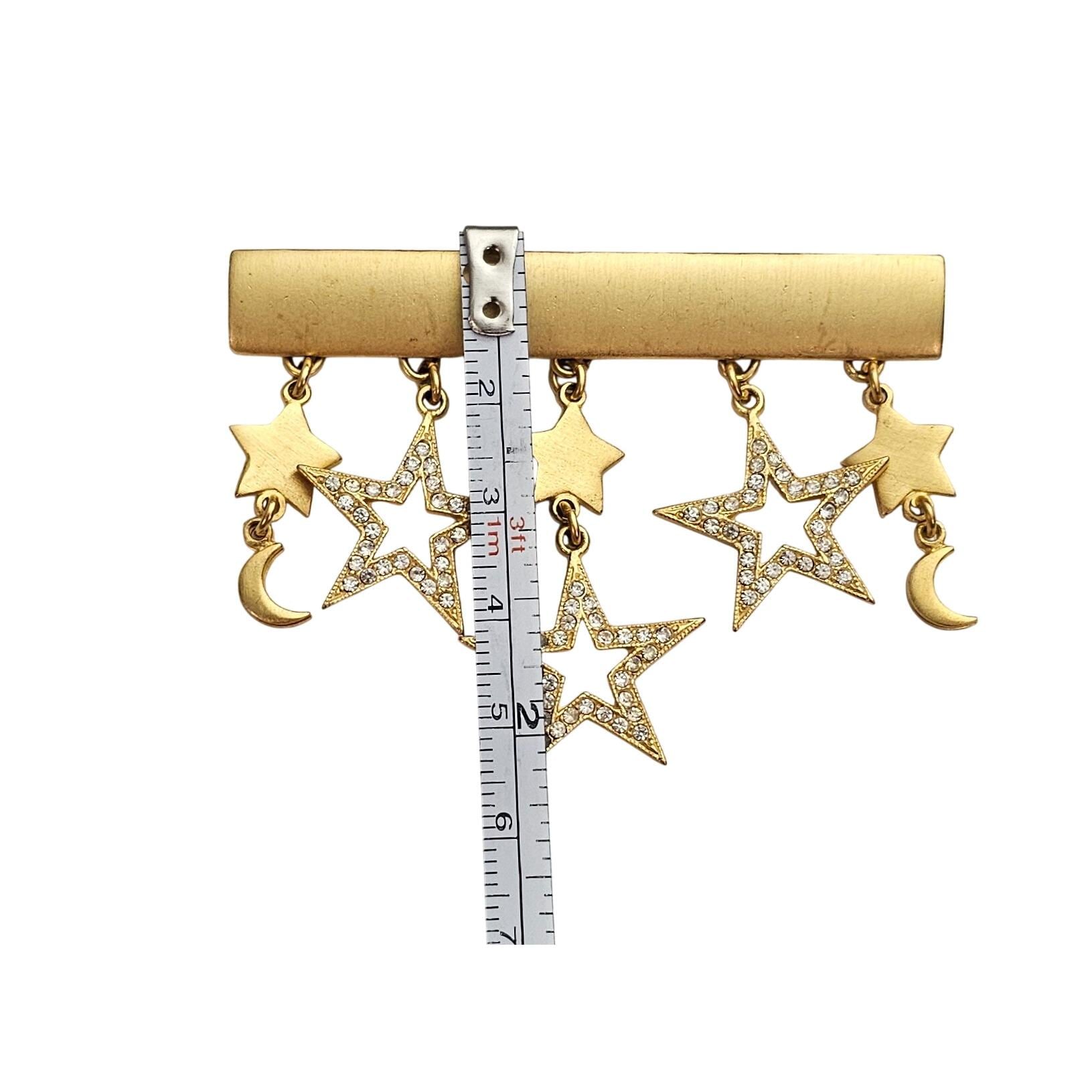 Matte Gold Tone Moon, Stars Dangle Brooch, Clear Rhinestone Bar Pin J374