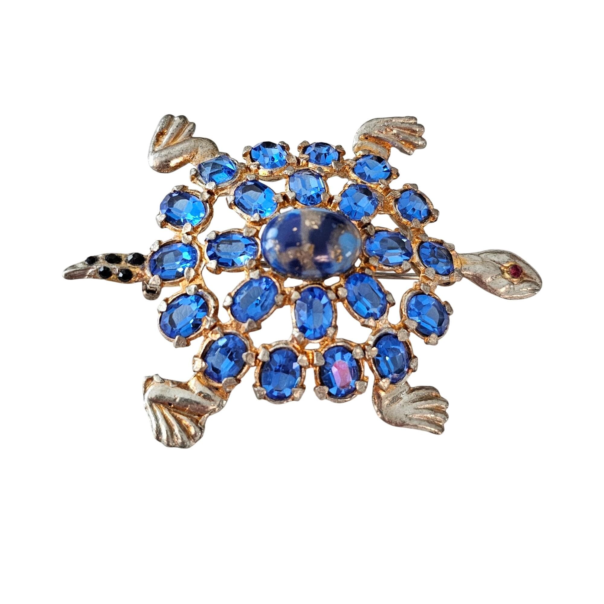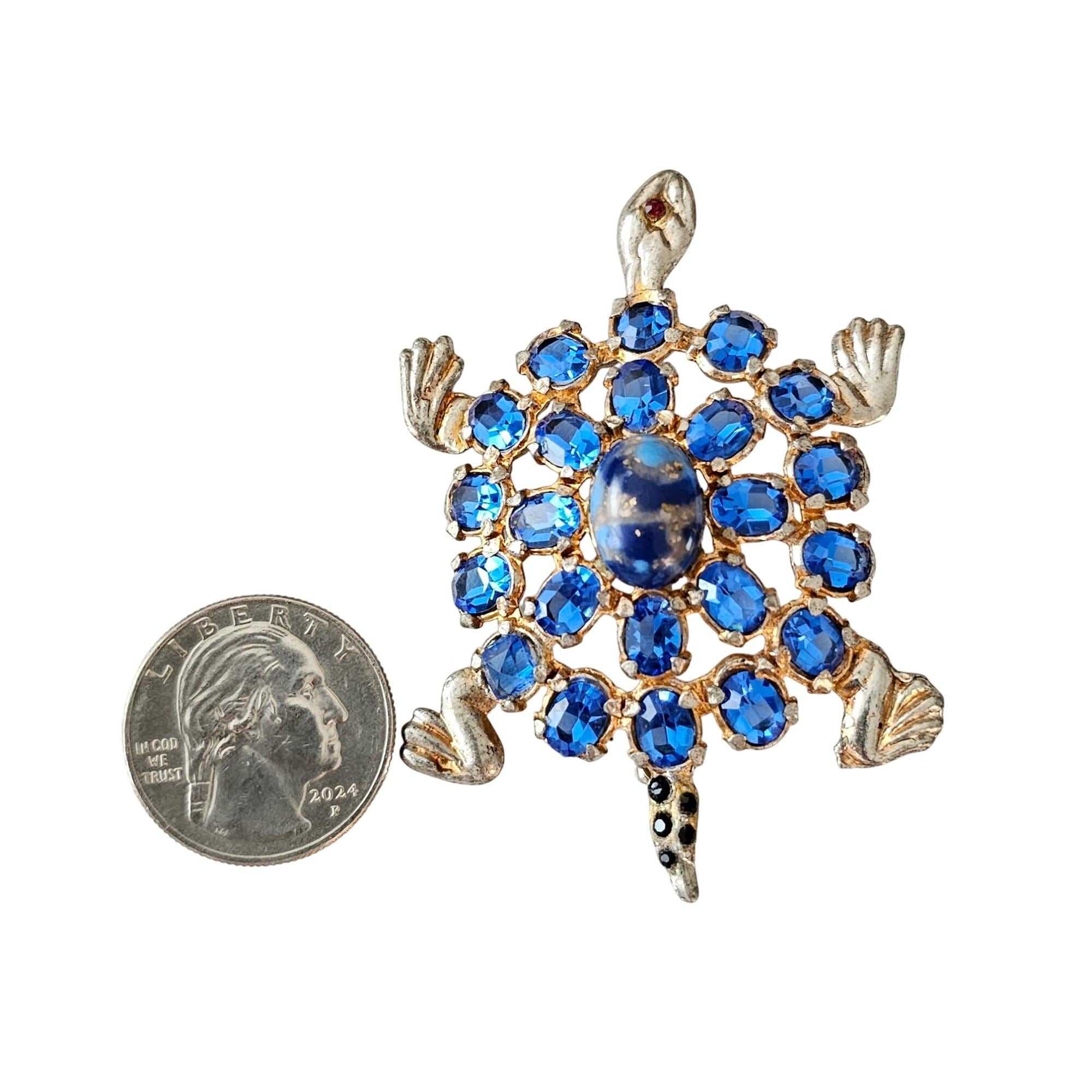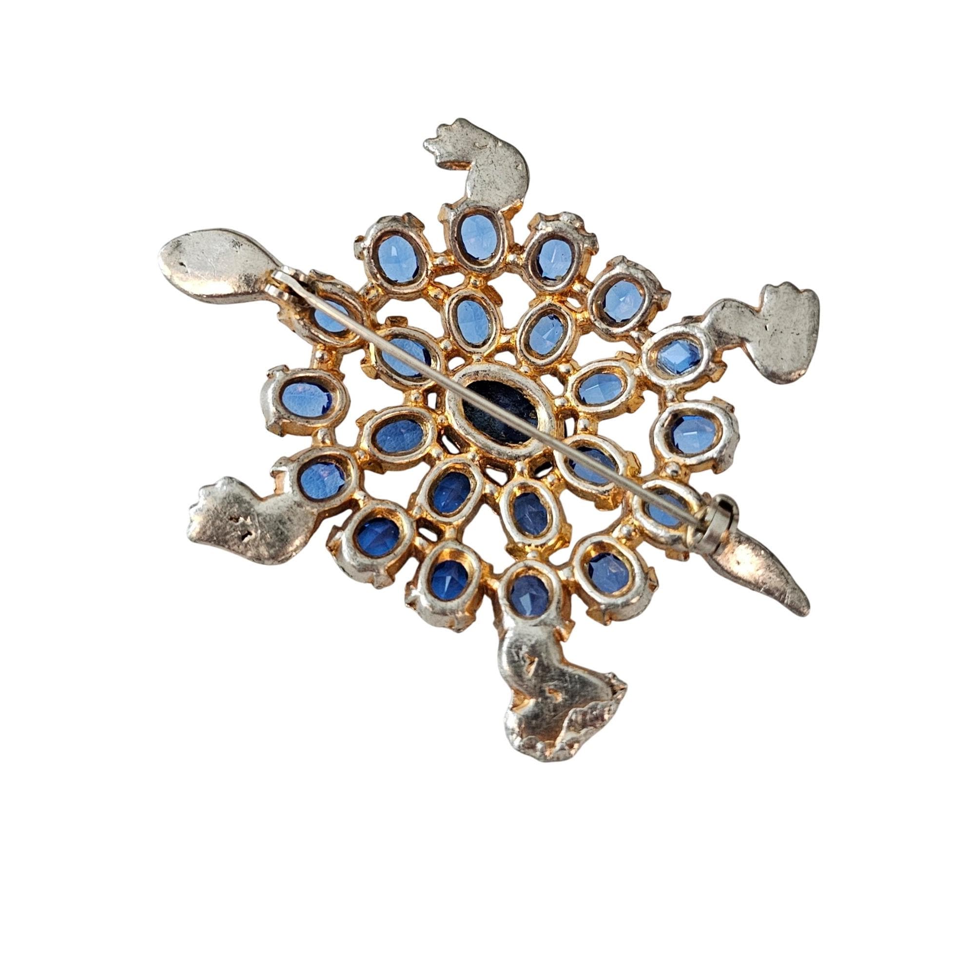 Pot Metal Brooch Blue Open Back Rhinestone Turtle Pin J363