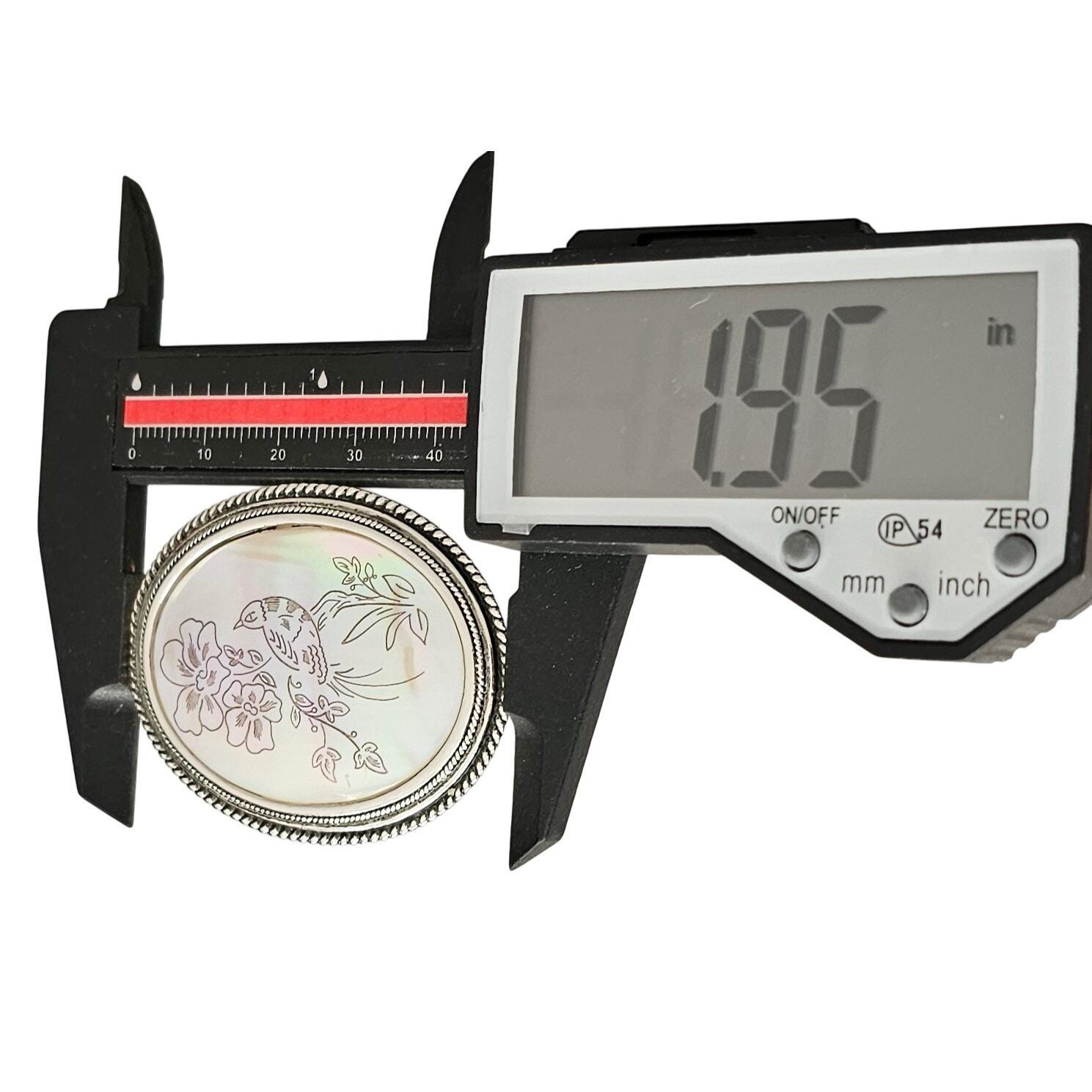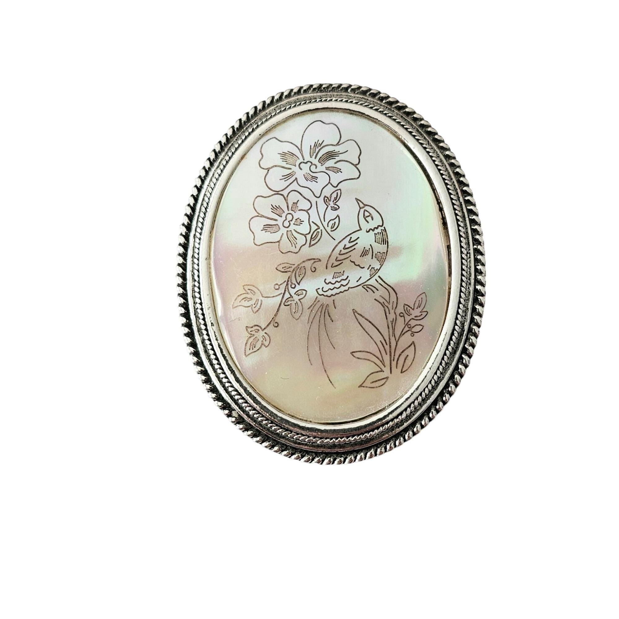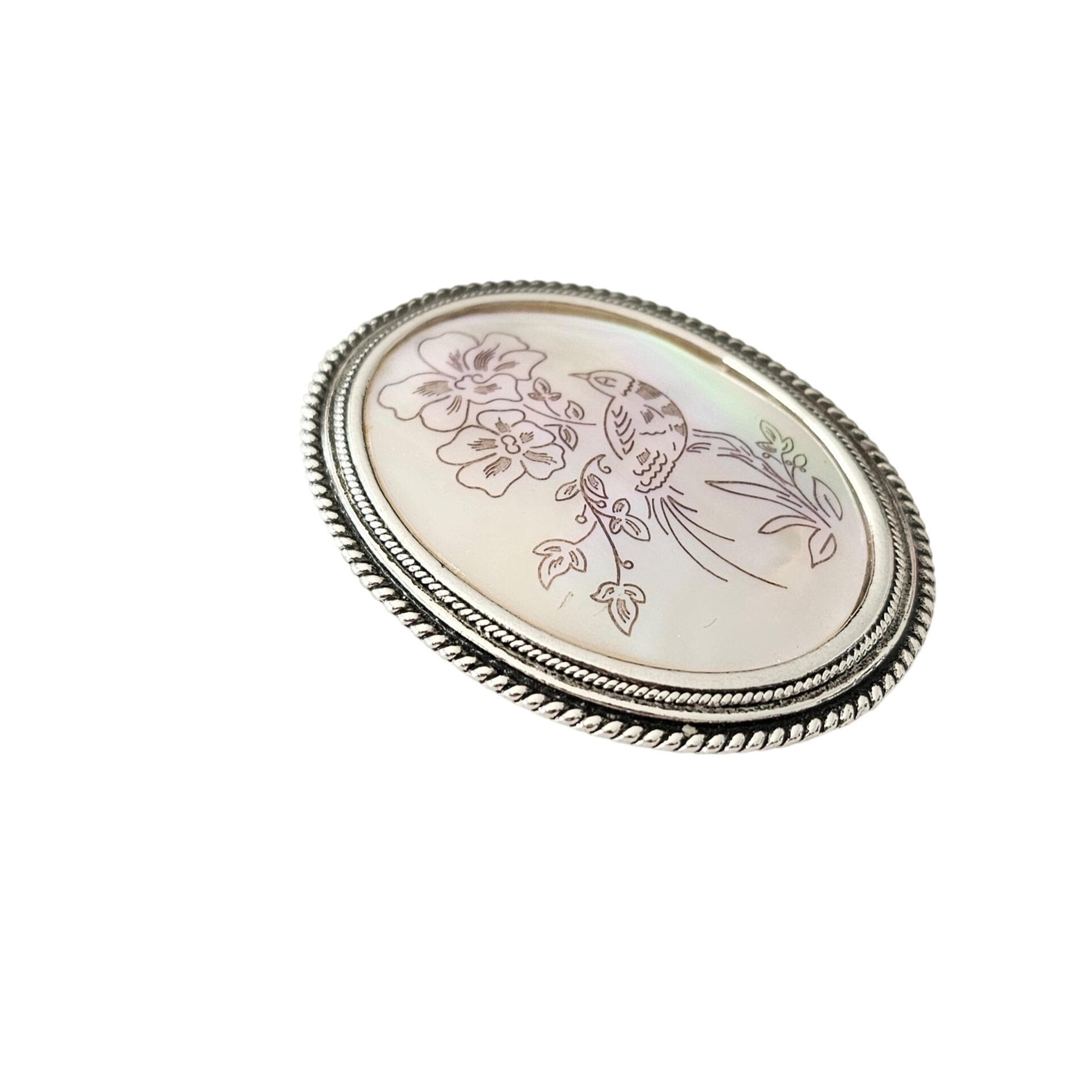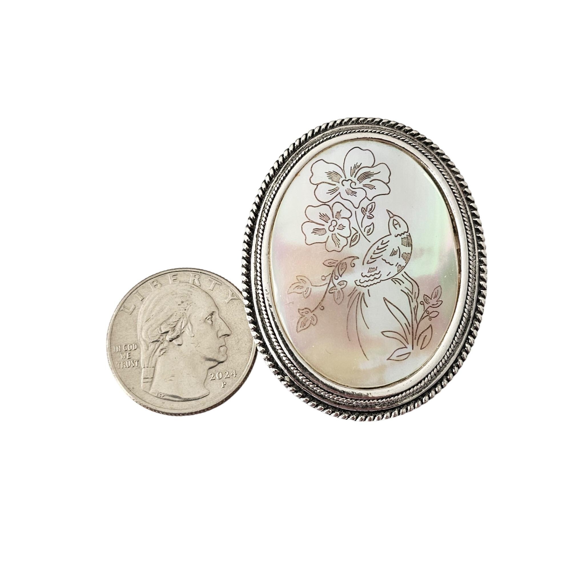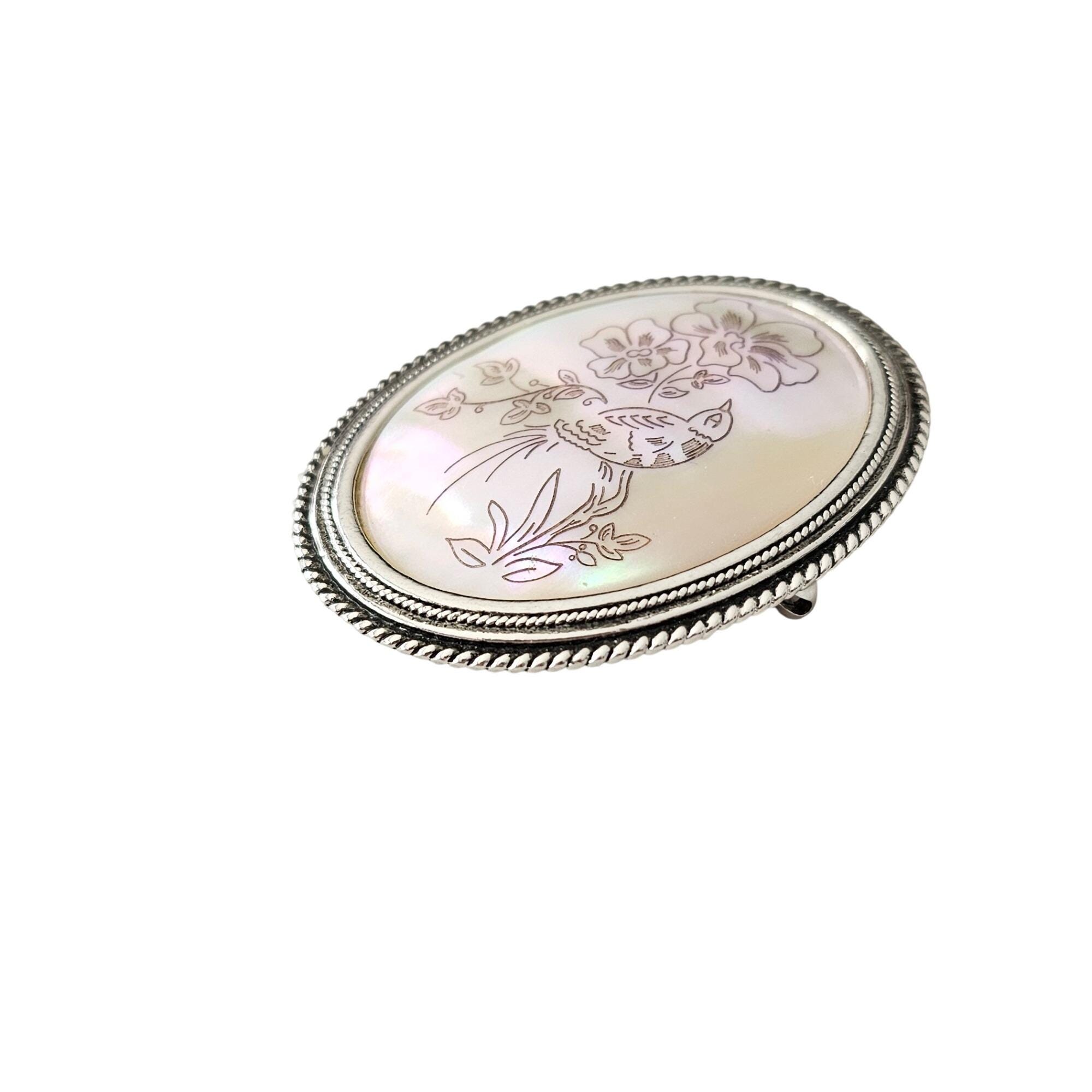 Silver Tone Oval Mother of Pearl Brooch Bird Flower Scene Shell Pin J419