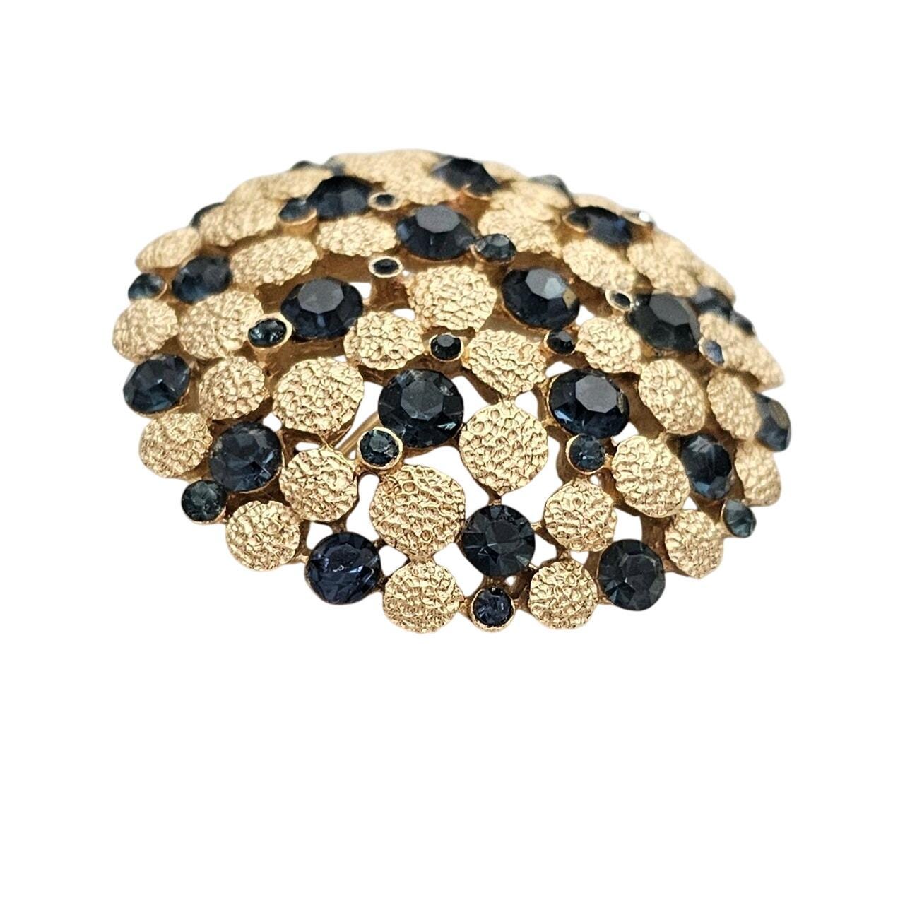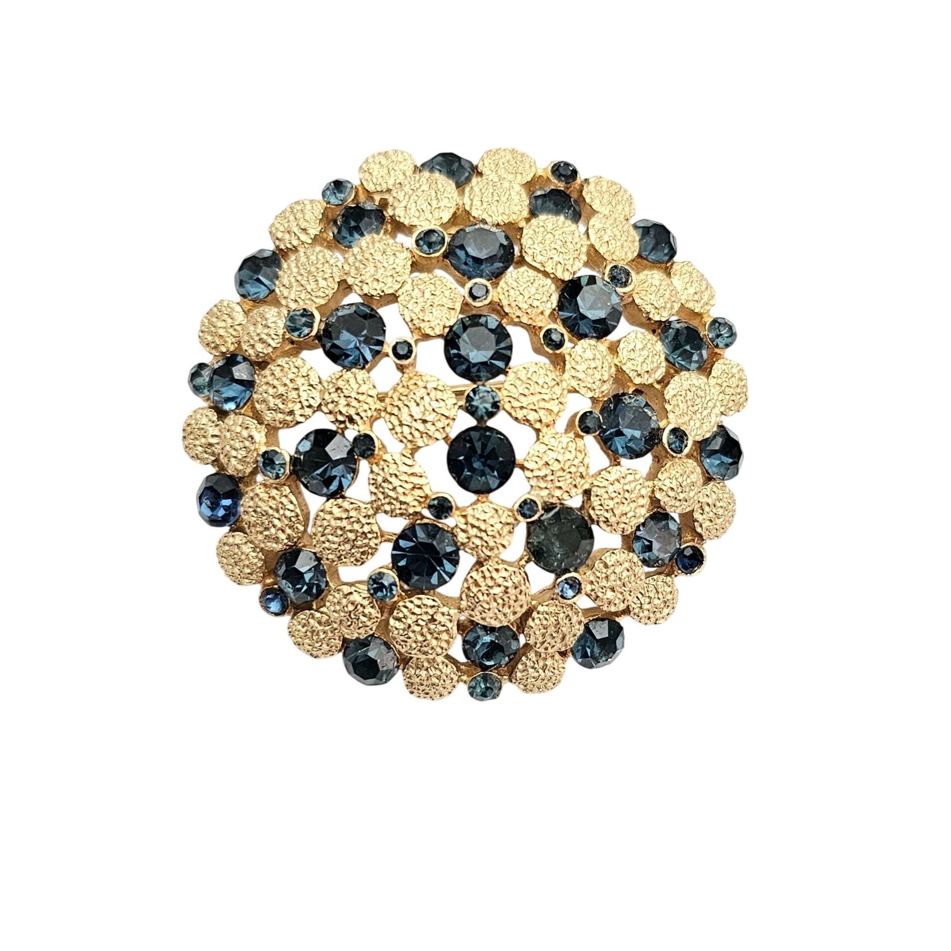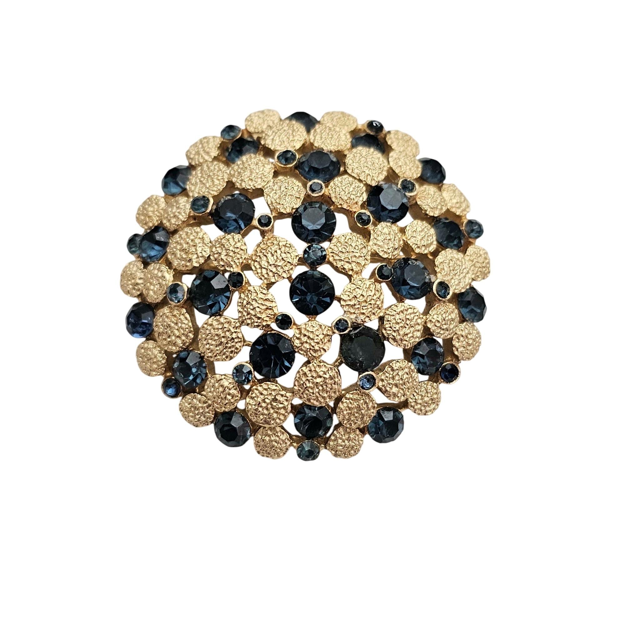 Trifari Crown Over T Gold Tone Blue Rhinestone Dome Brooch Round Textured Pin Signed, J424