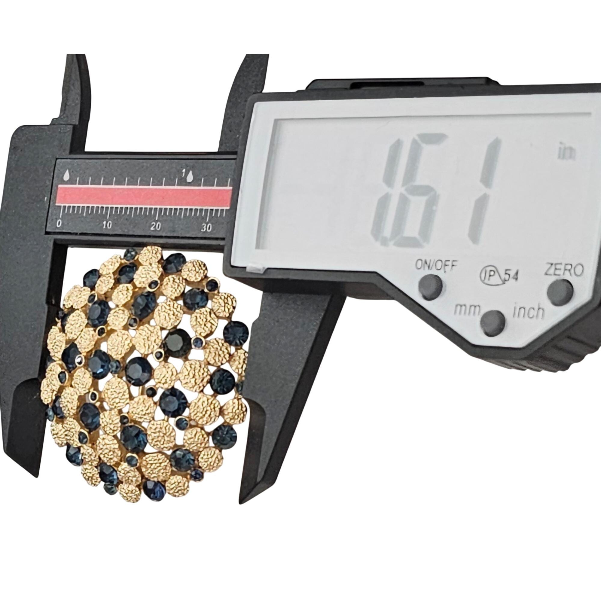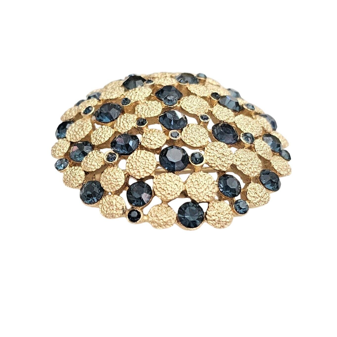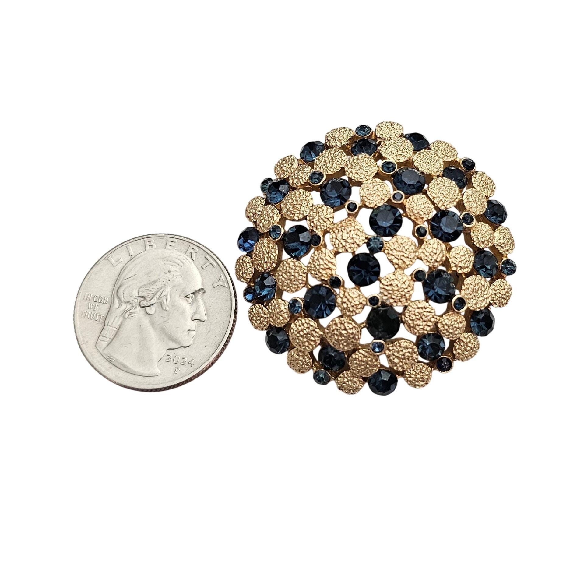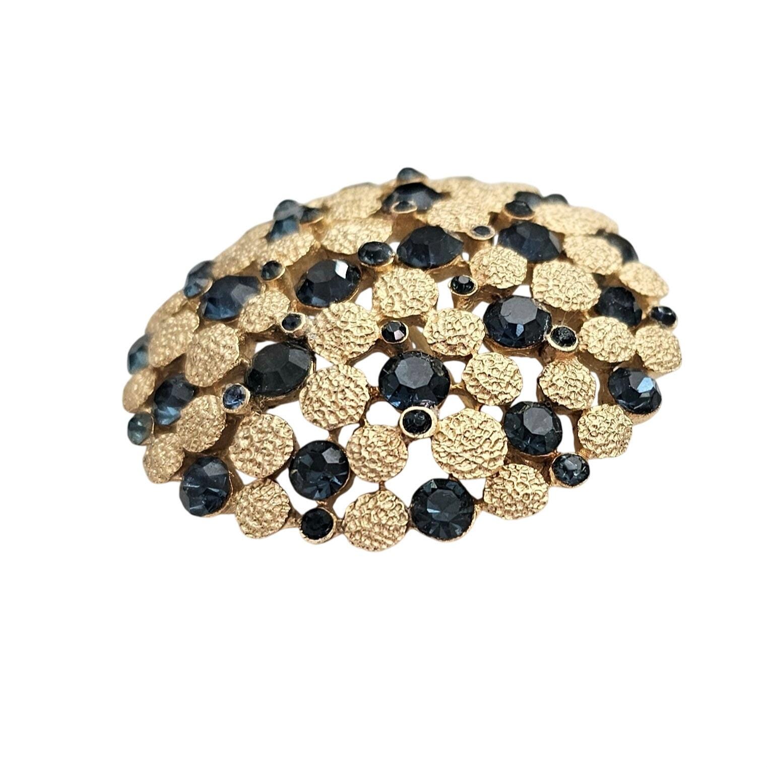Trifari Crown Over T Gold Tone Blue Rhinestone Dome Brooch Round Textured Pin Signed, J424