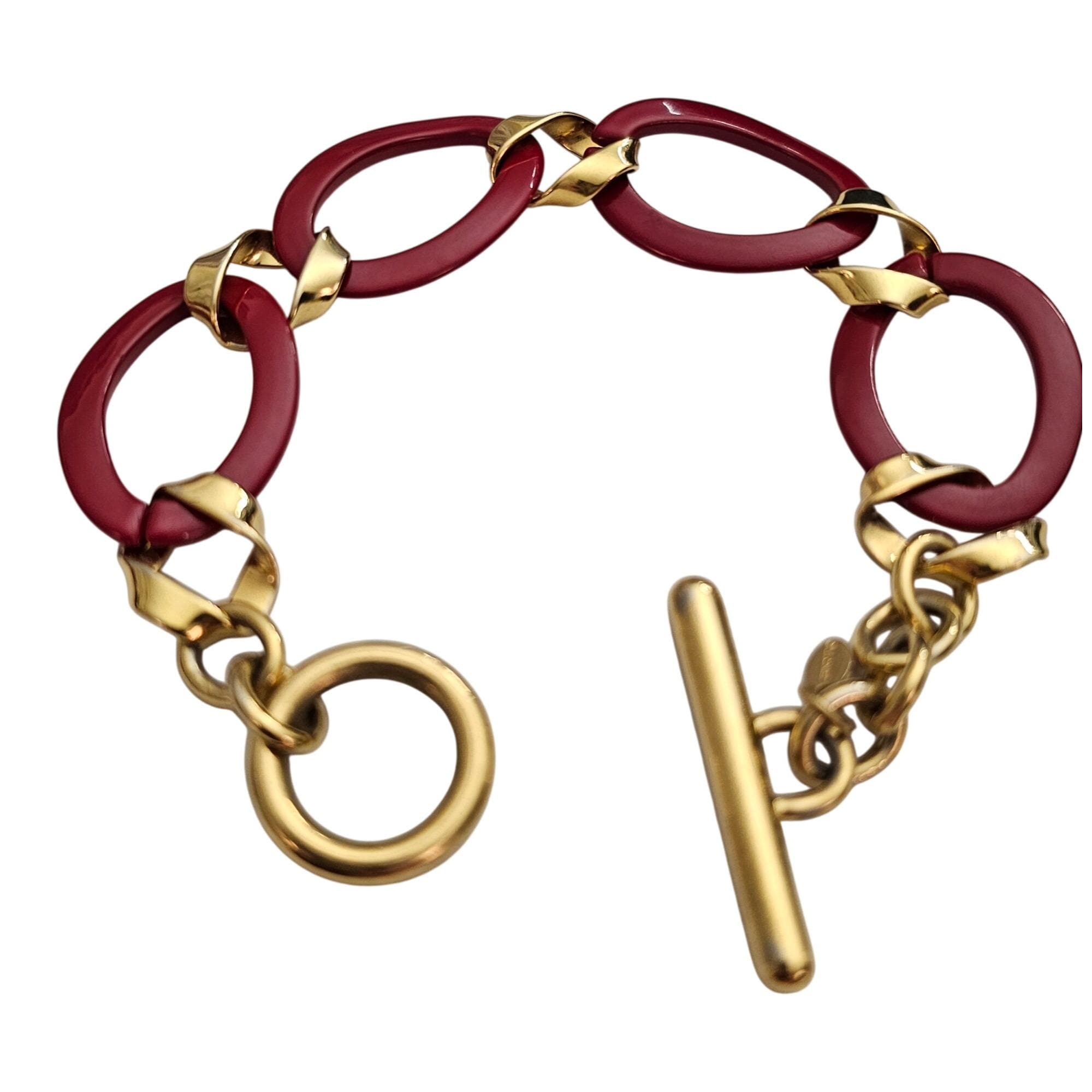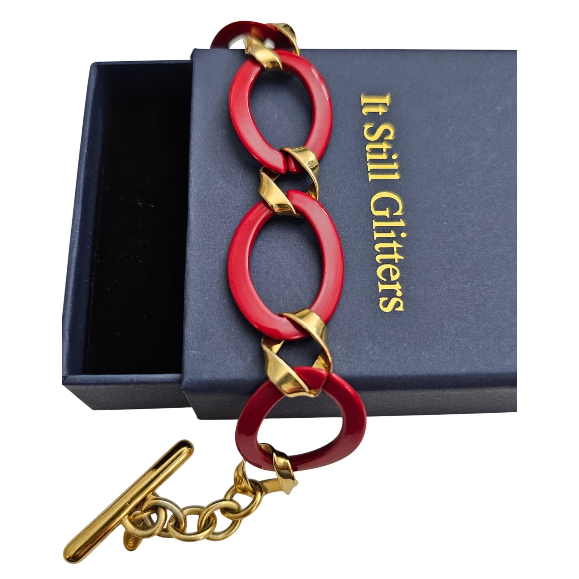 Monet Red Enamel Oval Chain Link Bracelet Vintage Signed J440