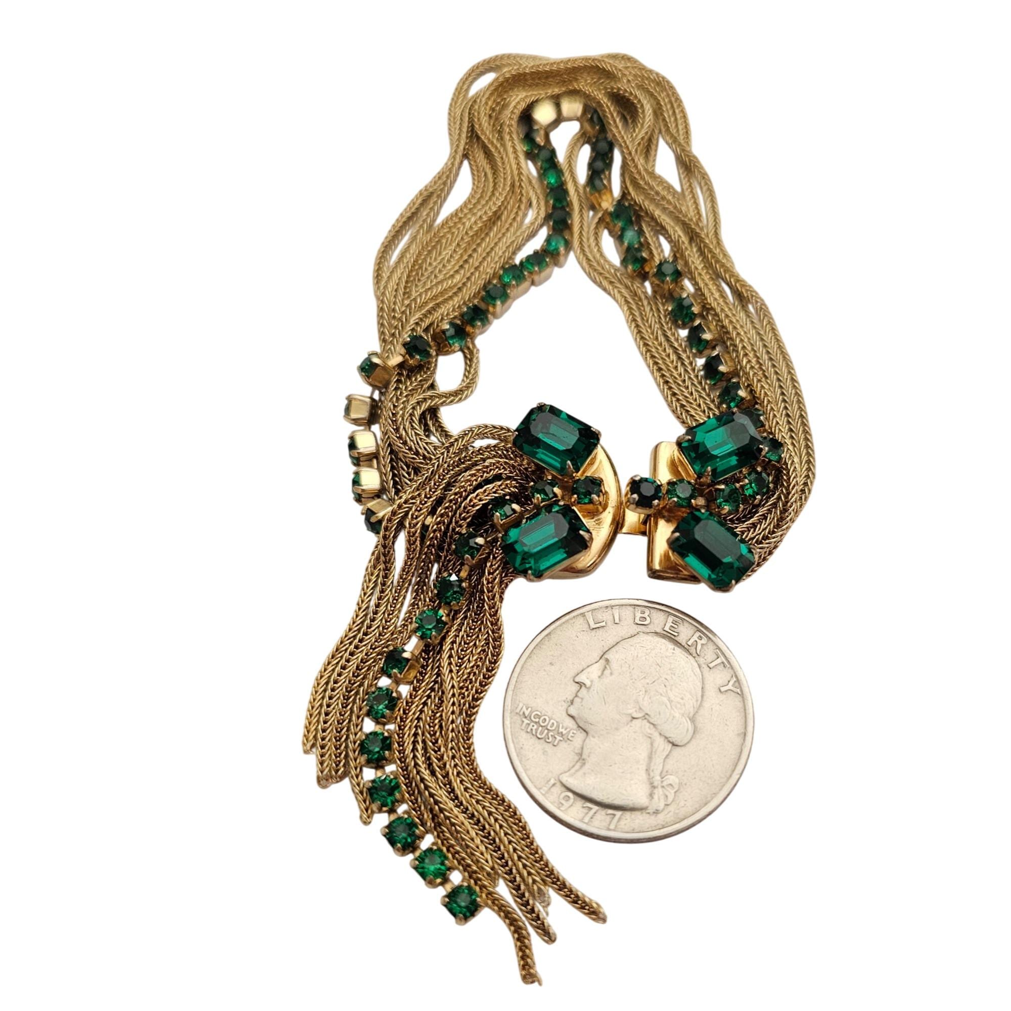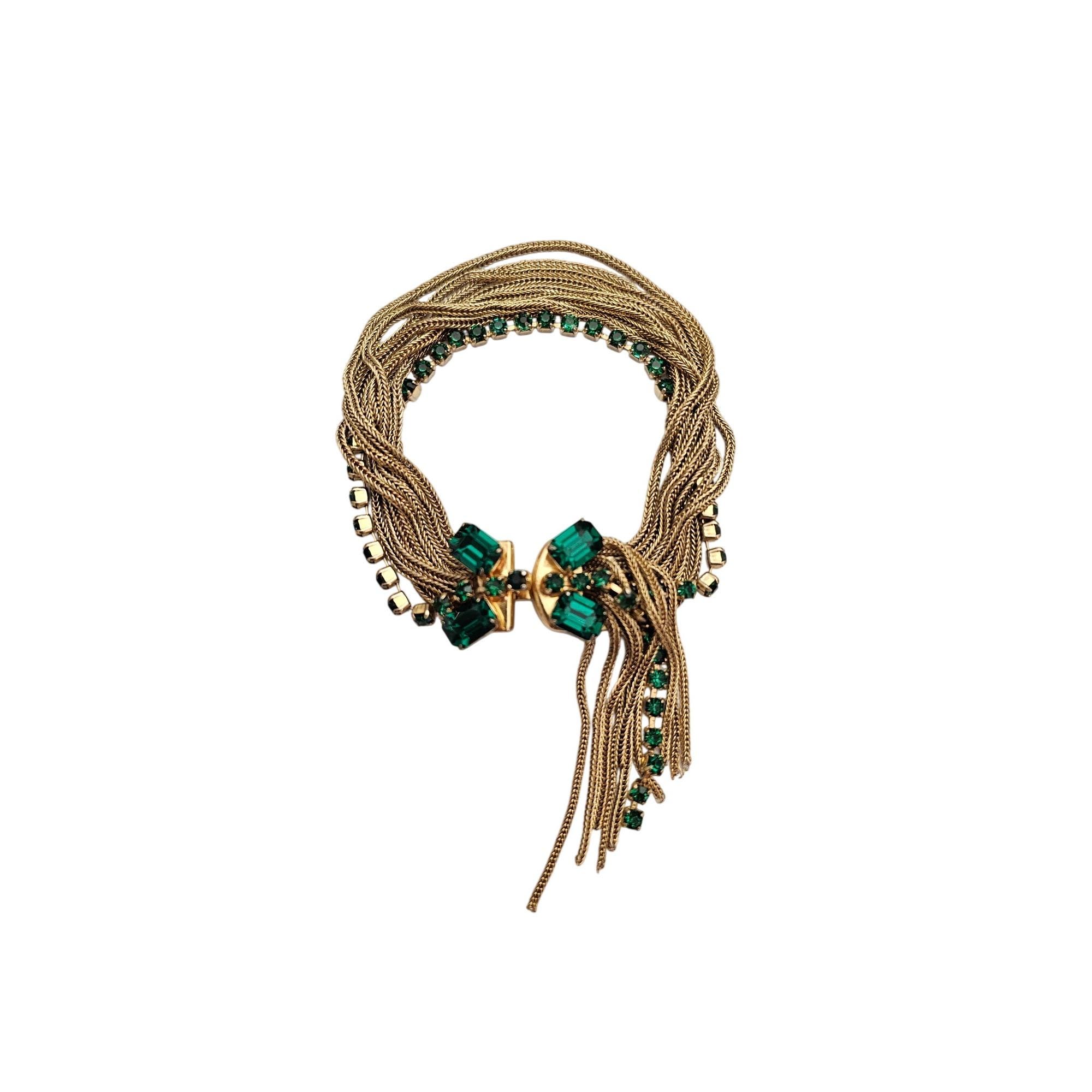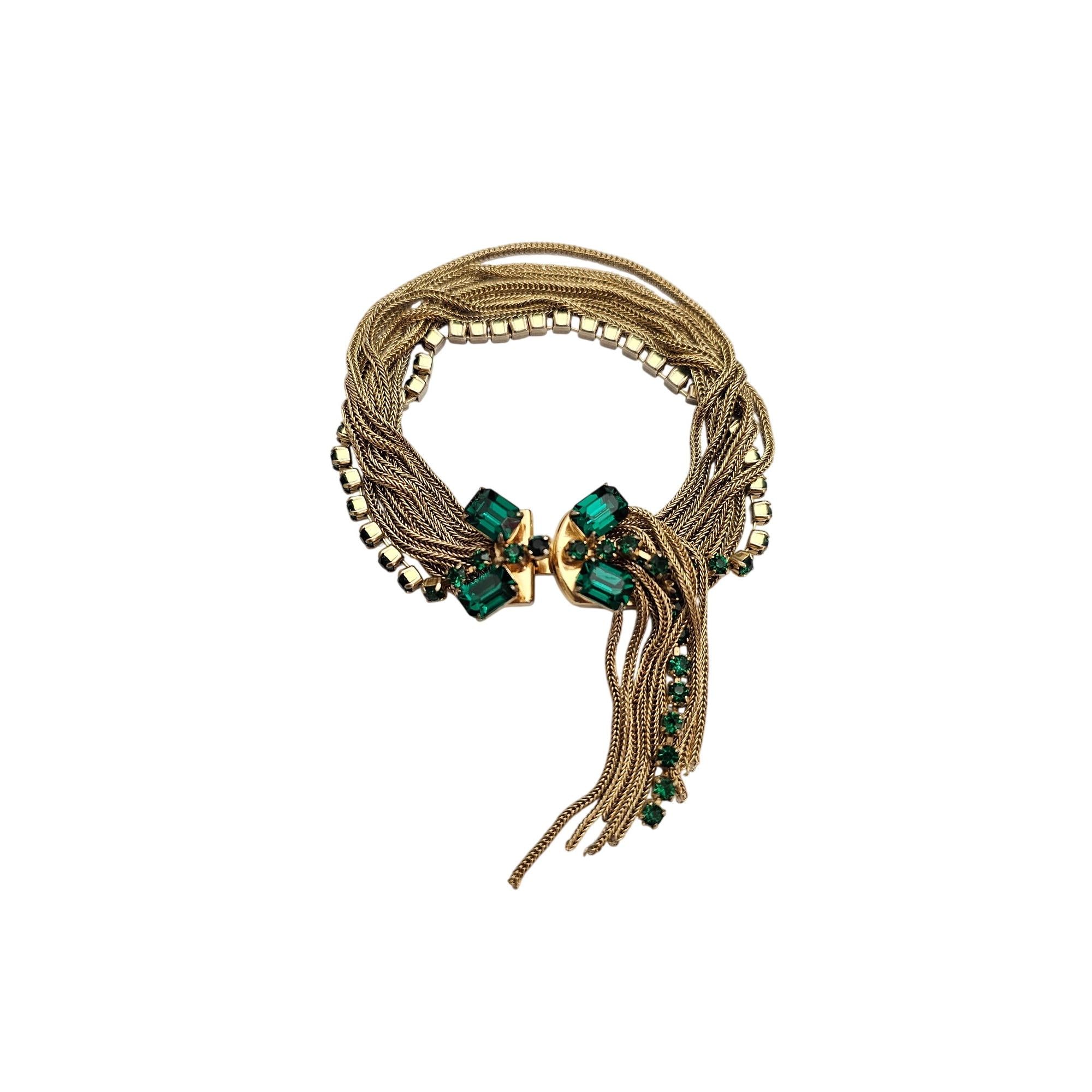Multi Chain Bracelet Ornate Tongue Clasp Vintage Green Rhinestone Tassel J428