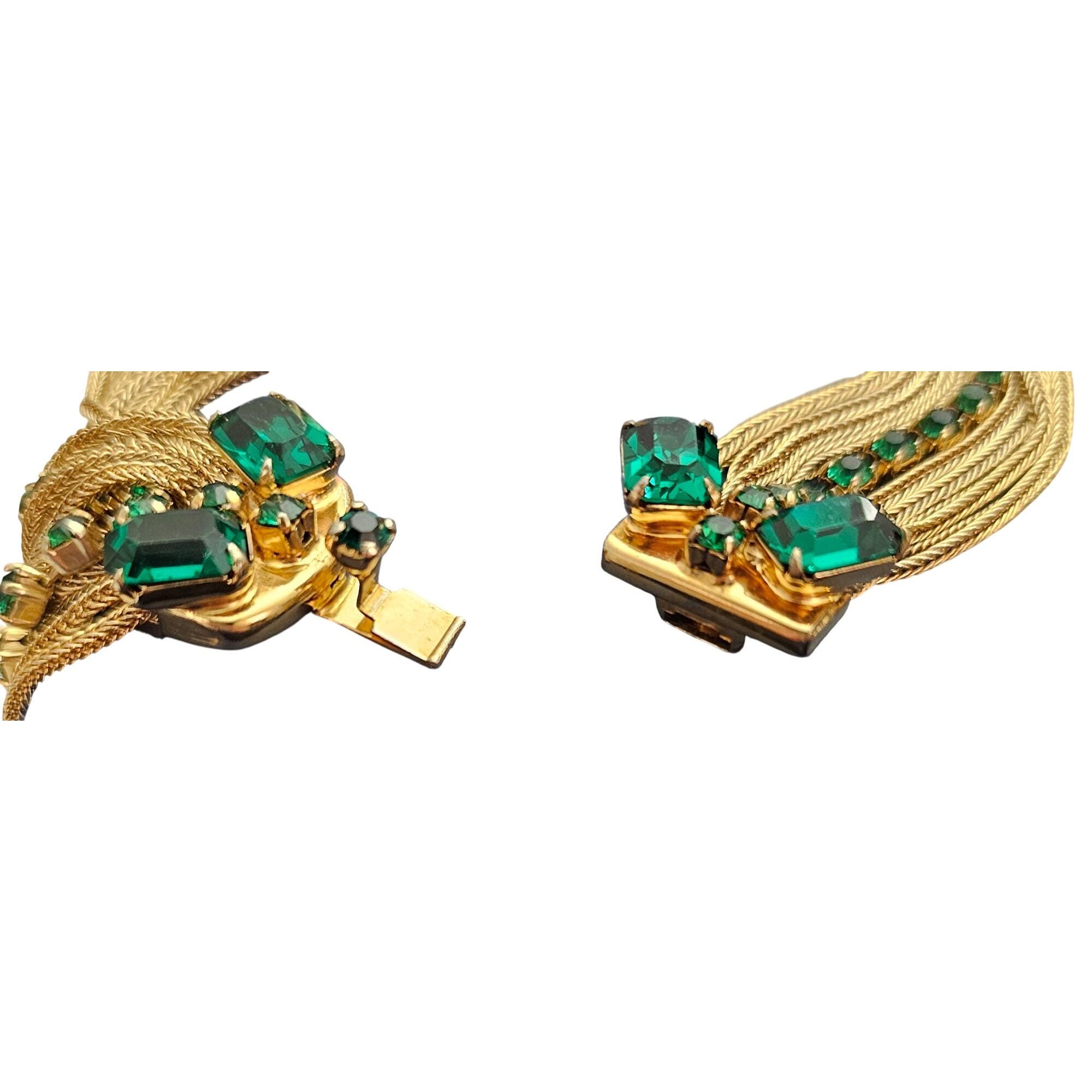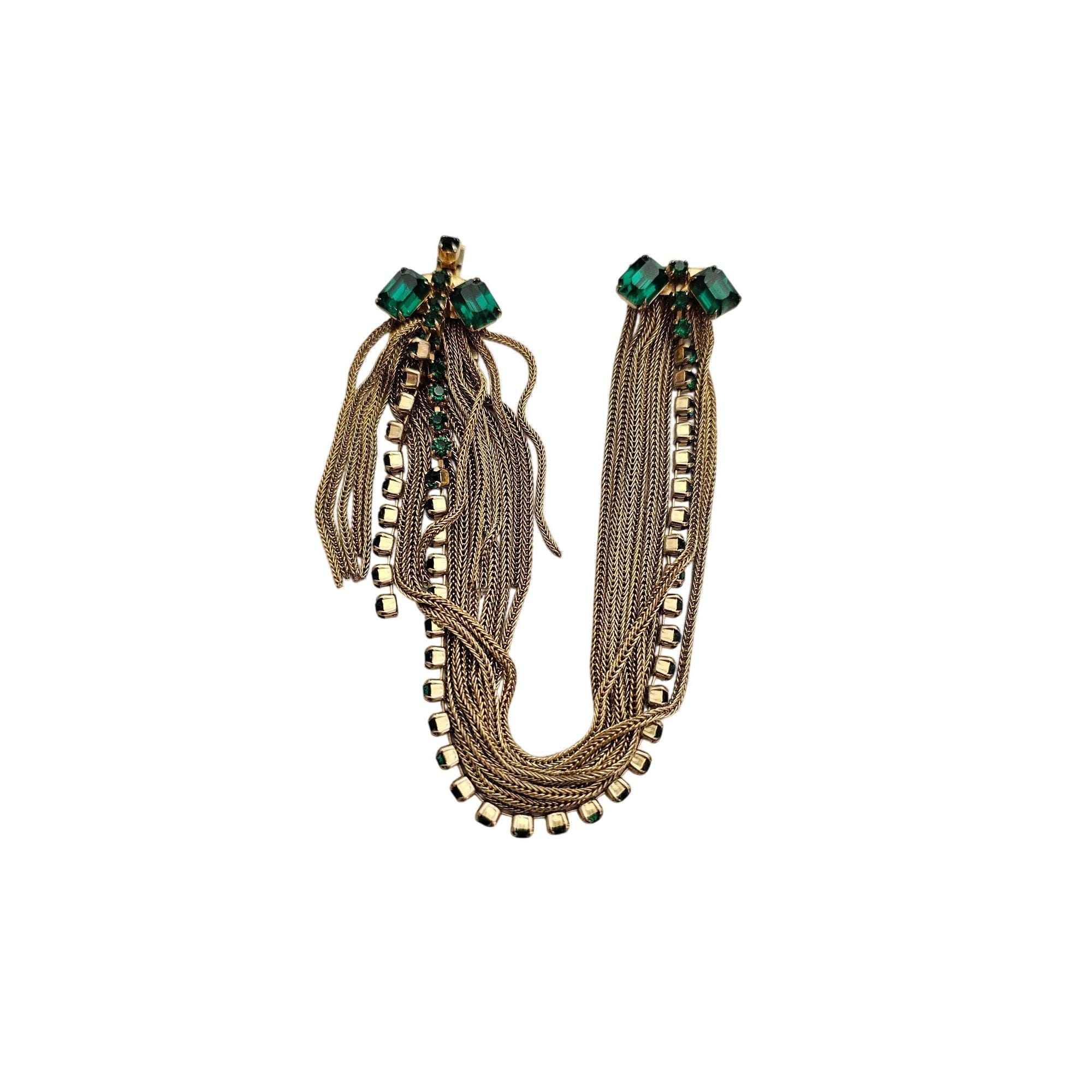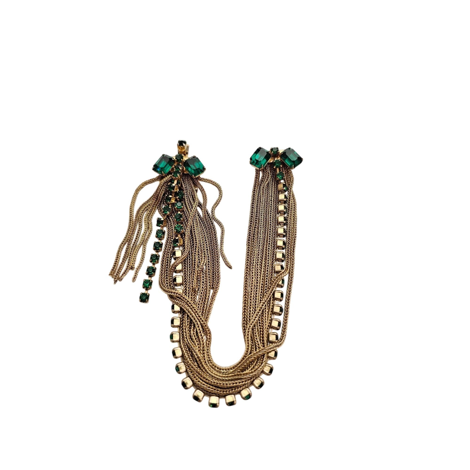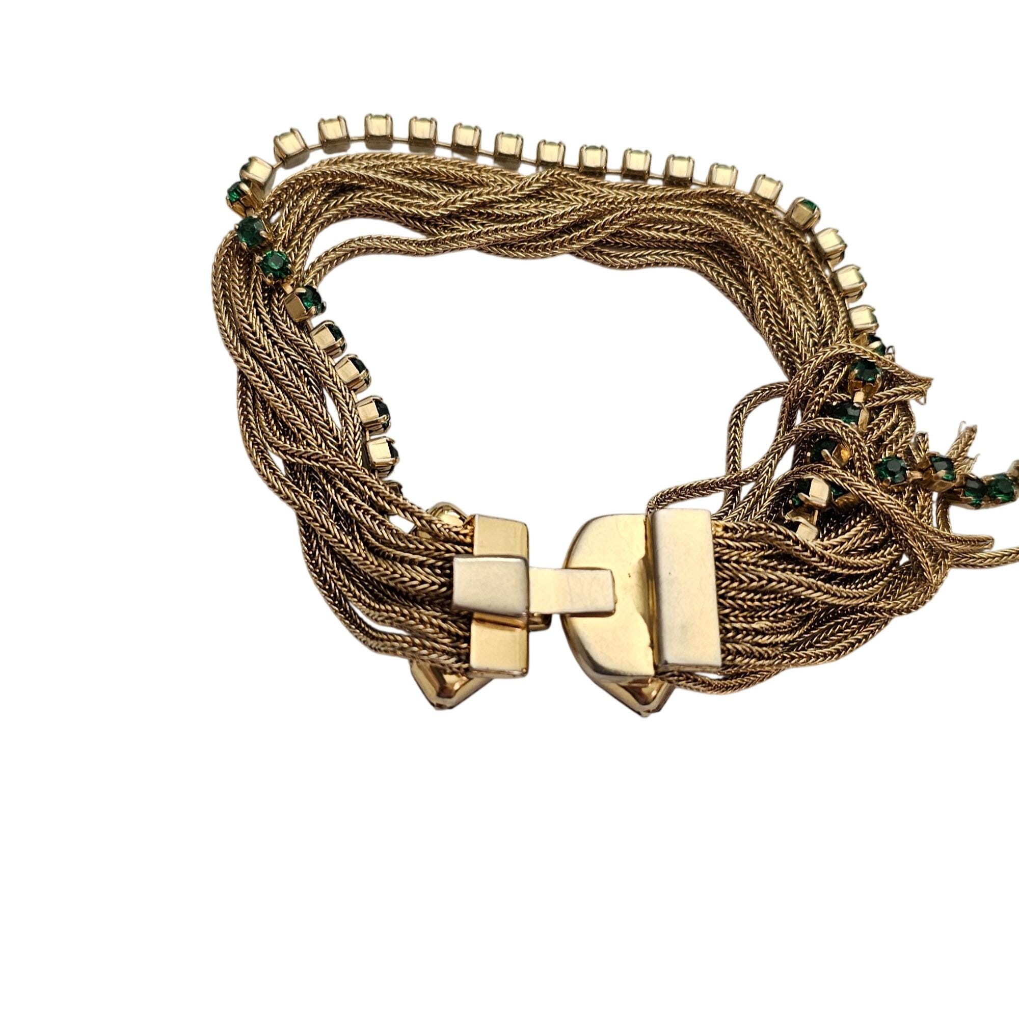 Multi Chain Bracelet Ornate Tongue Clasp Vintage Green Rhinestone Tassel J428