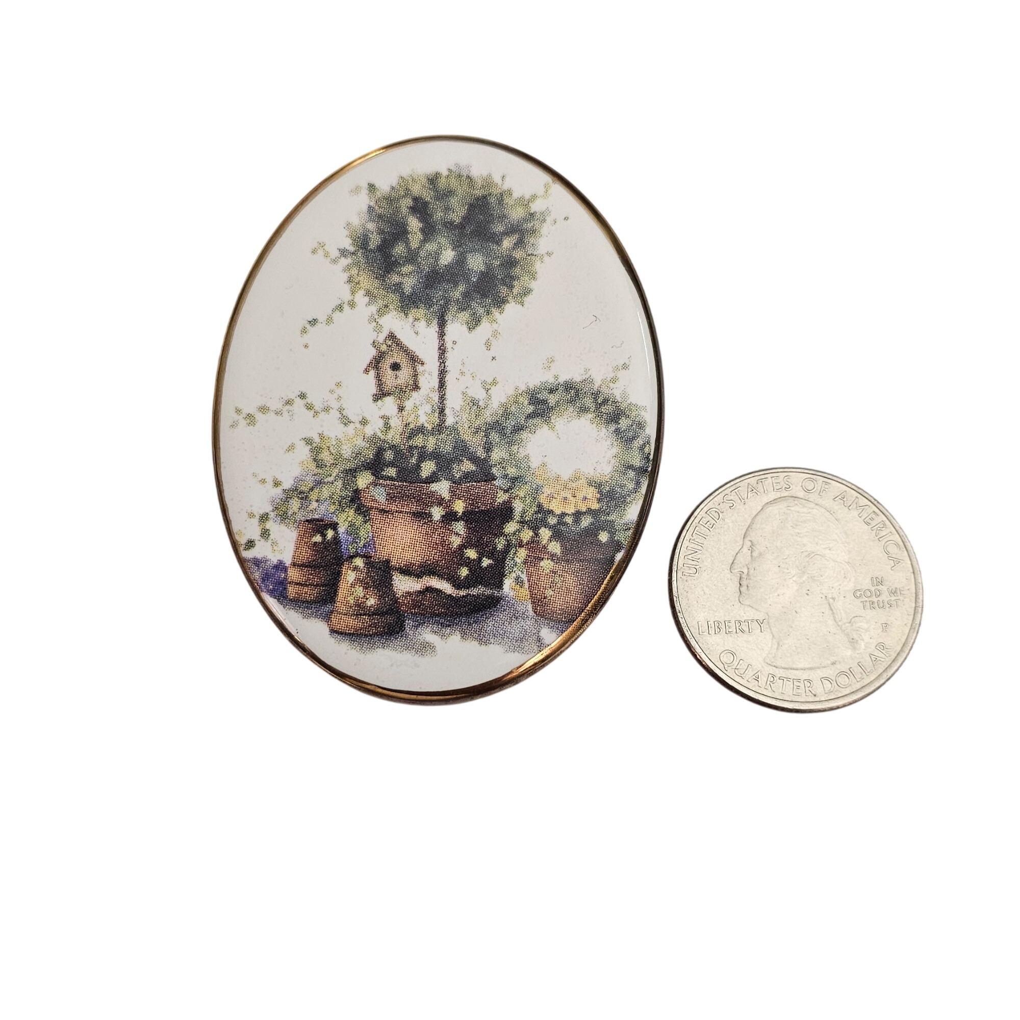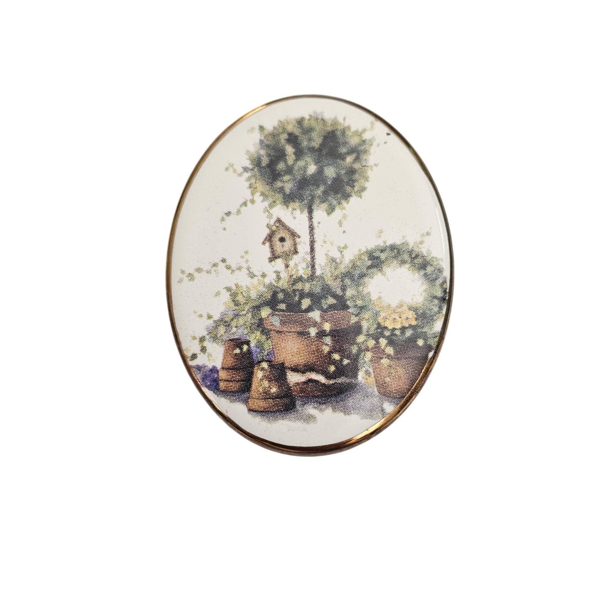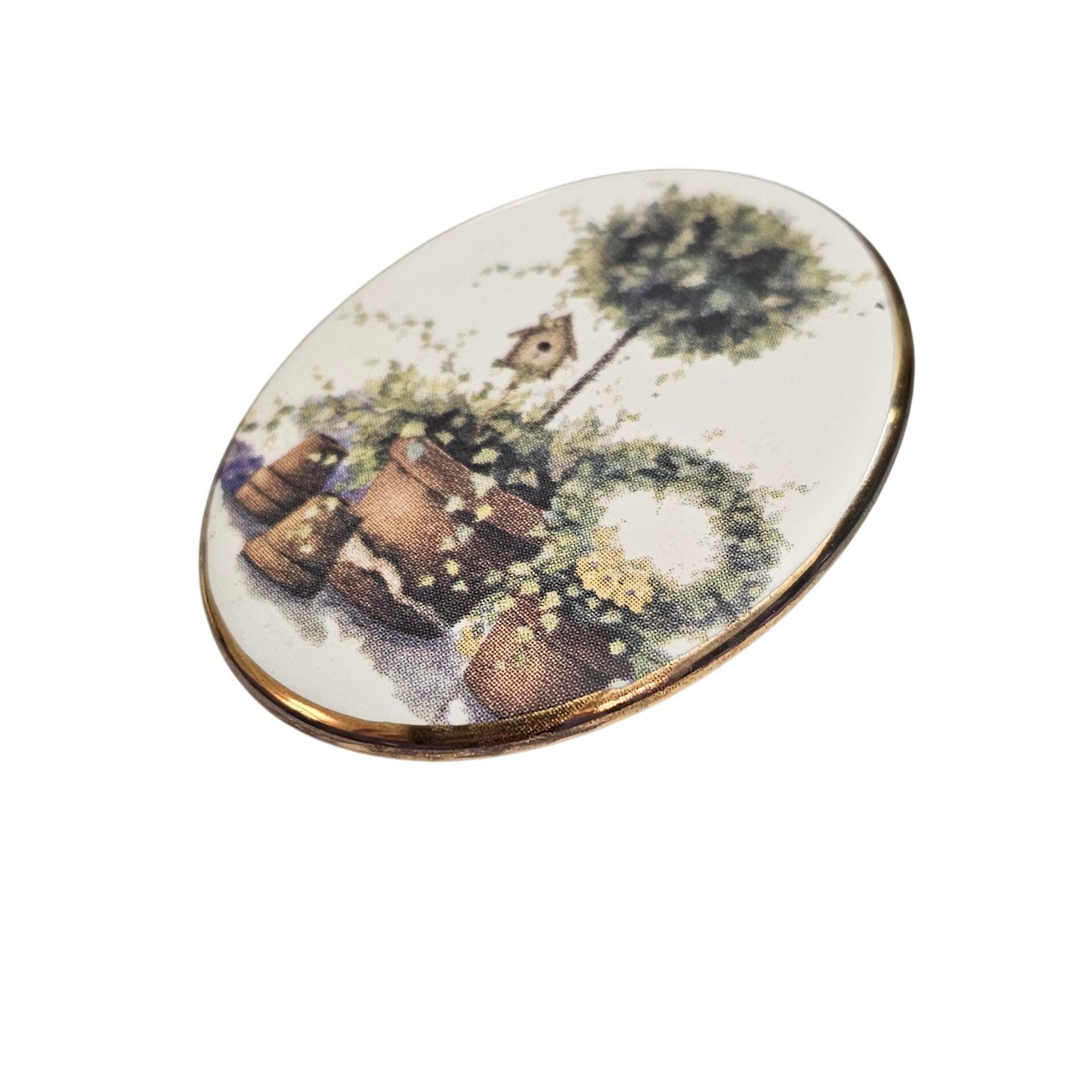 Bone China Glazed Style Bird House Topiary Brooch Oval Pin J493