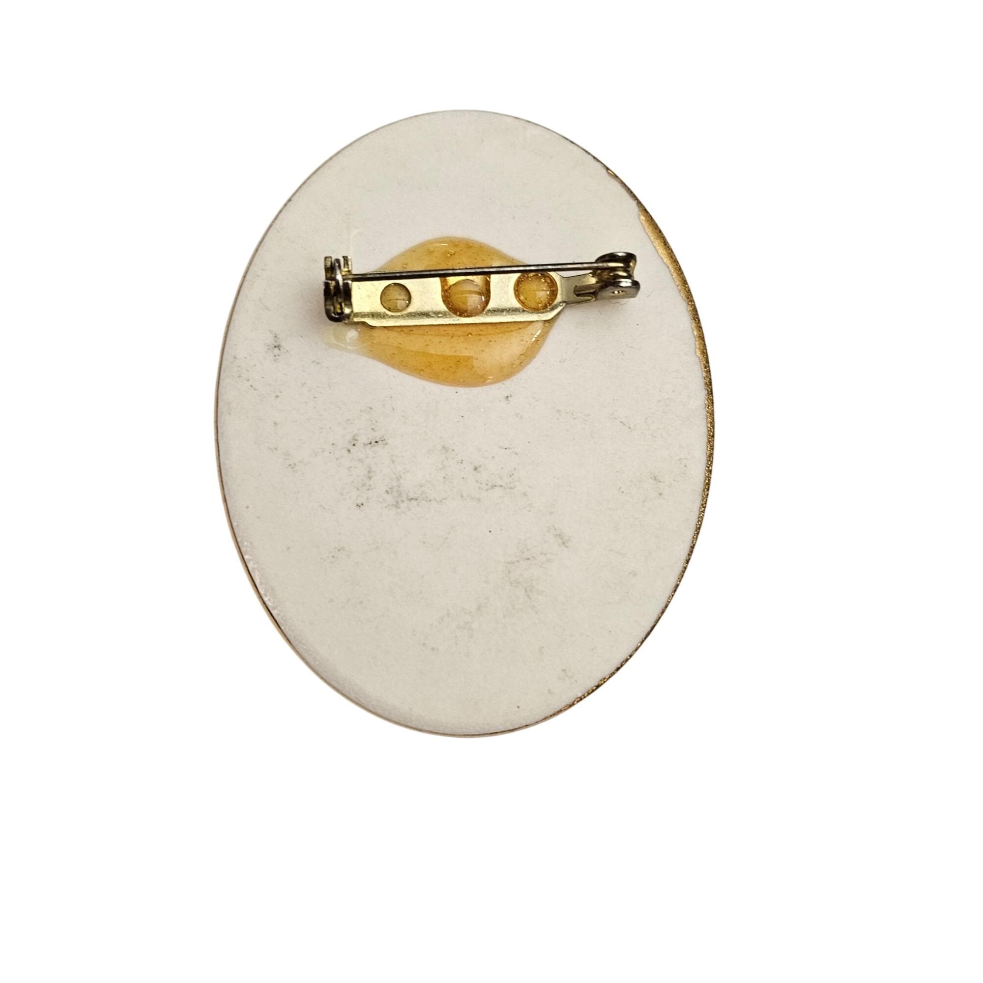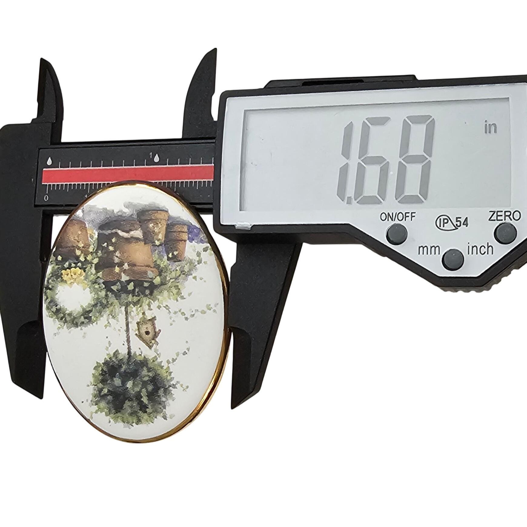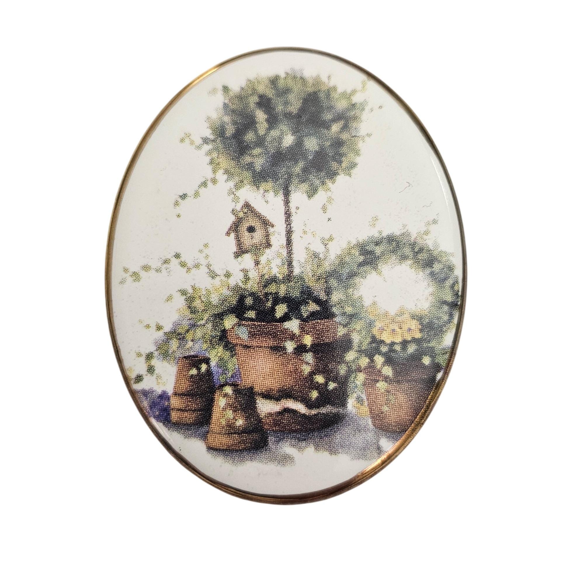 Bone China Glazed Style Bird House Topiary Brooch Oval Pin J493